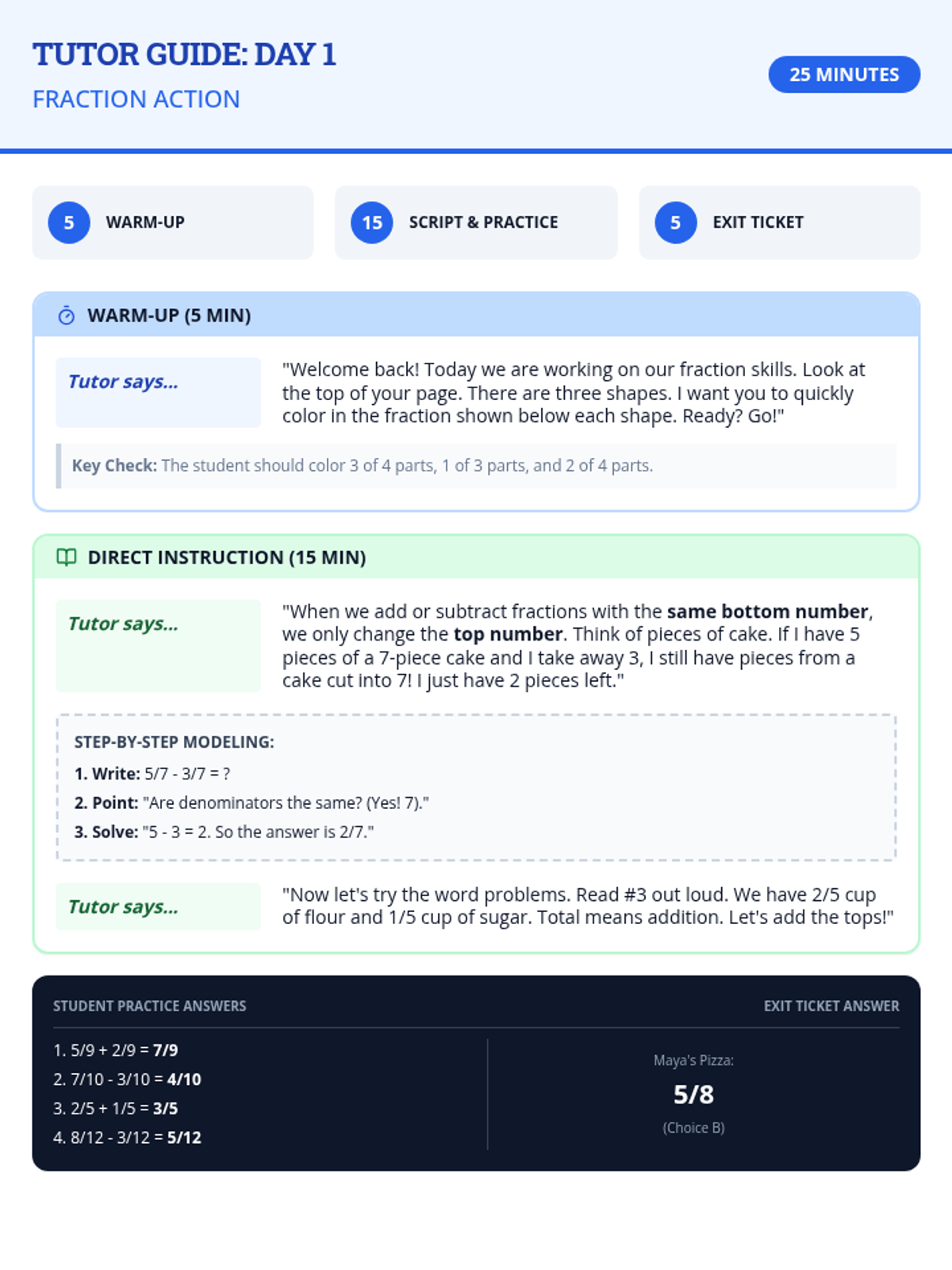 Focuses on adding and subtracting fractions with like denominators, emphasizing that the denominator represents the size of the piece and remains constant.