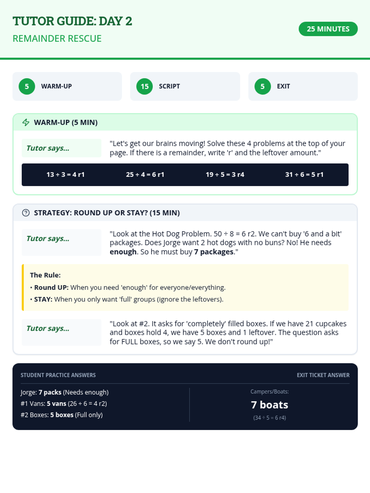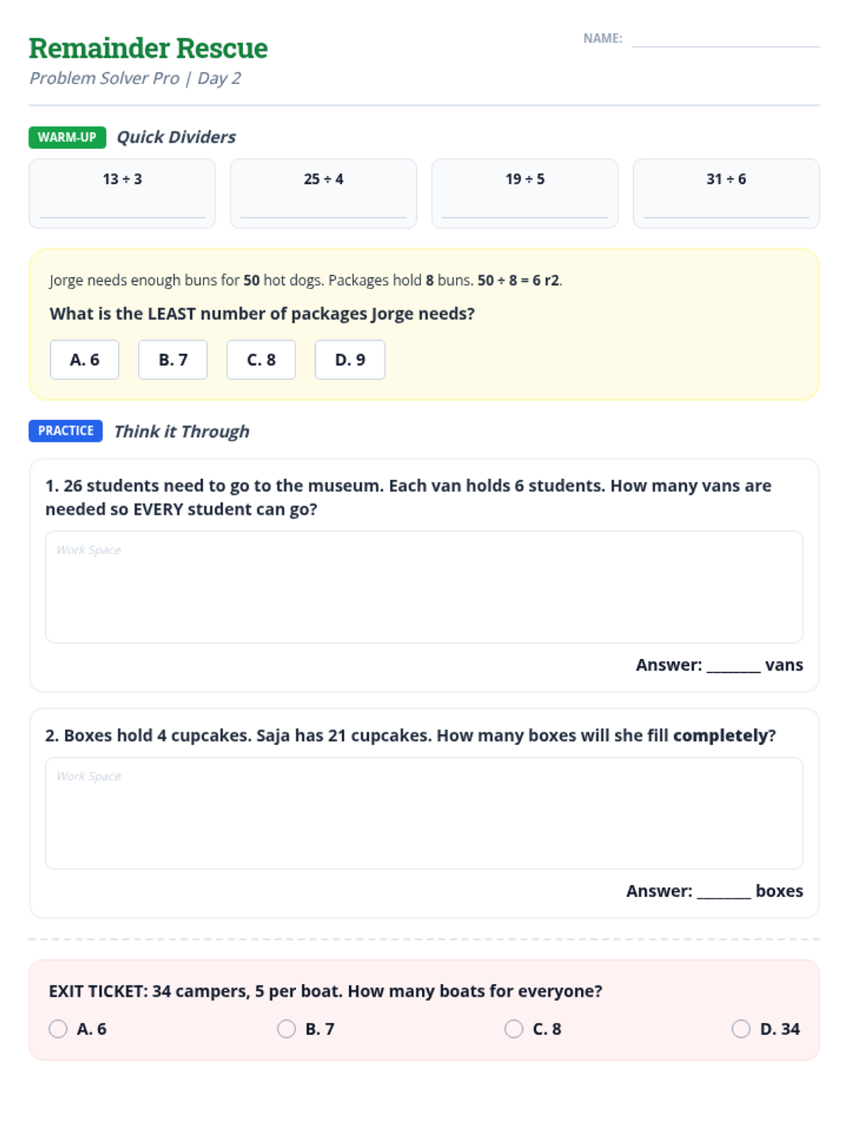 Teaches students how to interpret remainders in real-world division problems, specifically deciding when to 'round up' to ensure everyone or everything is included.