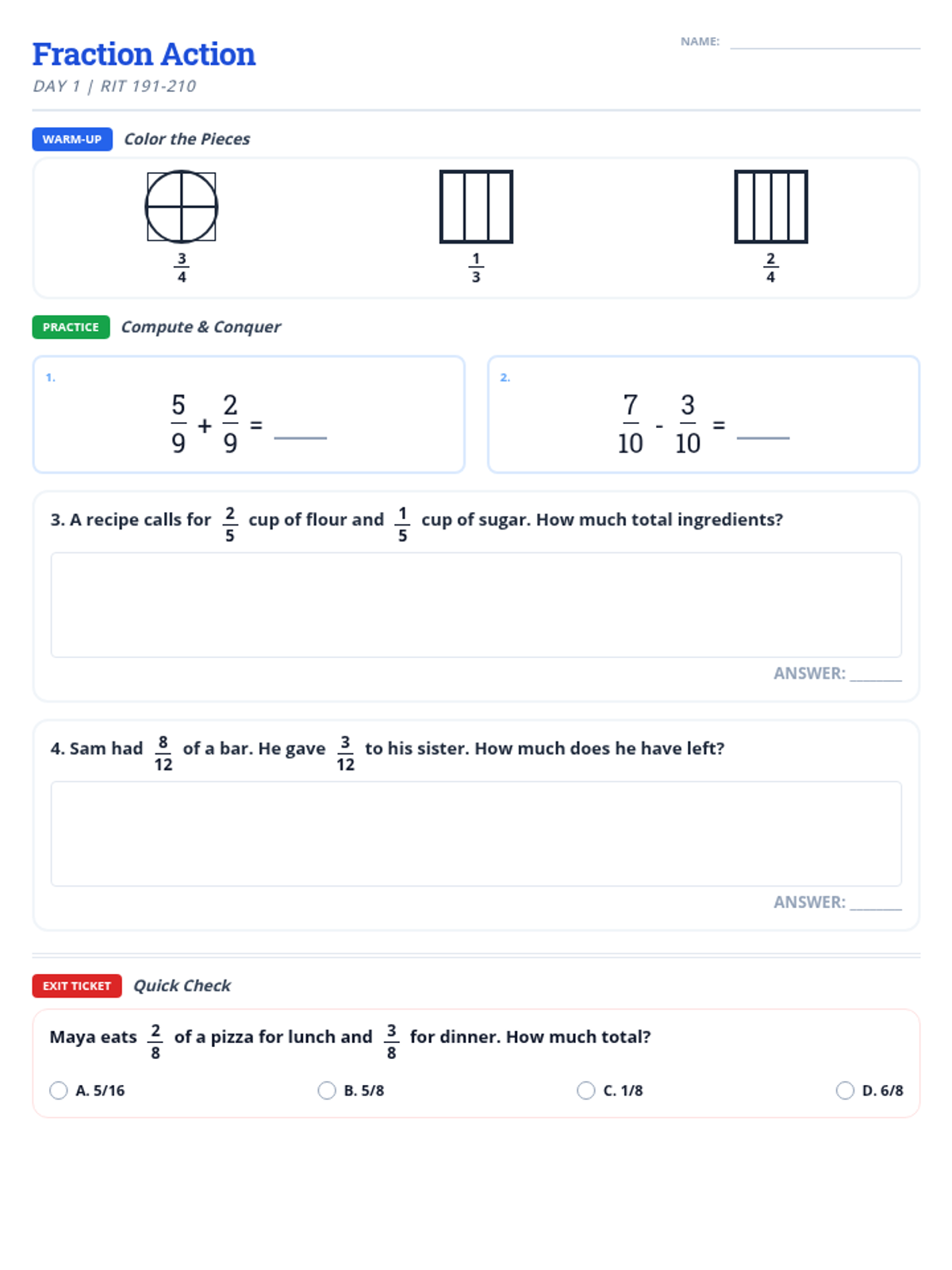 Daily warm-ups and practice for equivalent fractions, whole numbers, and comparisons designed to prepare students for EOG-style questions.