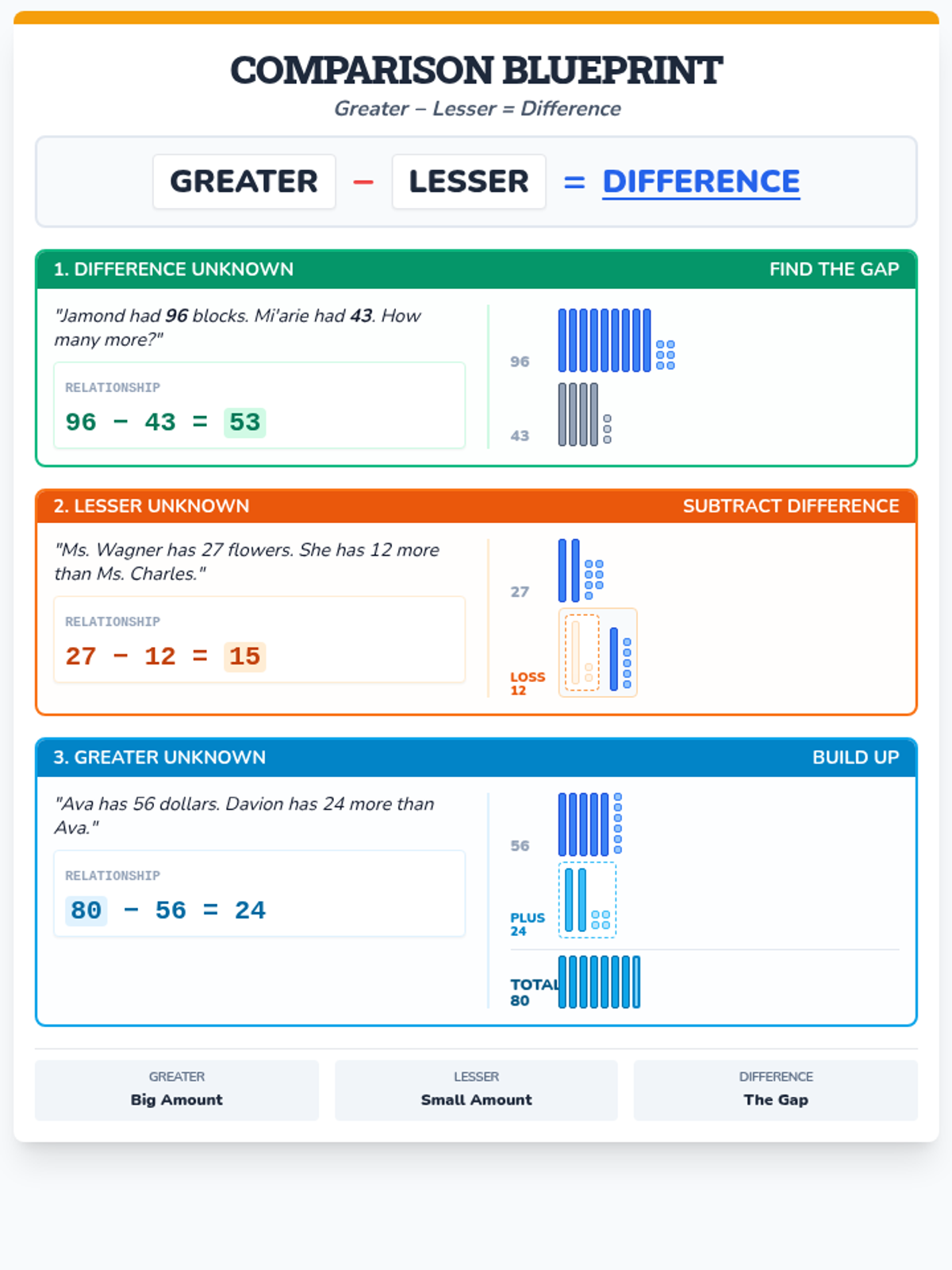 A comprehensive lesson on understanding and solving comparison story problems using the Greater-Lesser-Difference relationship and base ten block visuals.
