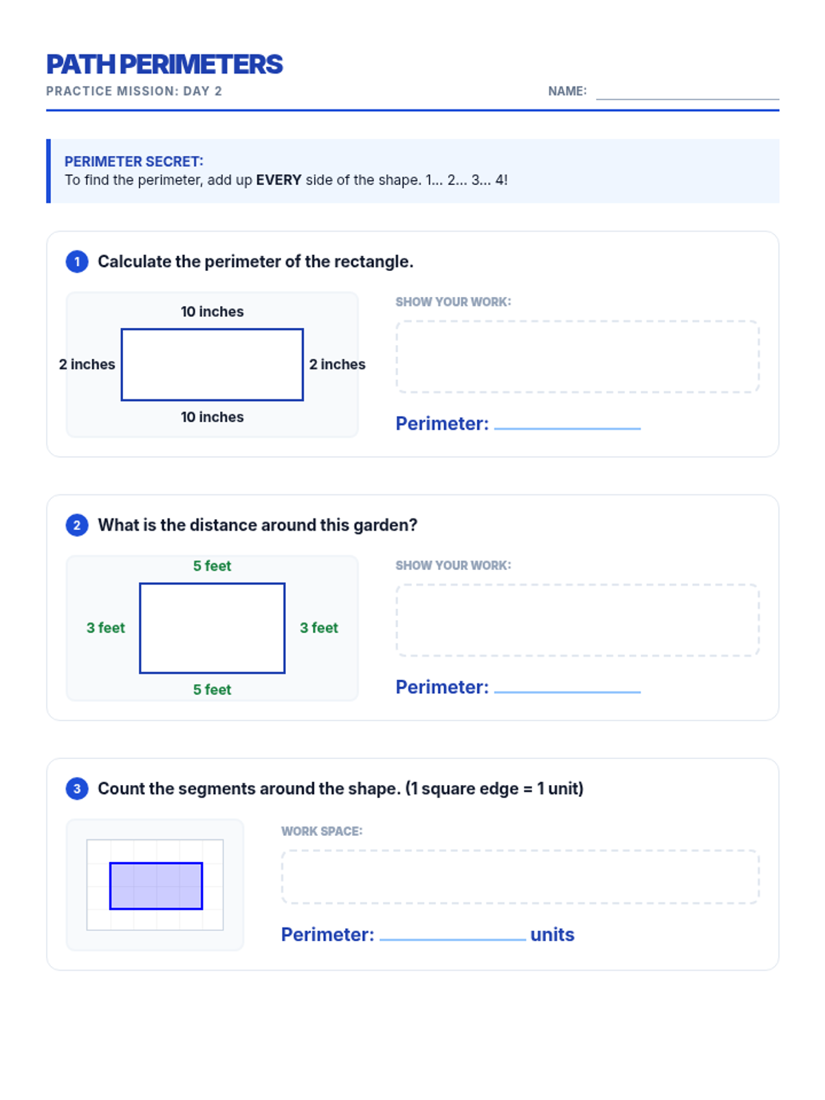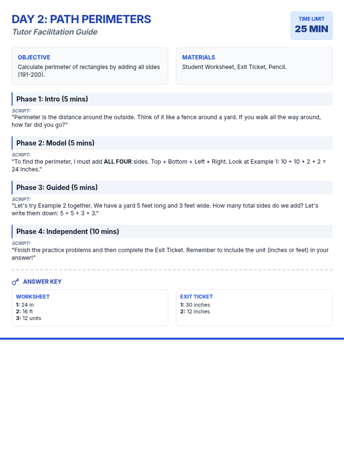 Students transition from basic counting and addition to calculating the perimeter of rectangles (191-200).