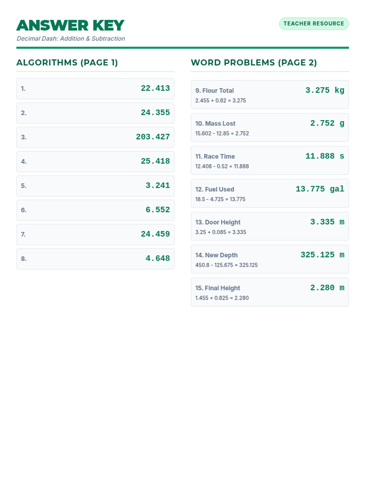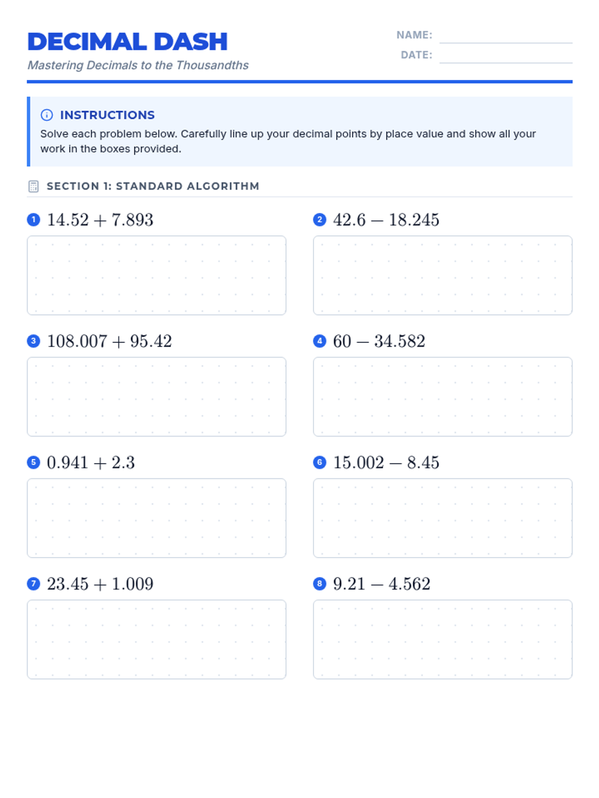A comprehensive lesson on adding and subtracting decimals up to the thousandths place, featuring a mix of computational practice and diverse real-world word problems.