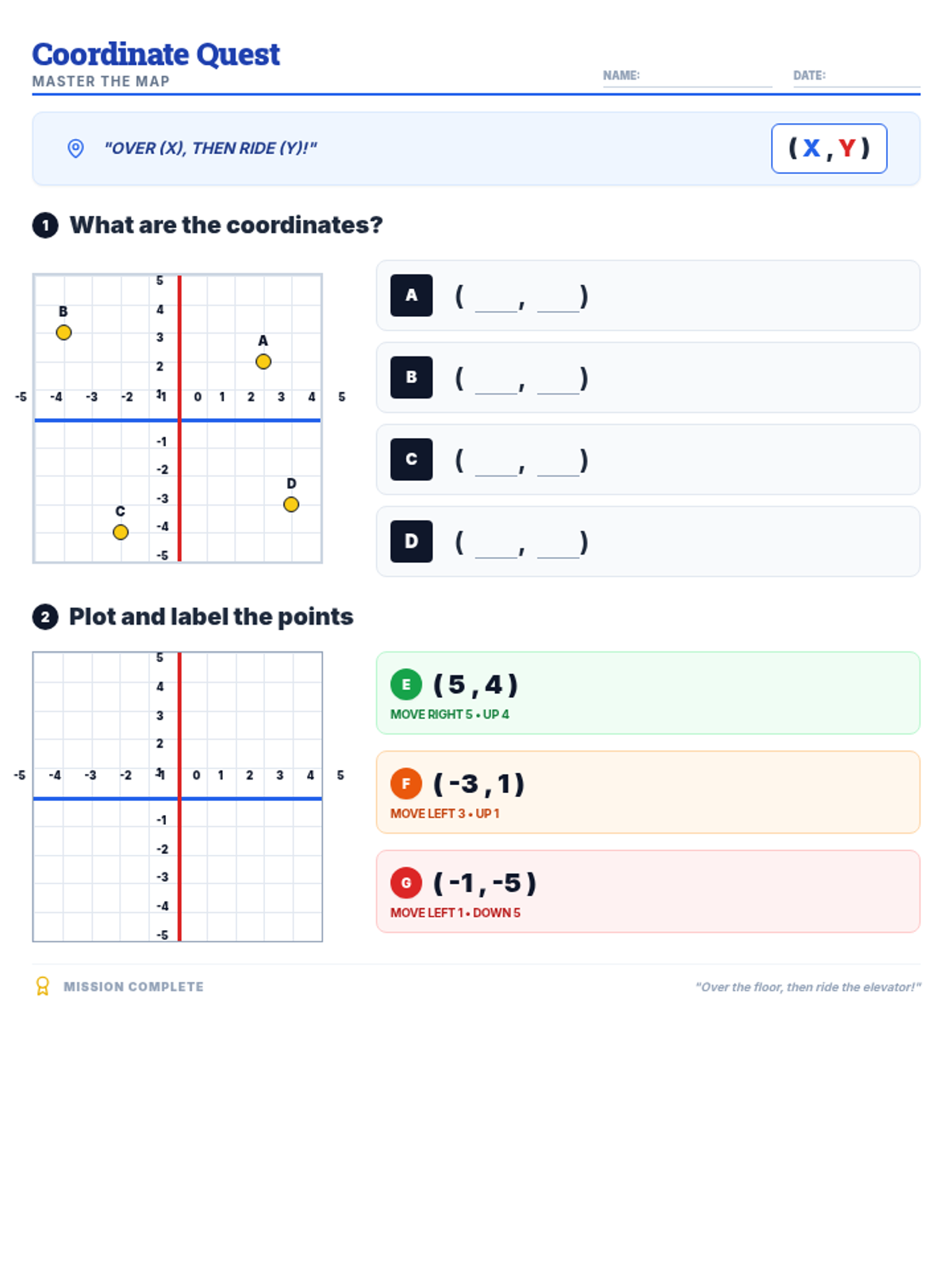 Introduces and reinforces the use of coordinate planes, focusing on identifying (x, y) coordinates using the 'over then up' strategy.