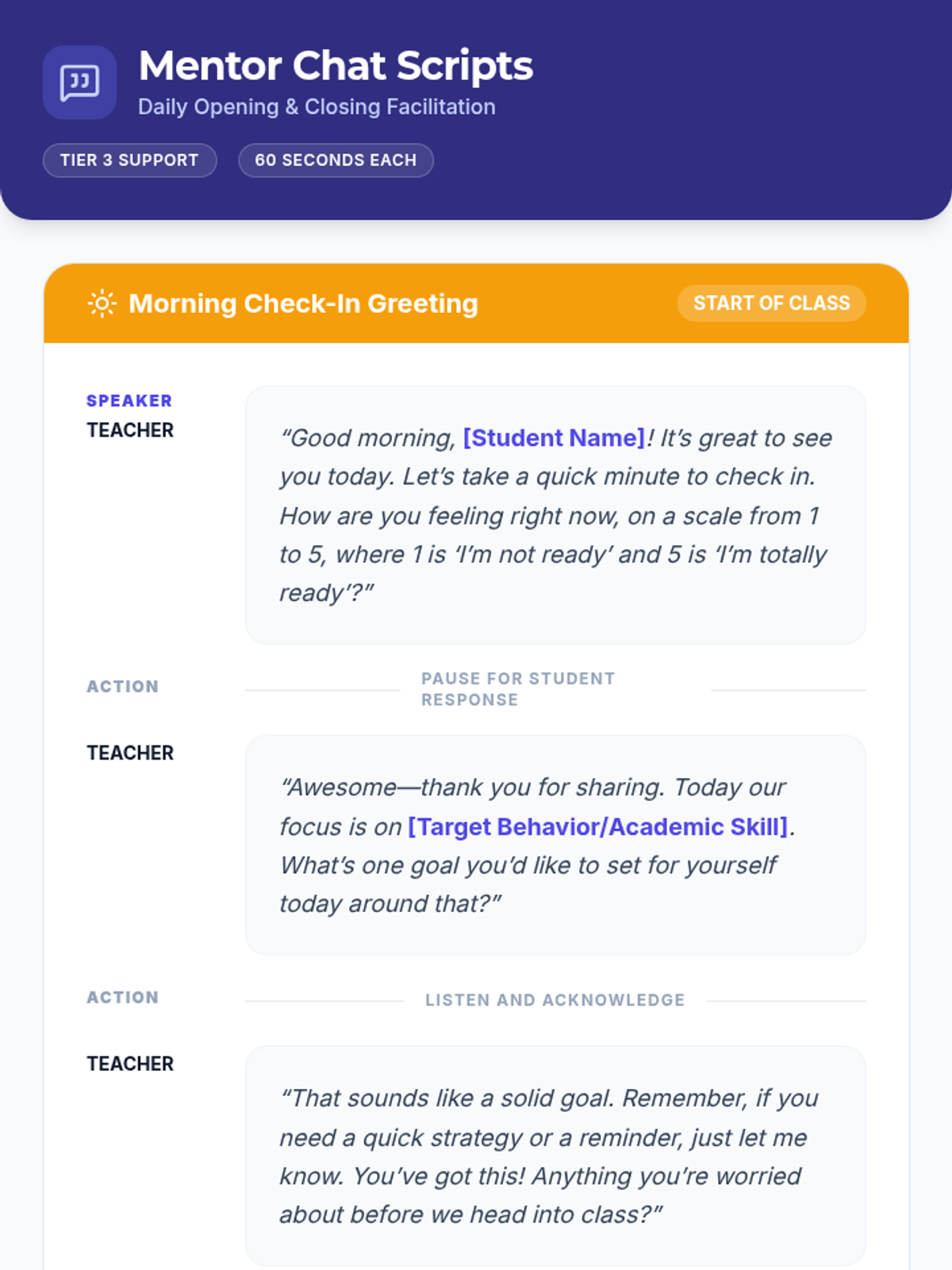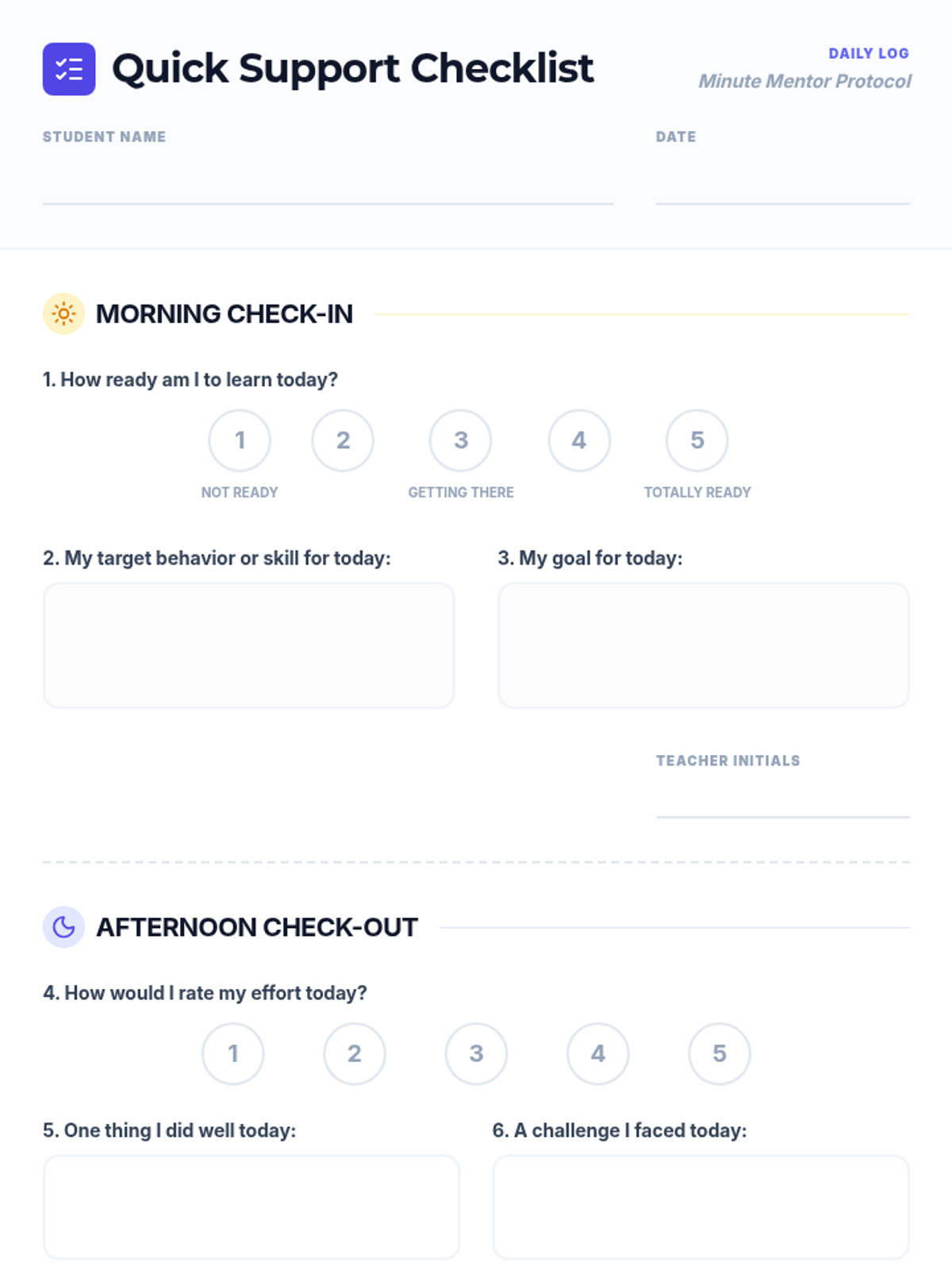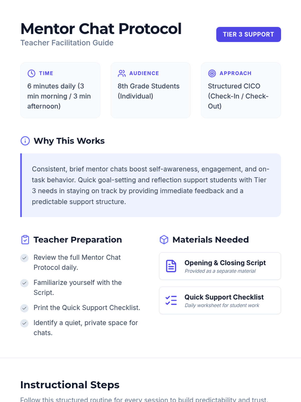 A structured, daily 6-minute Check-In/Check-Out protocol designed for Tier 3 8th-grade student support, focusing on goal-setting, self-monitoring, and positive reinforcement.