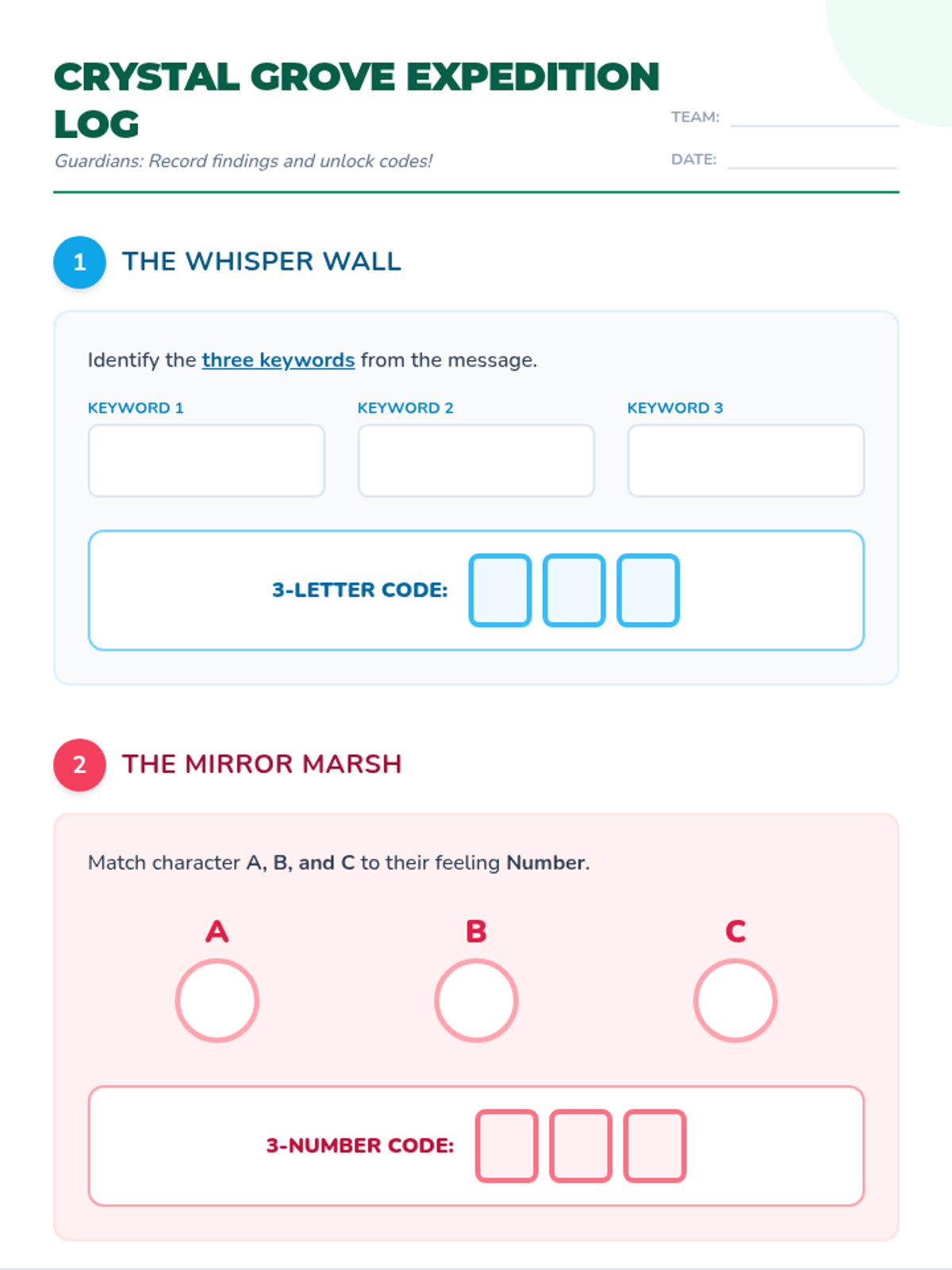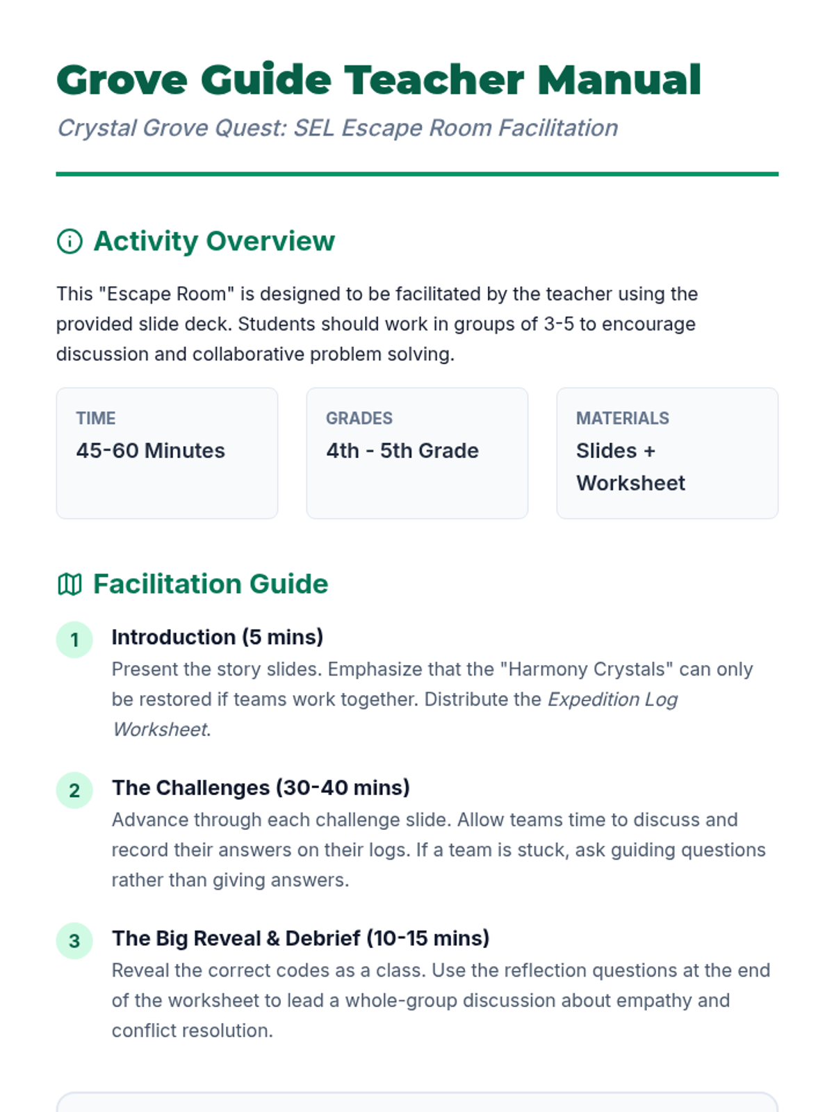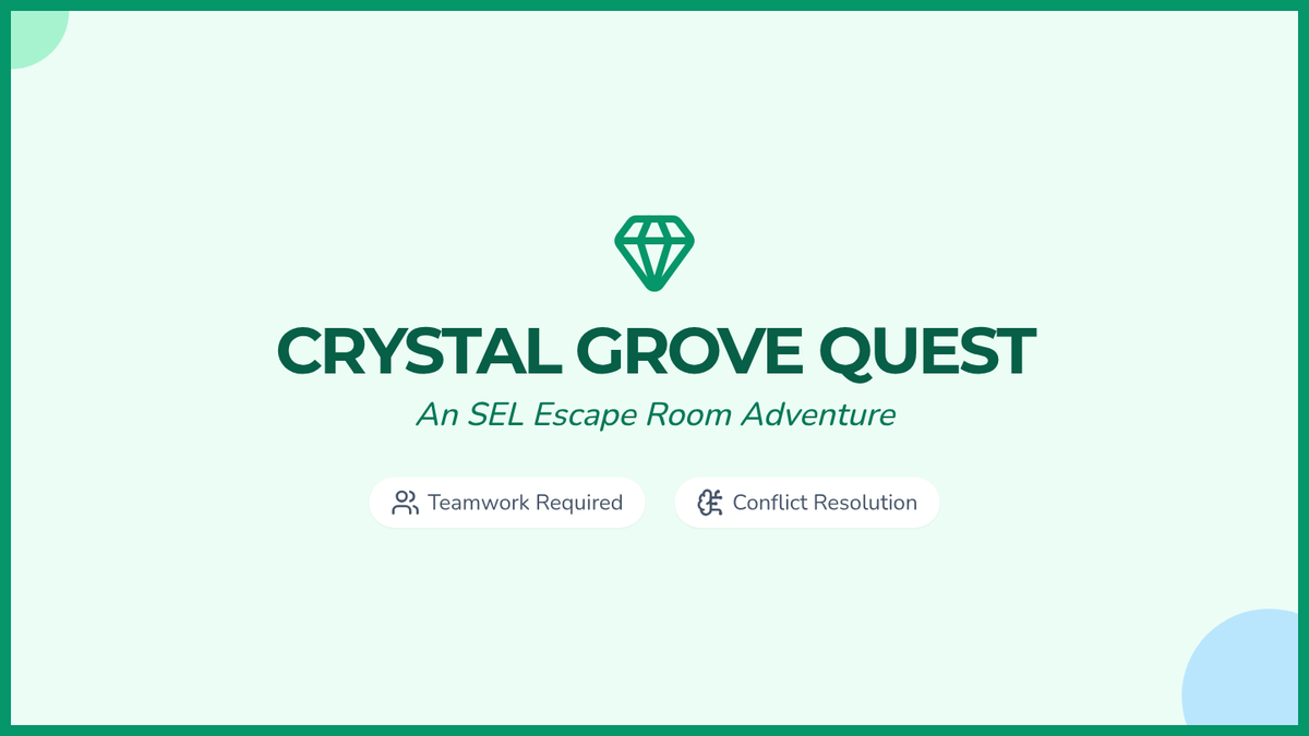 An SEL escape room experience where students work together to solve puzzles based on active listening, empathy, and conflict resolution to save a magical grove.