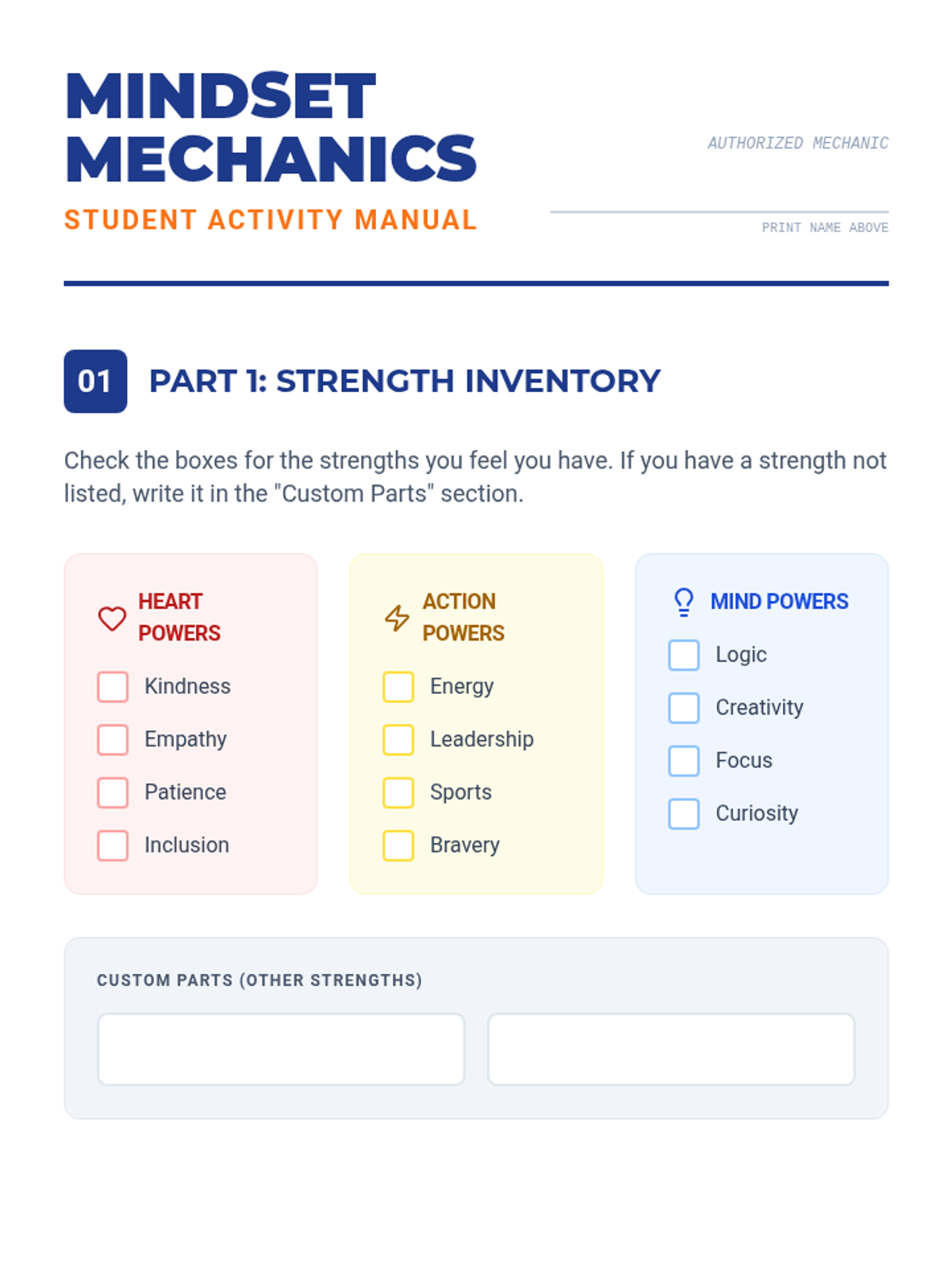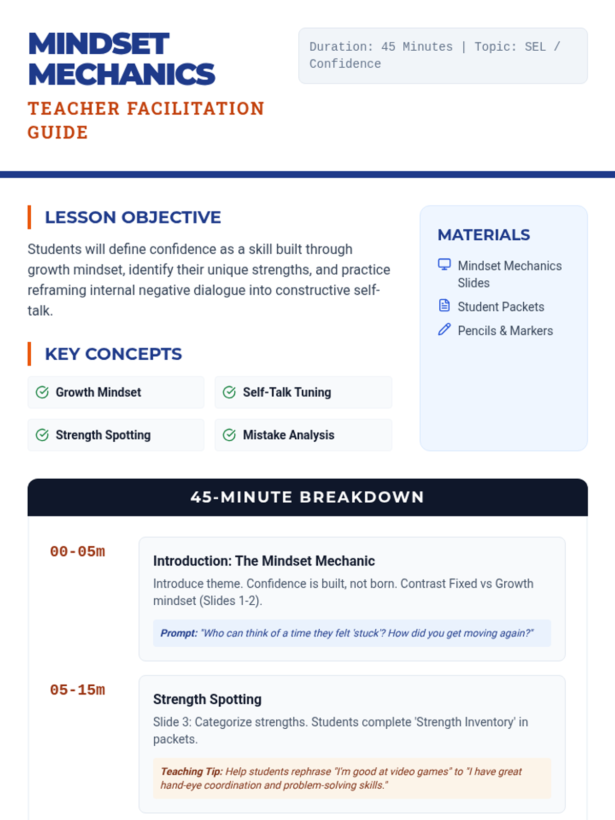 A comprehensive SEL lesson focused on building confidence through growth mindset, identifying personal strengths, reframing mistakes, and practicing positive self-talk. Students act as 'Mindset Mechanics' to tune up their internal dialogue and build a resilient self-image.