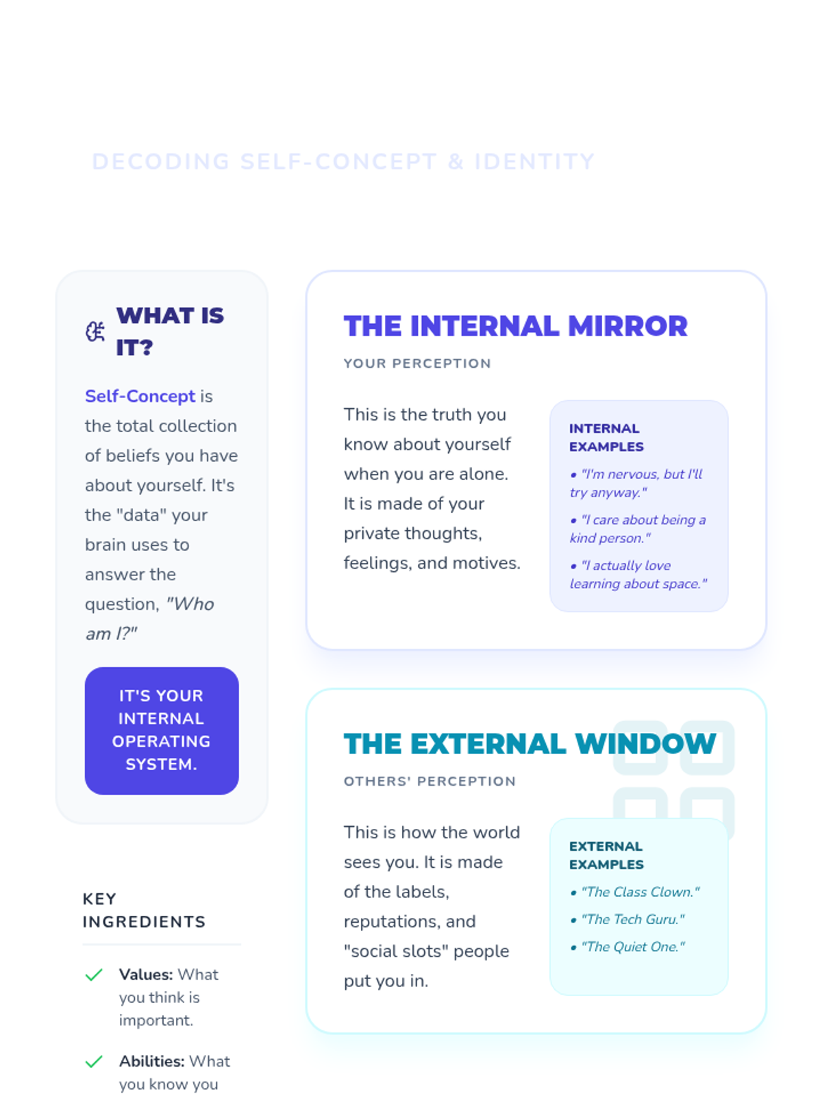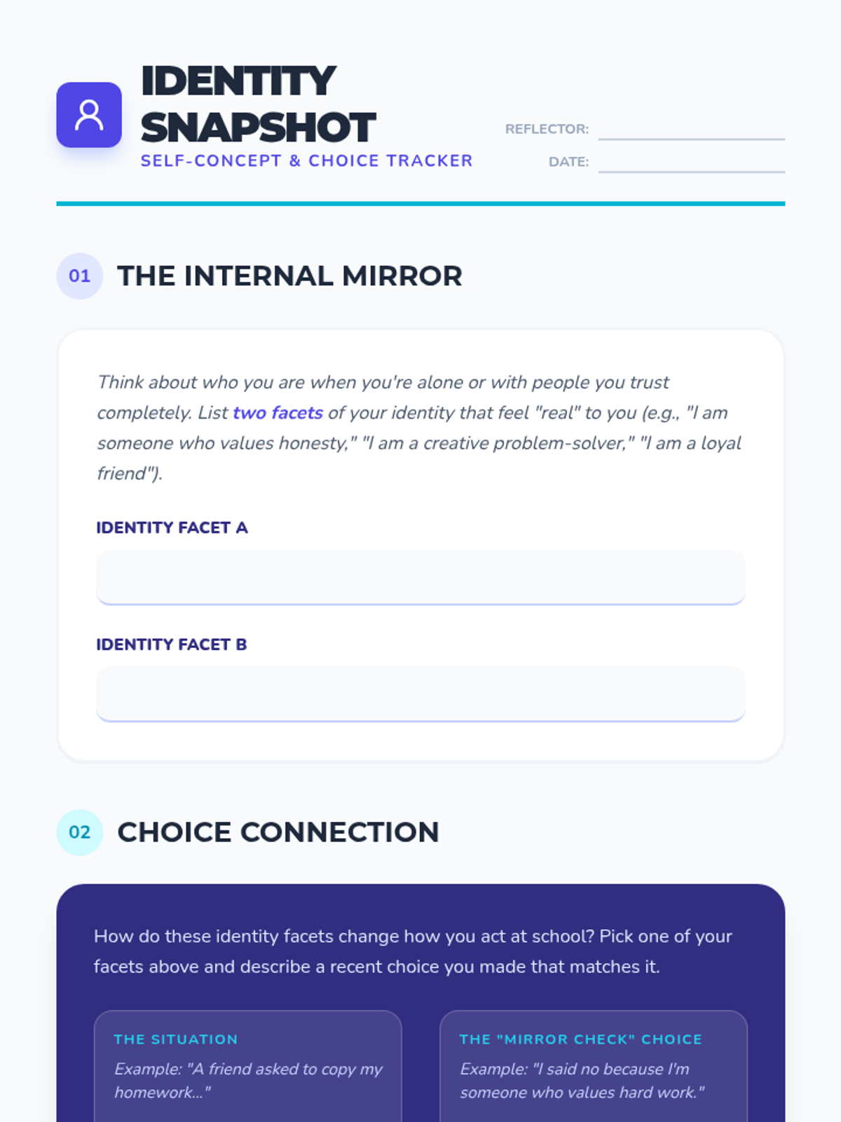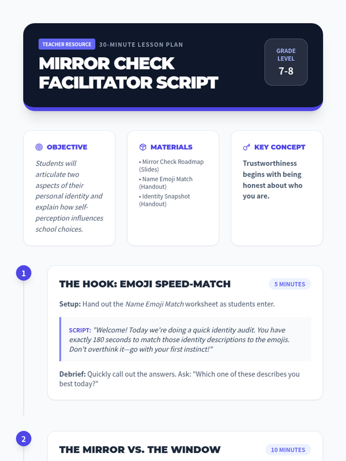 A 30-minute middle school lesson focused on self-concept and identity. Students explore how their internal perception of themselves influences their external choices and builds a foundation for personal trustworthiness.