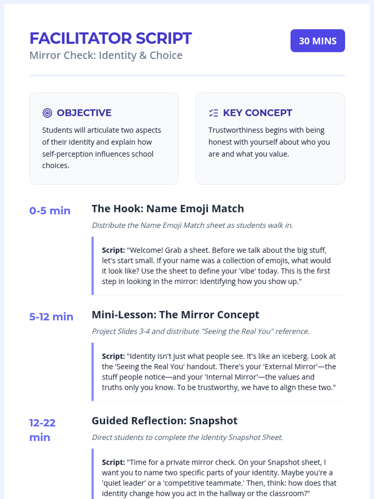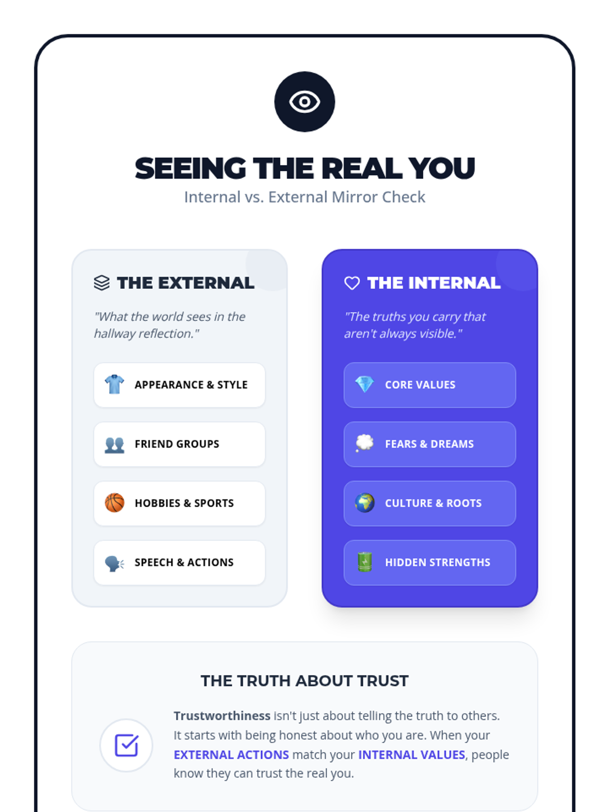 A 30-minute social-emotional learning lesson for middle schoolers to explore personal identity, self-perception, and how internal honesty builds trustworthiness.