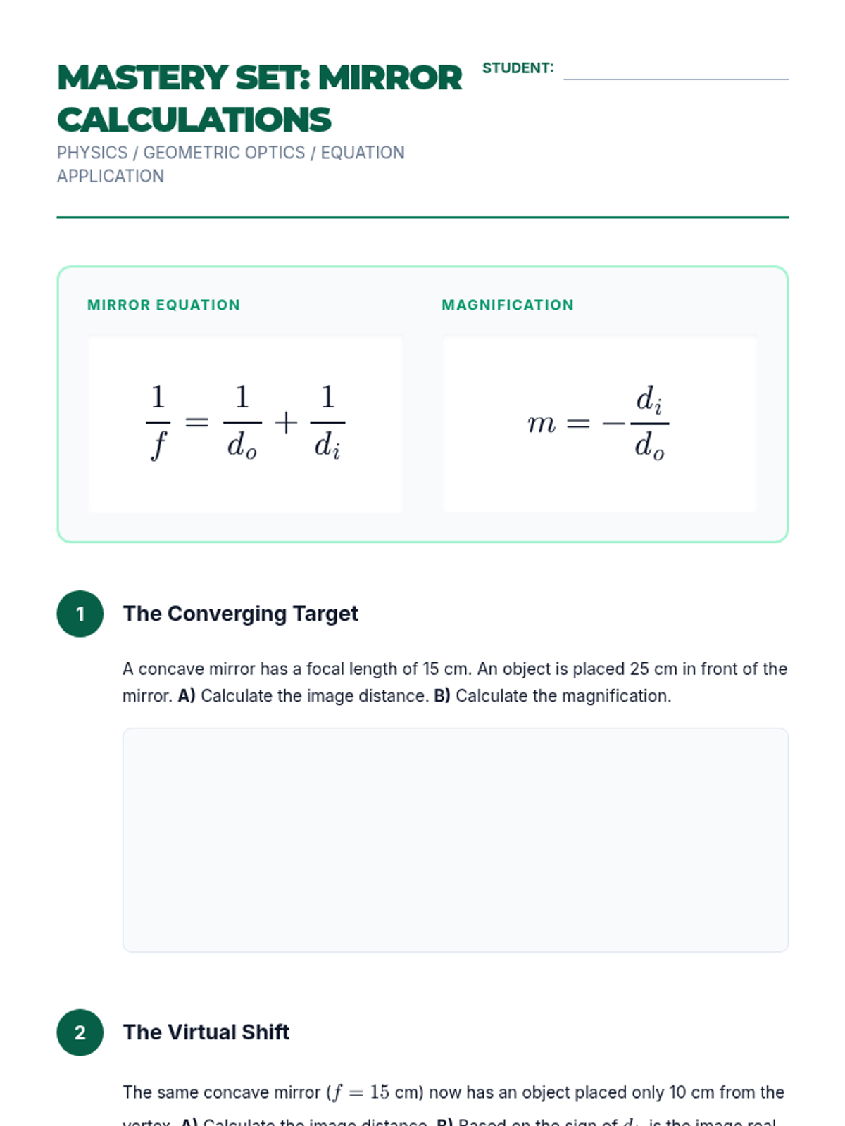 Students master the mirror equation and magnification formula, using sign conventions to algebraically predict image characteristics.