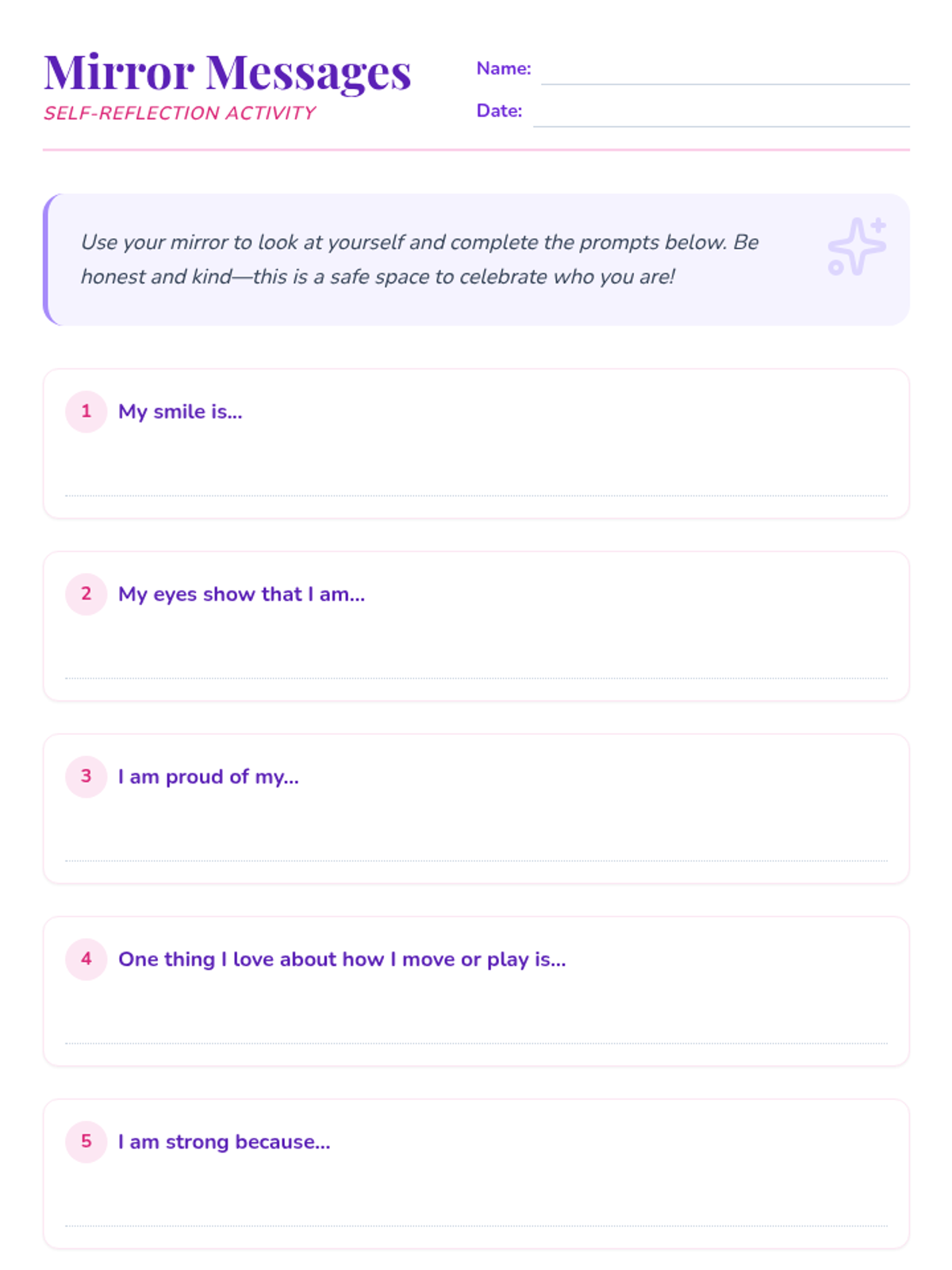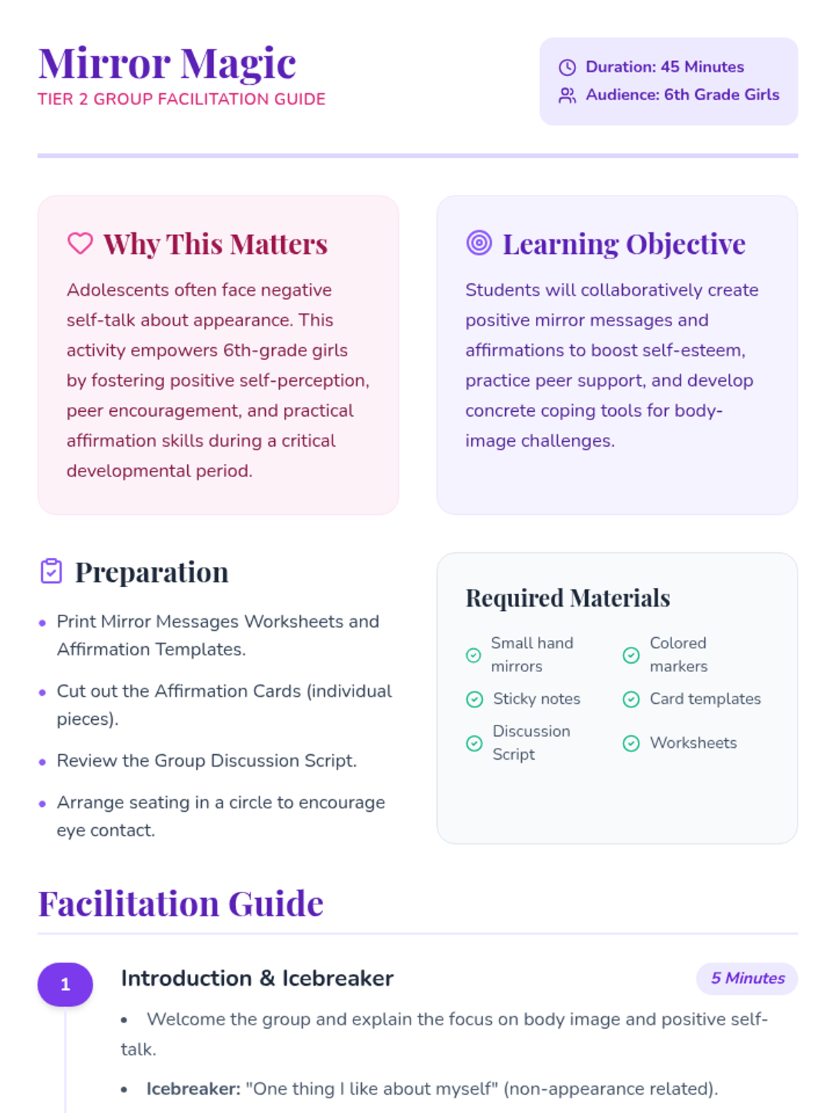 A 45-minute Tier 2 group activity for 6th-grade girls to explore body image through positive self-talk, affirmations, and peer support. Students create mirror messages and affirmation cards to build self-esteem and coping tools.