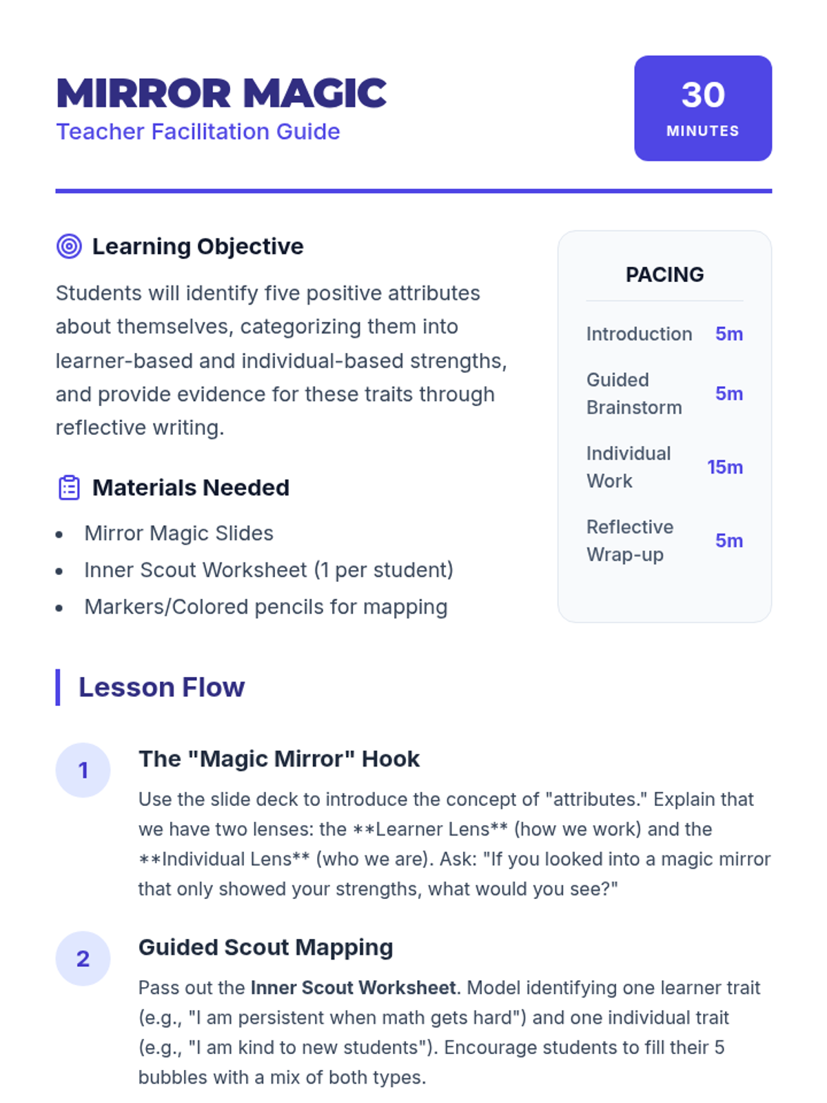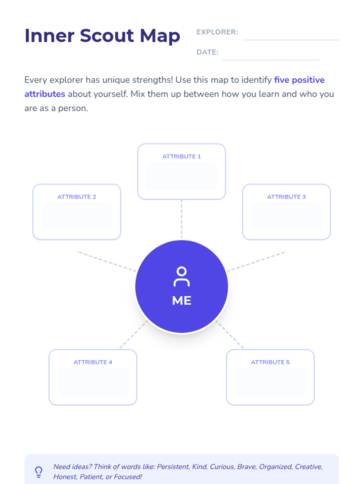 A focused self-discovery lesson helping students identify five positive attributes about themselves as learners and individuals through guided reflection and structured writing.