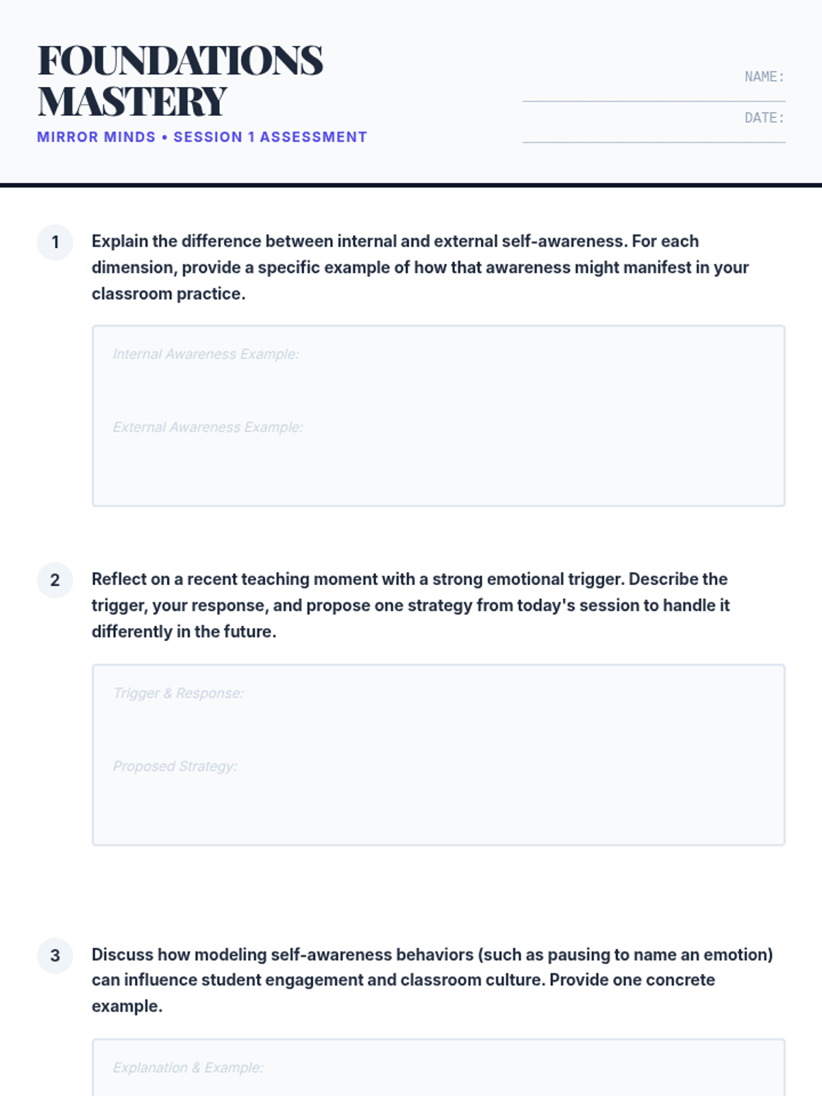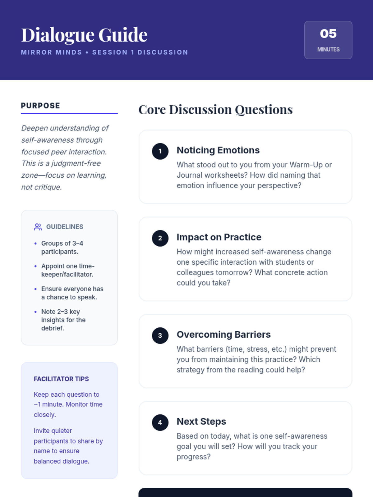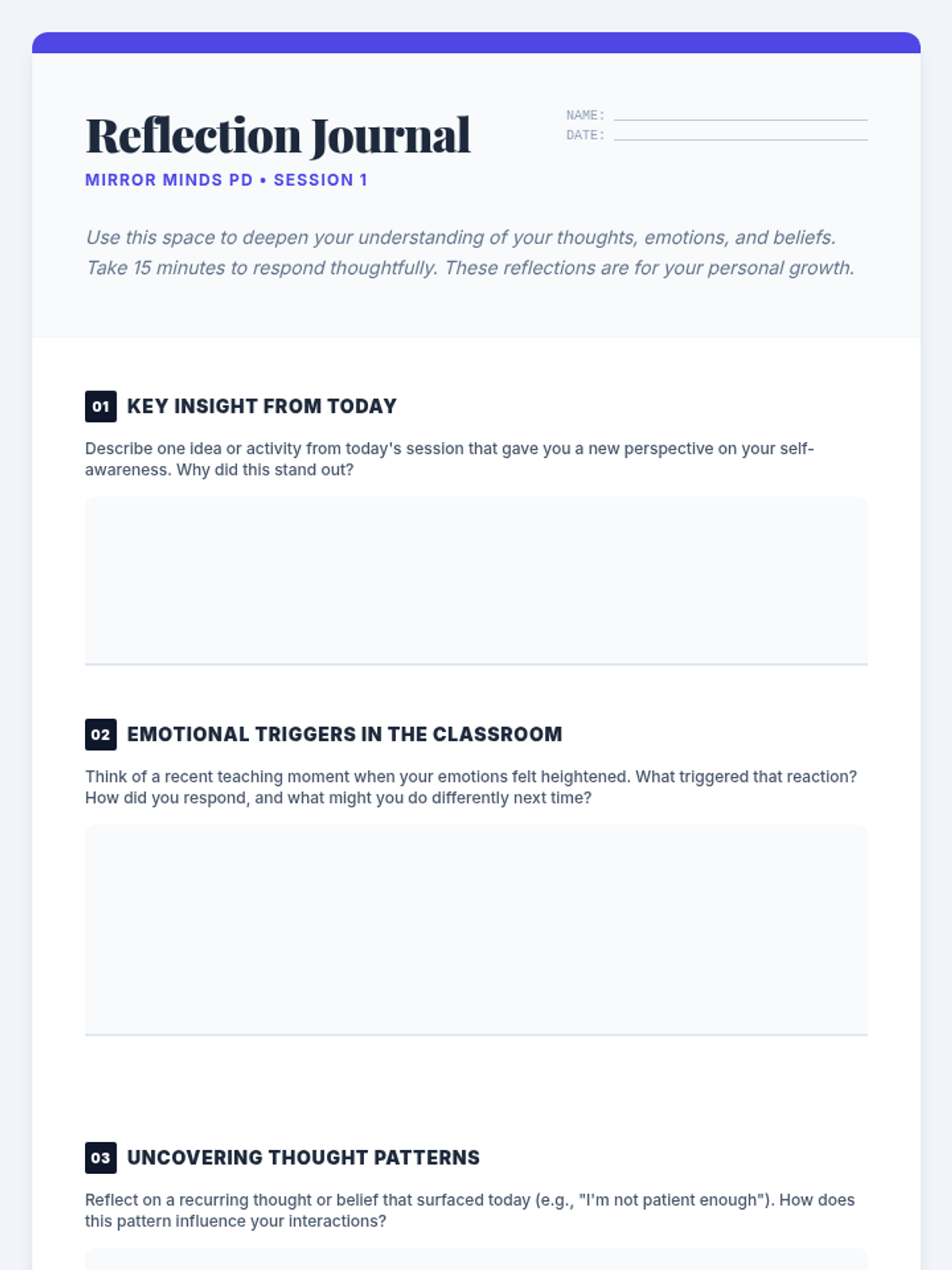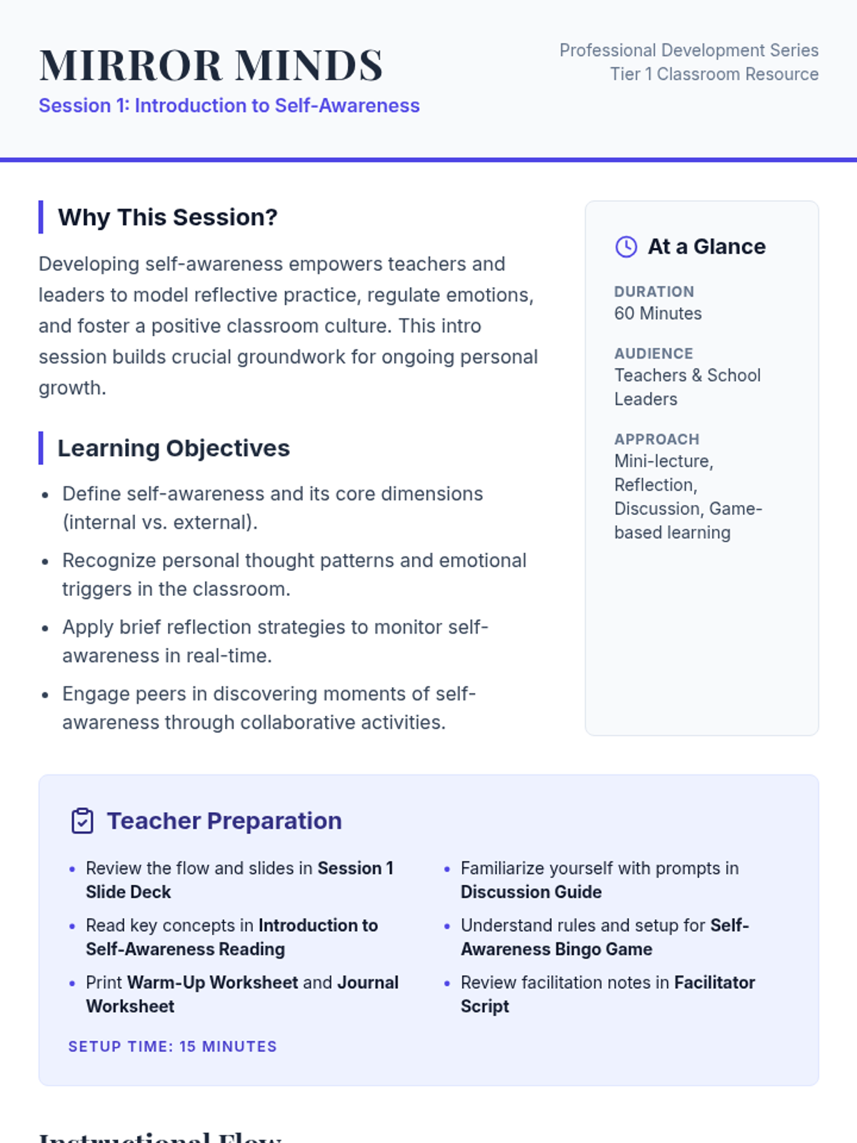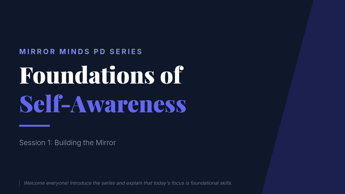 This professional development session introduces educators to the concept of self-awareness, exploring personal thoughts, emotions, and triggers through interactive reflections and group activities. it serves as the foundation for the Mirror Minds five-session series.