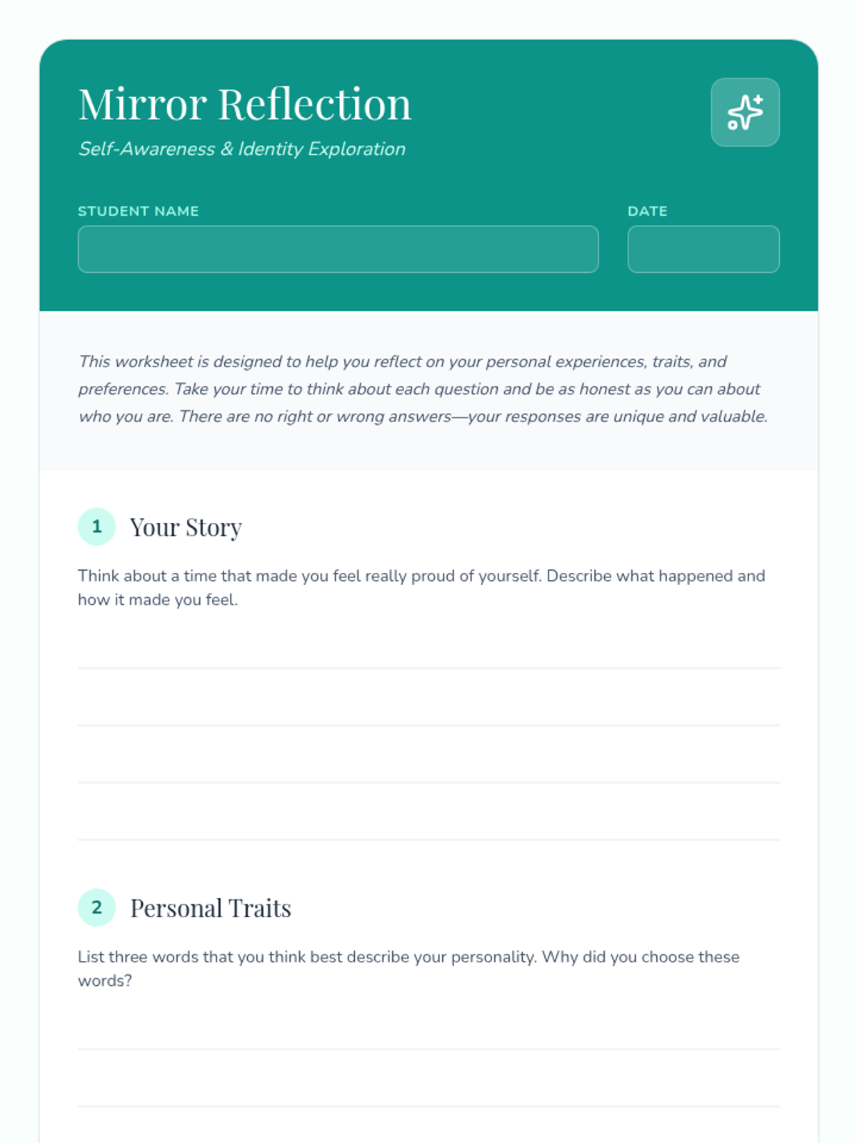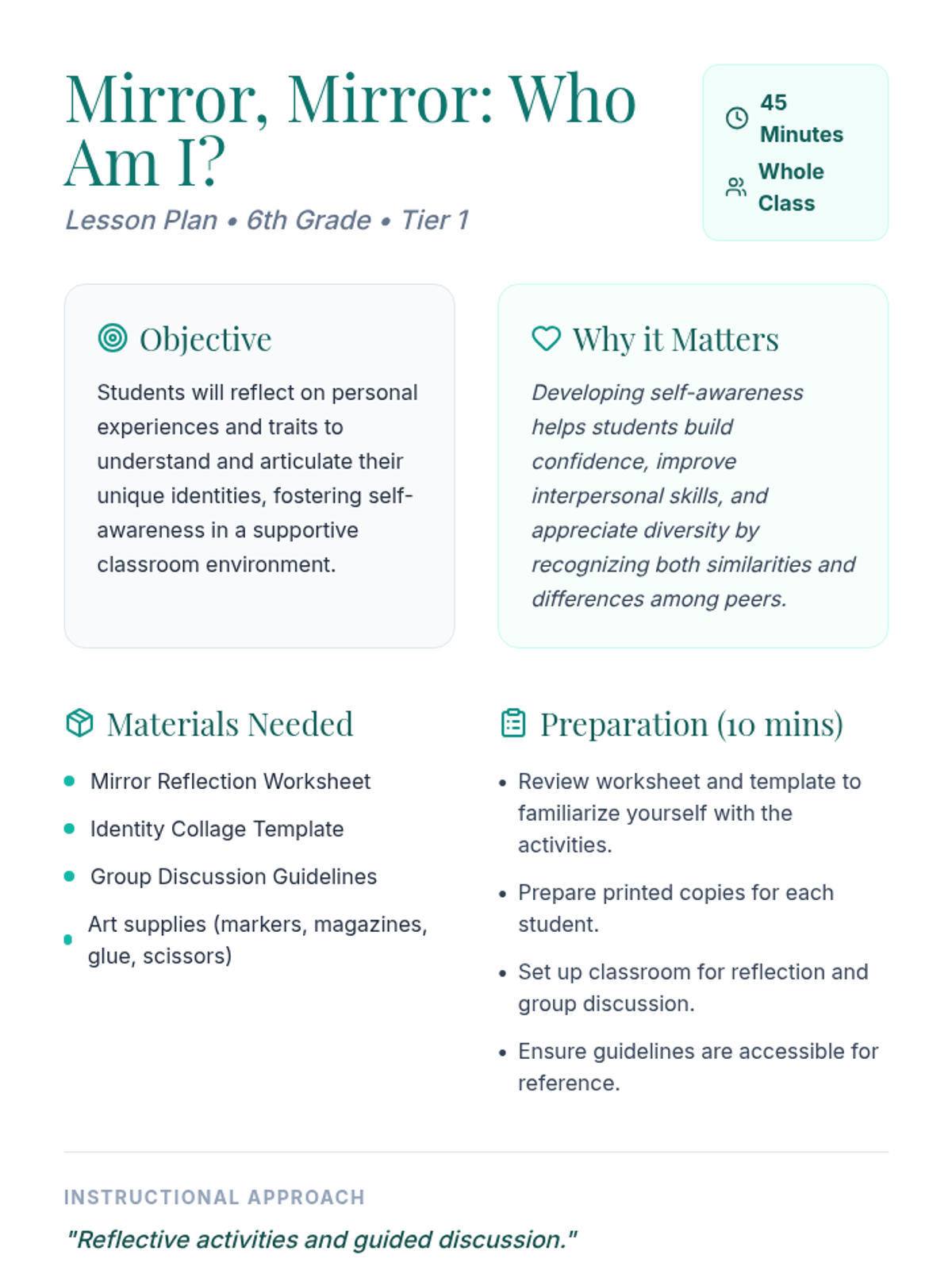 A 45-minute Tier 1 lesson for 6th graders to explore personal identity through reflection, creativity, and group discussion. Students will identify unique traits and build self-awareness in a supportive environment.