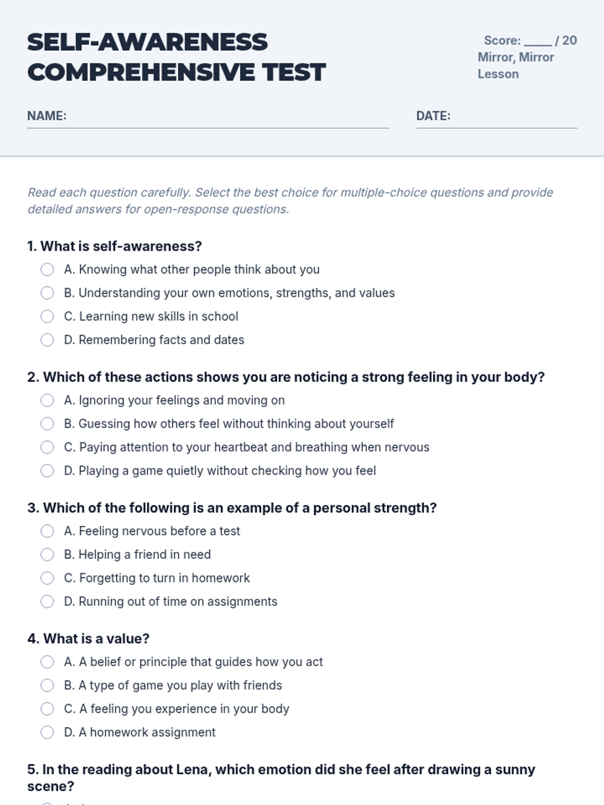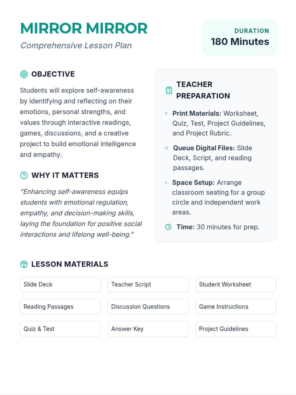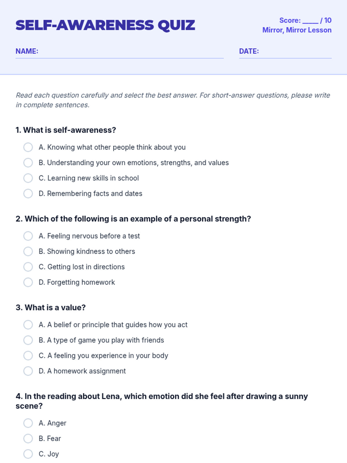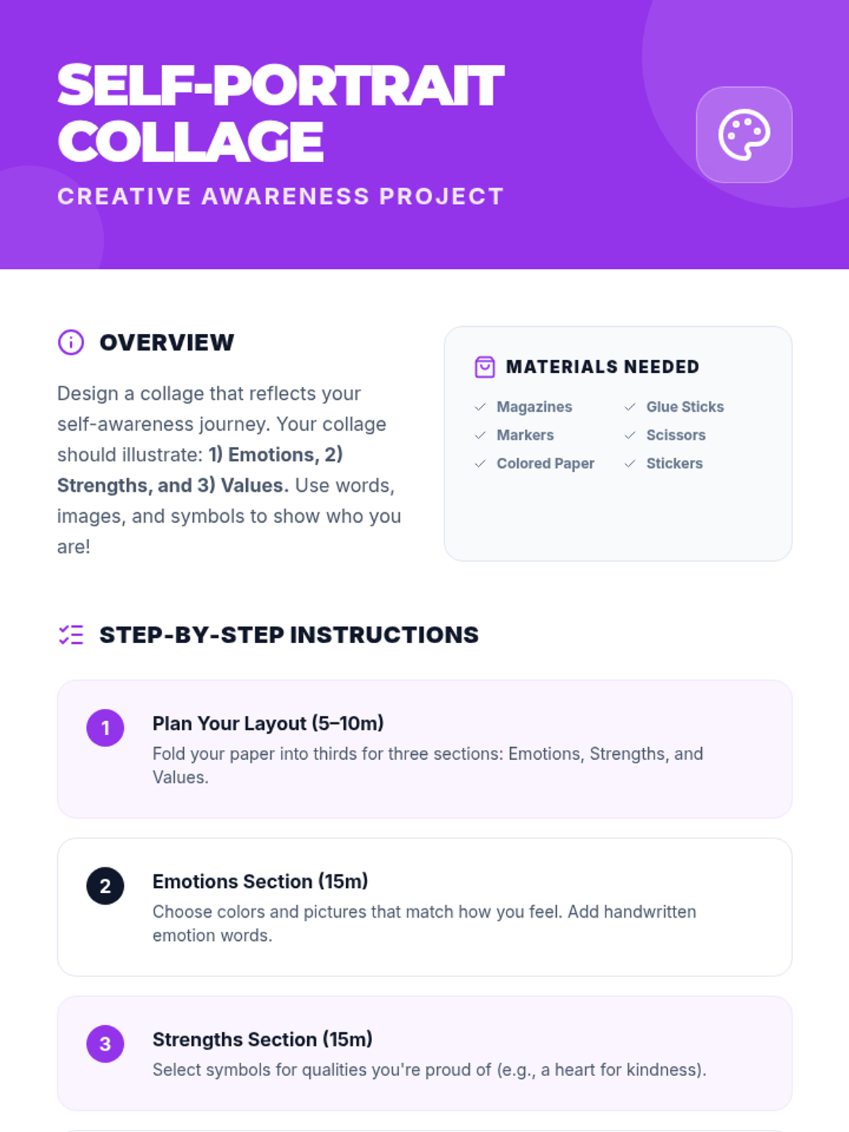 A 3-hour elementary lesson exploring self-awareness through interactive activities, reflections, and a creative collage project. Students will identify their emotions, strengths, and values to build emotional intelligence.