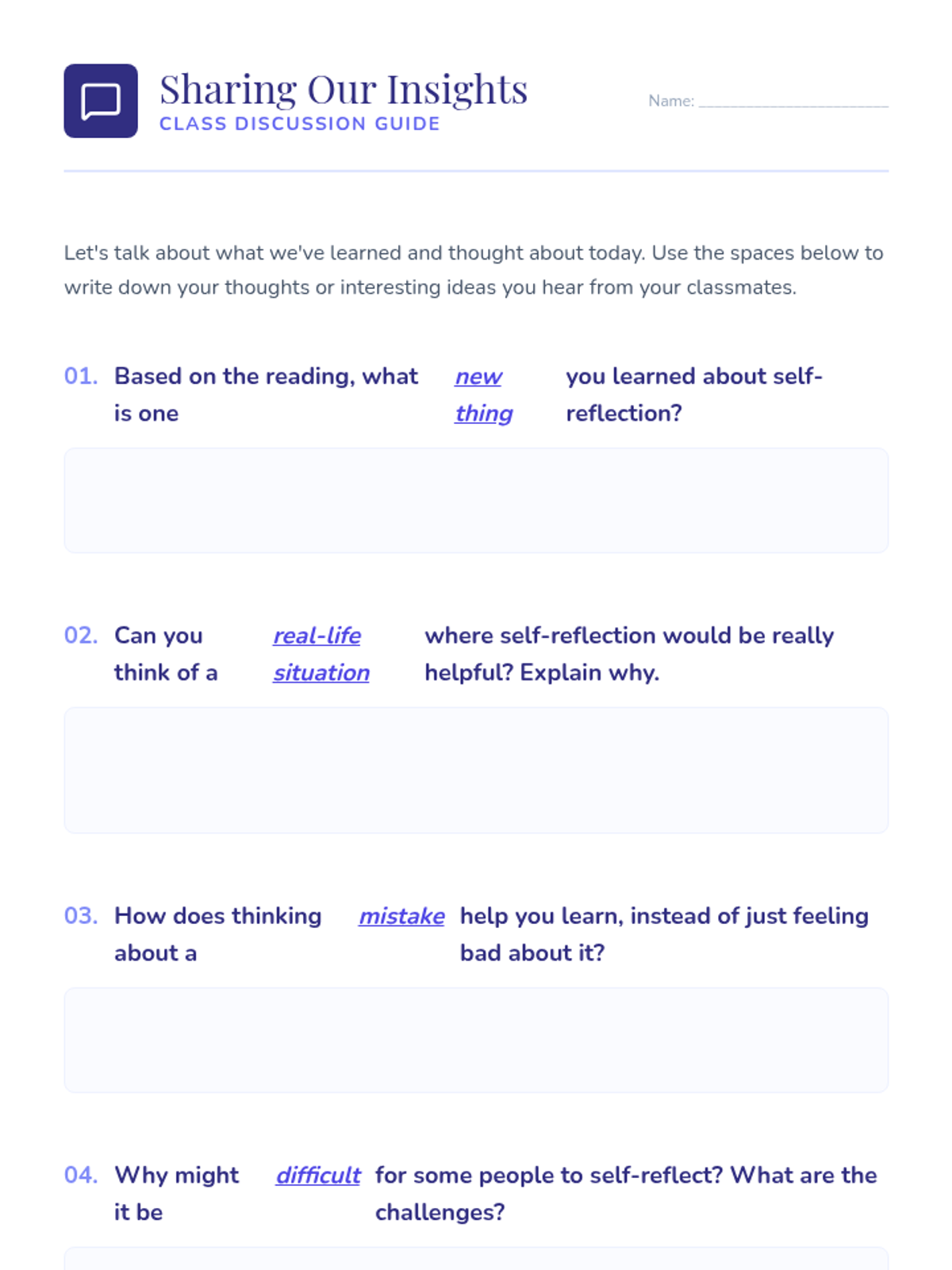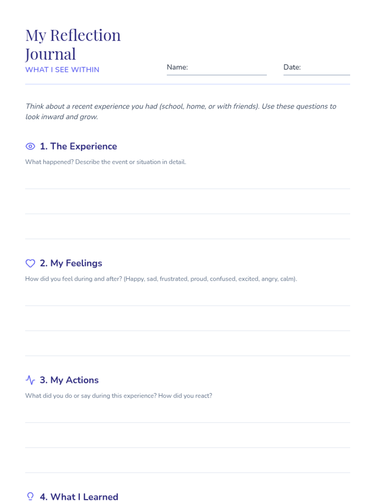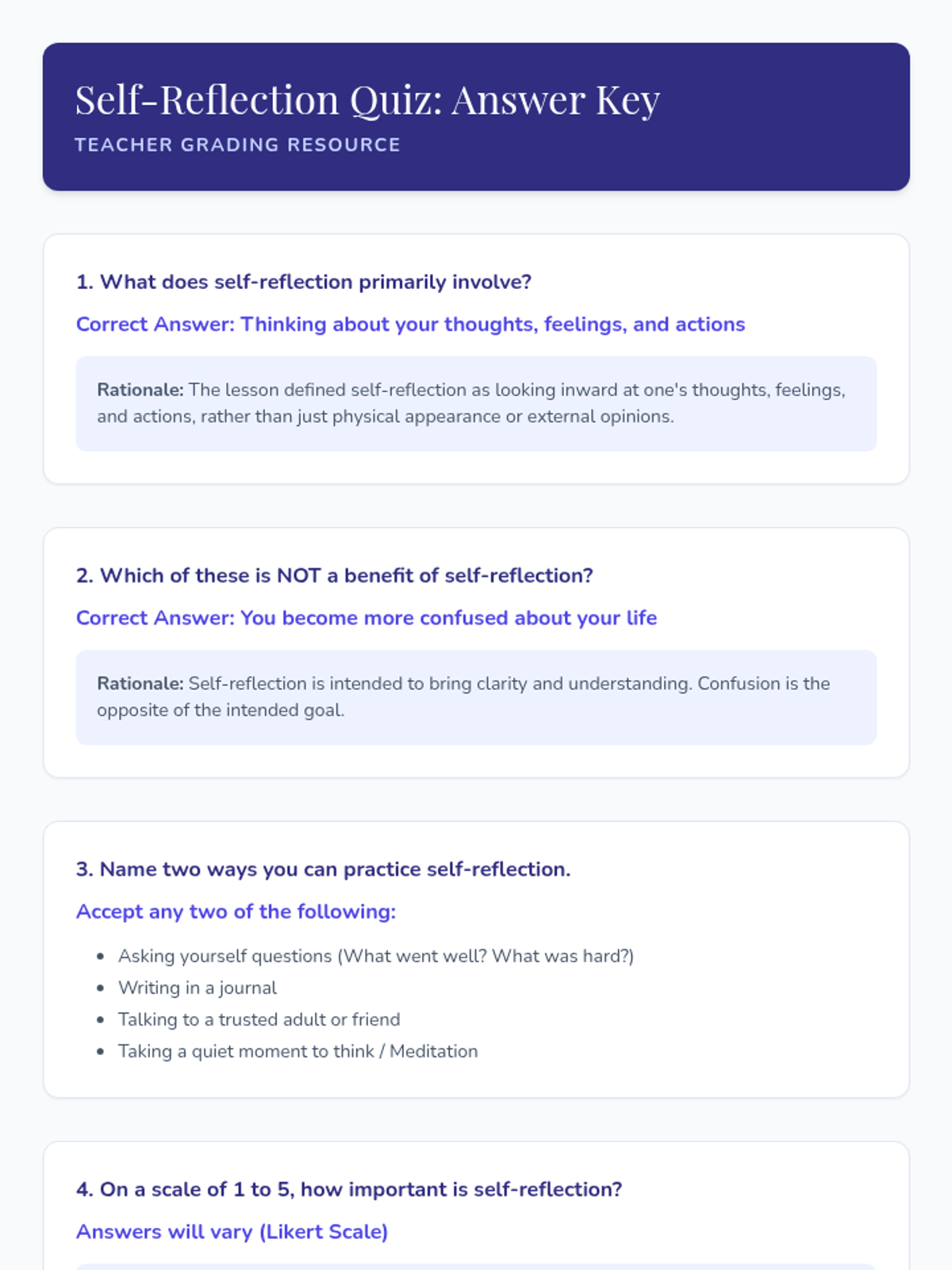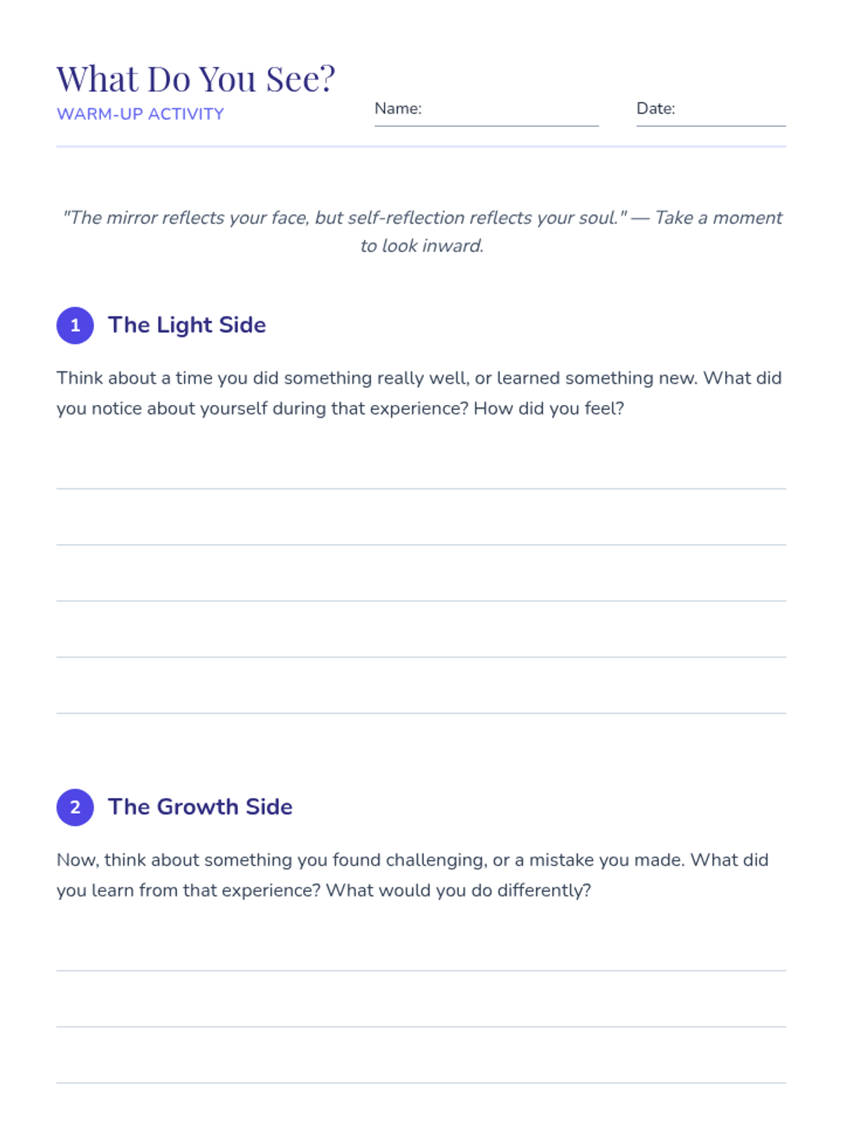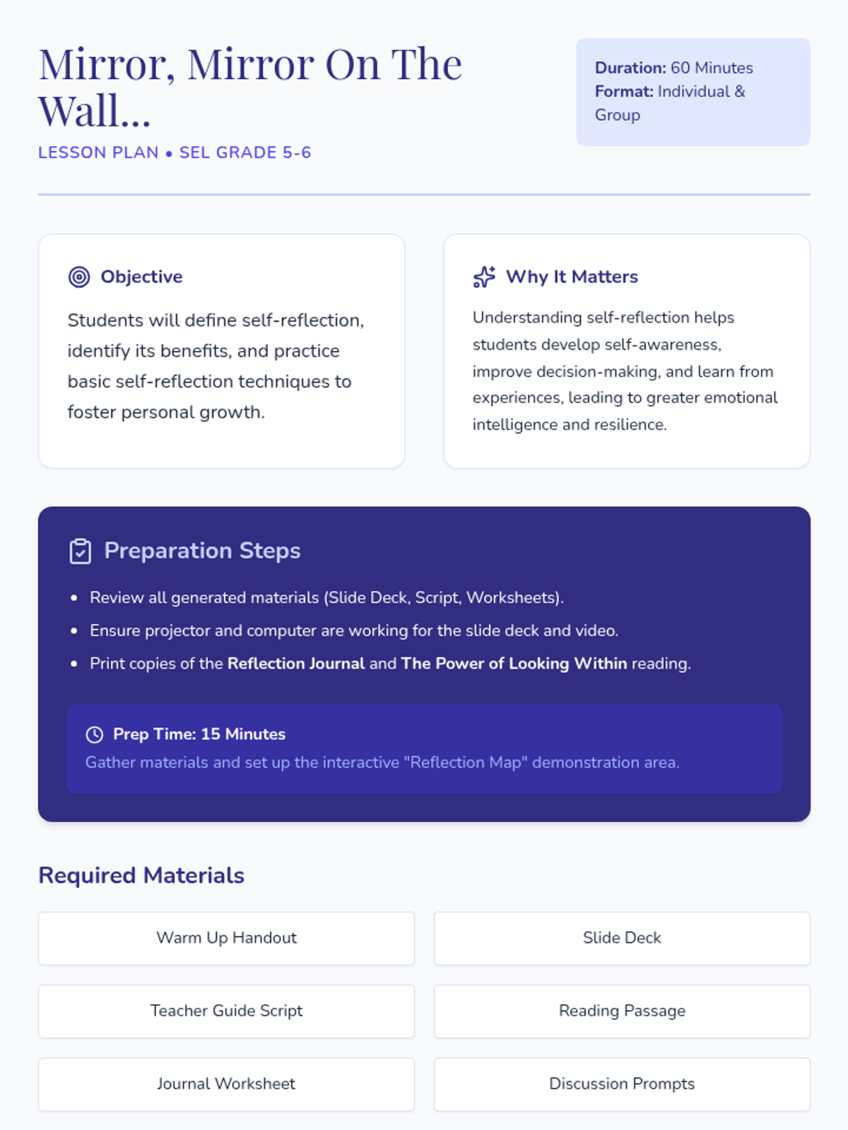 A 60-minute lesson for 5th and 6th graders exploring the power of self-reflection through discussion, video, and creative activities. Students learn to look inward to understand their thoughts, feelings, and actions for personal growth.