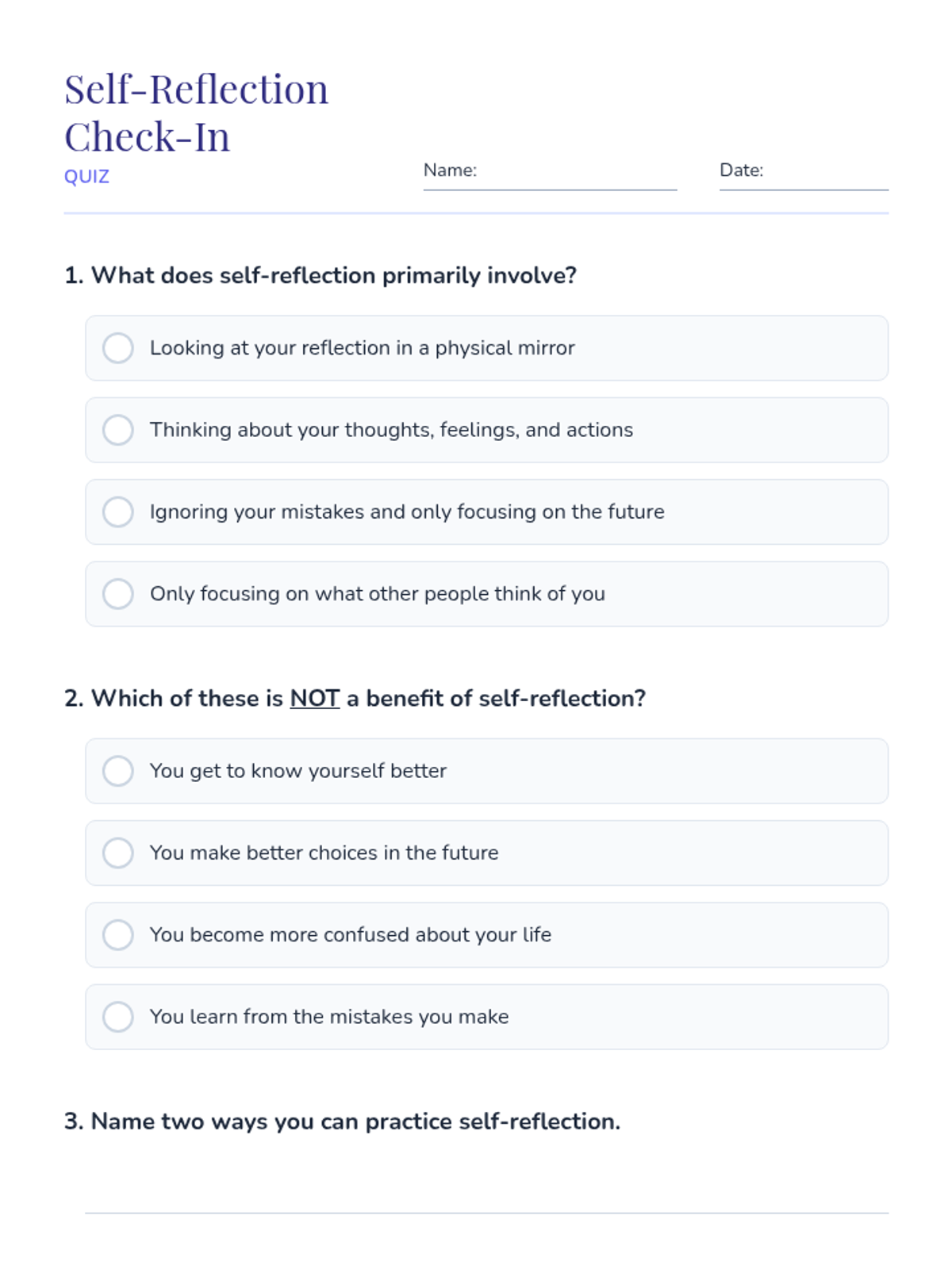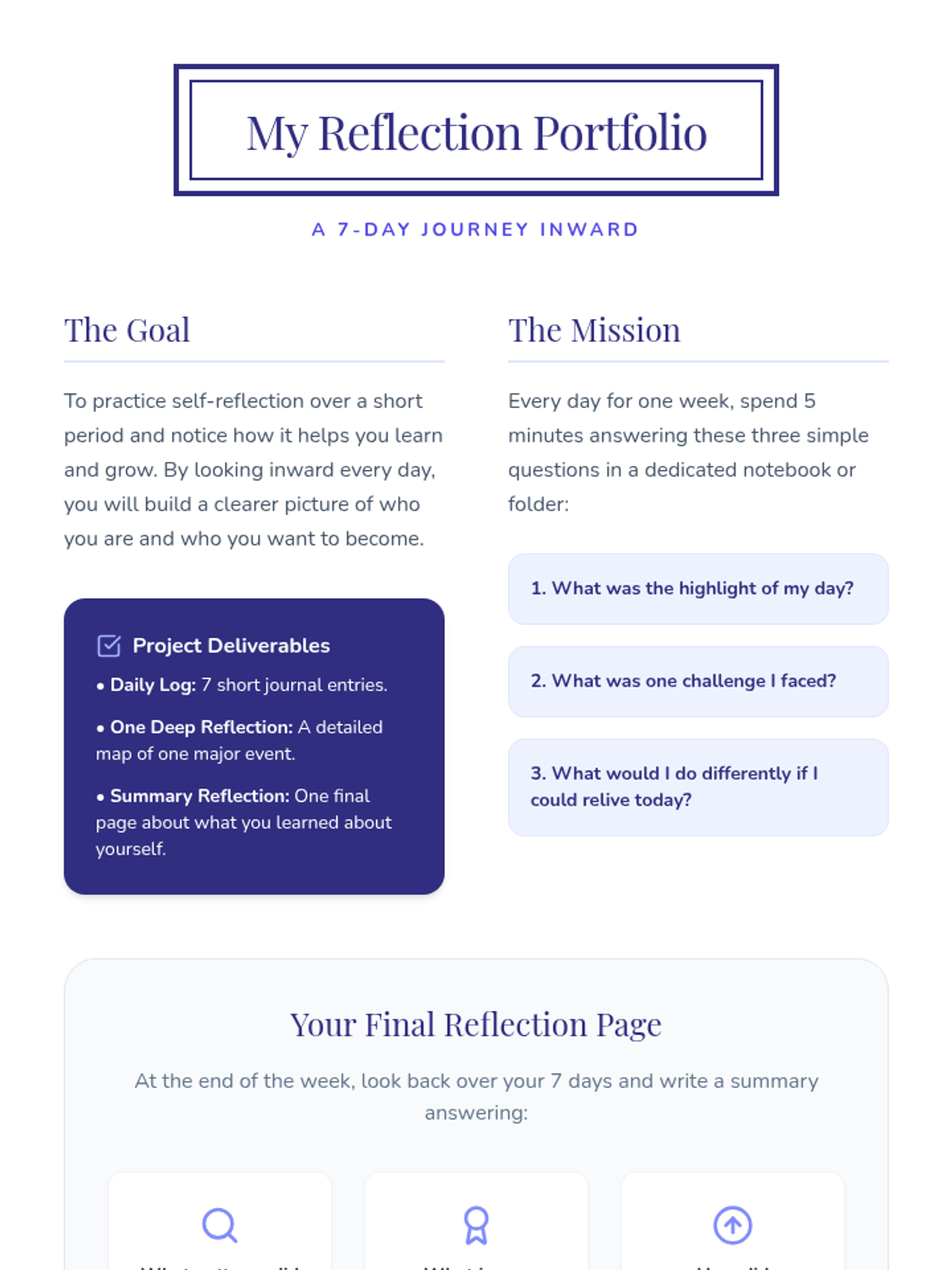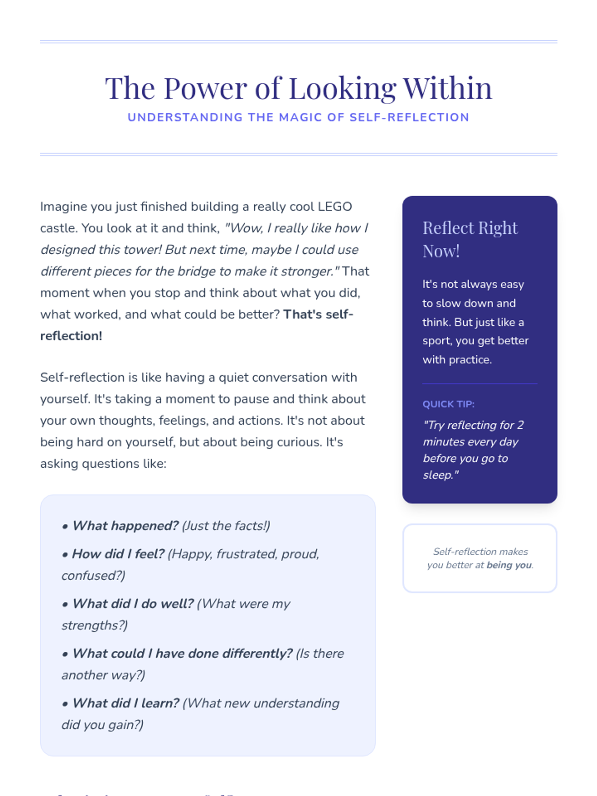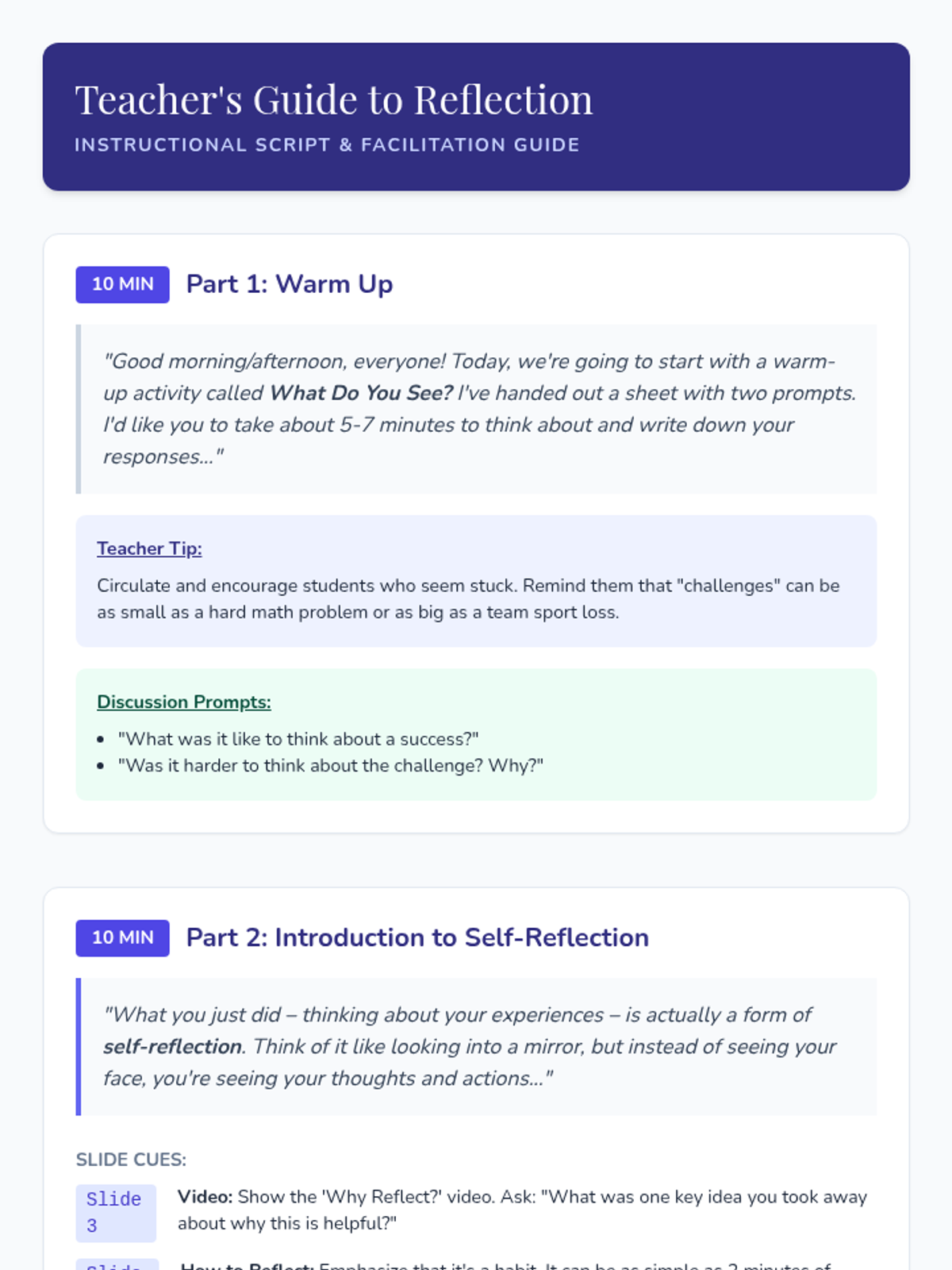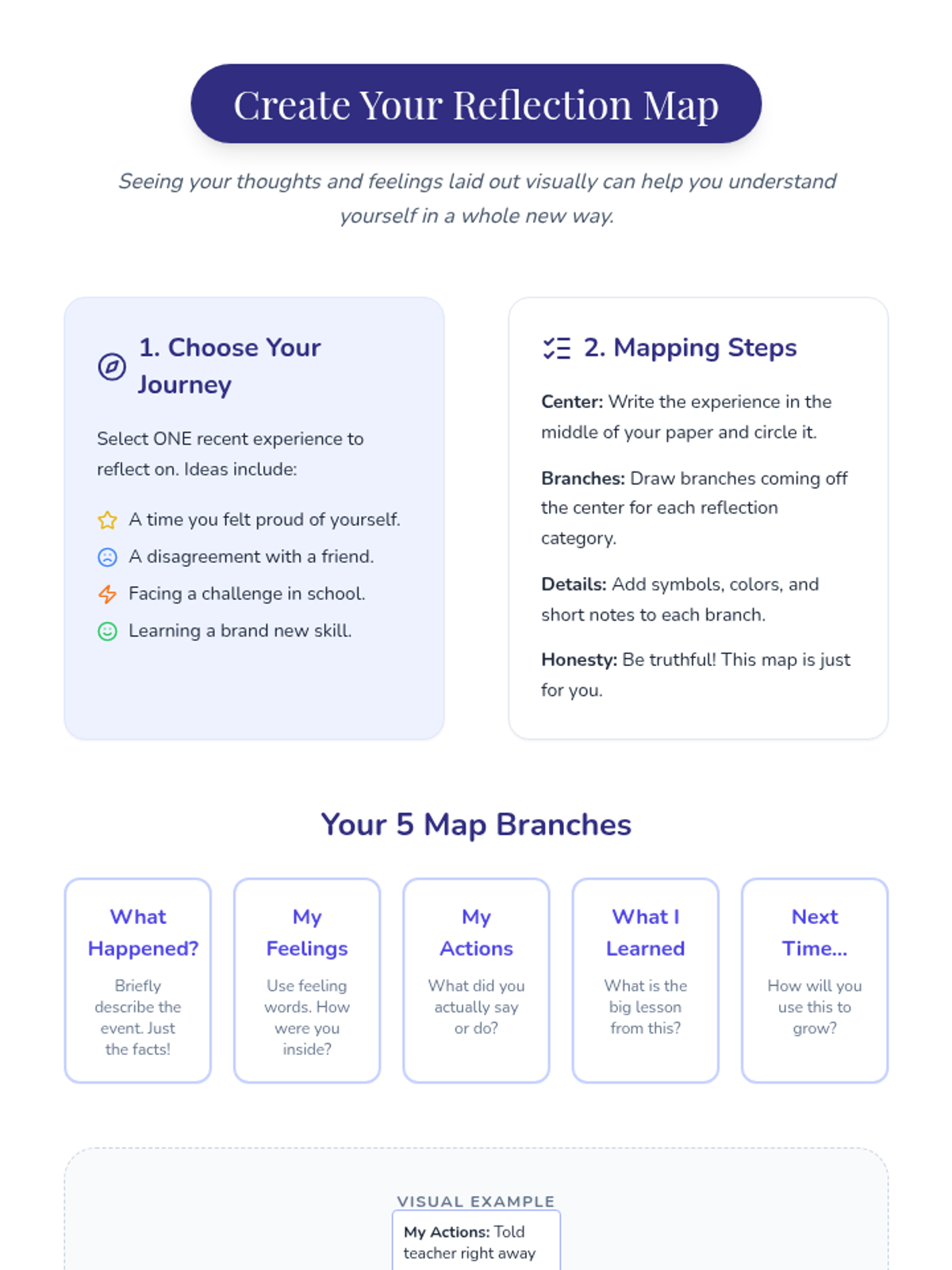 A 60-minute lesson for 5th and 6th graders exploring the power of self-reflection through discussion, video, and creative activities. Students learn to look inward to understand their thoughts, feelings, and actions for personal growth.