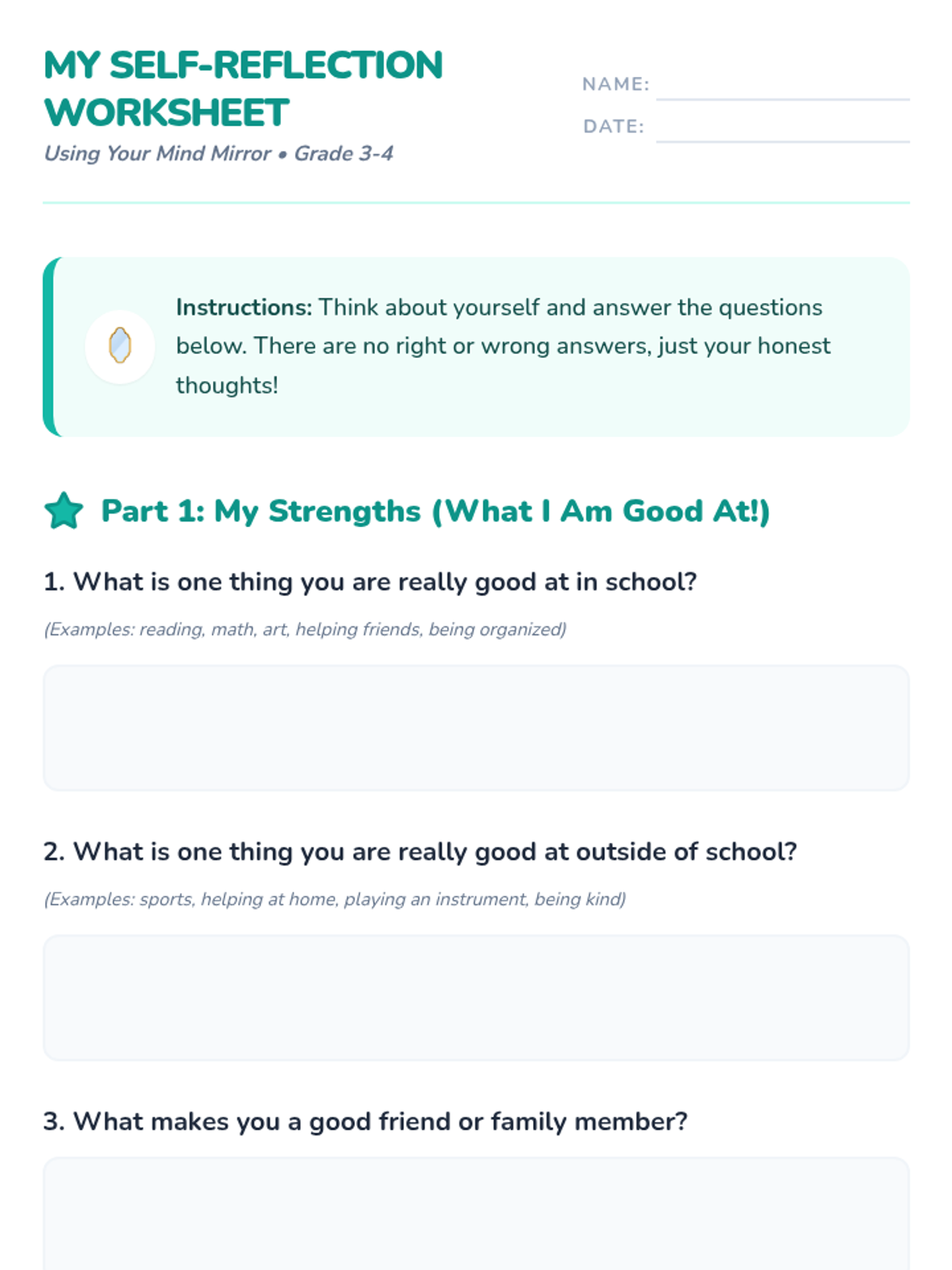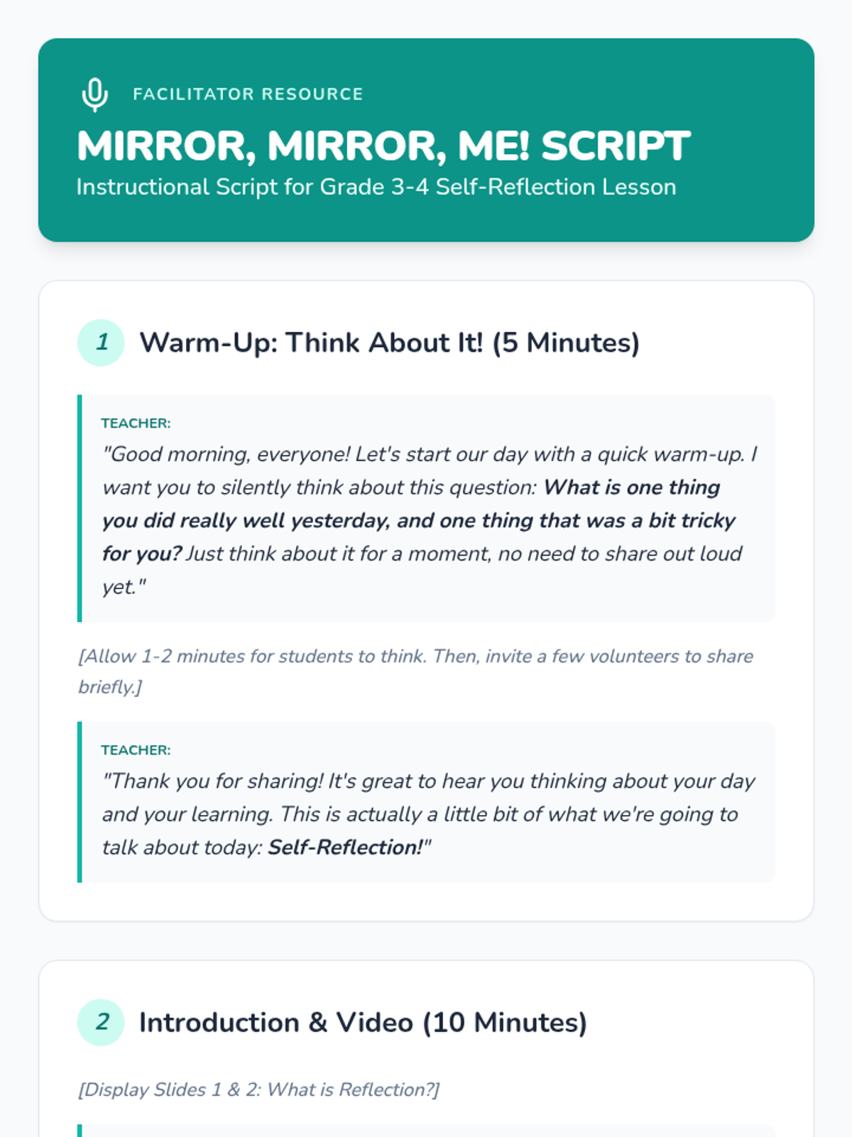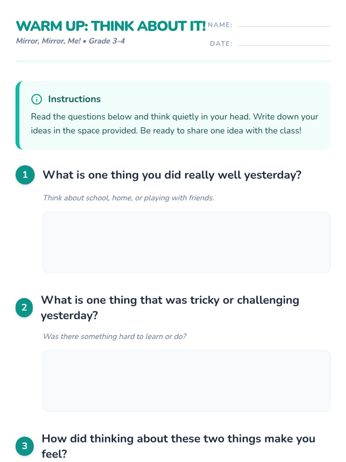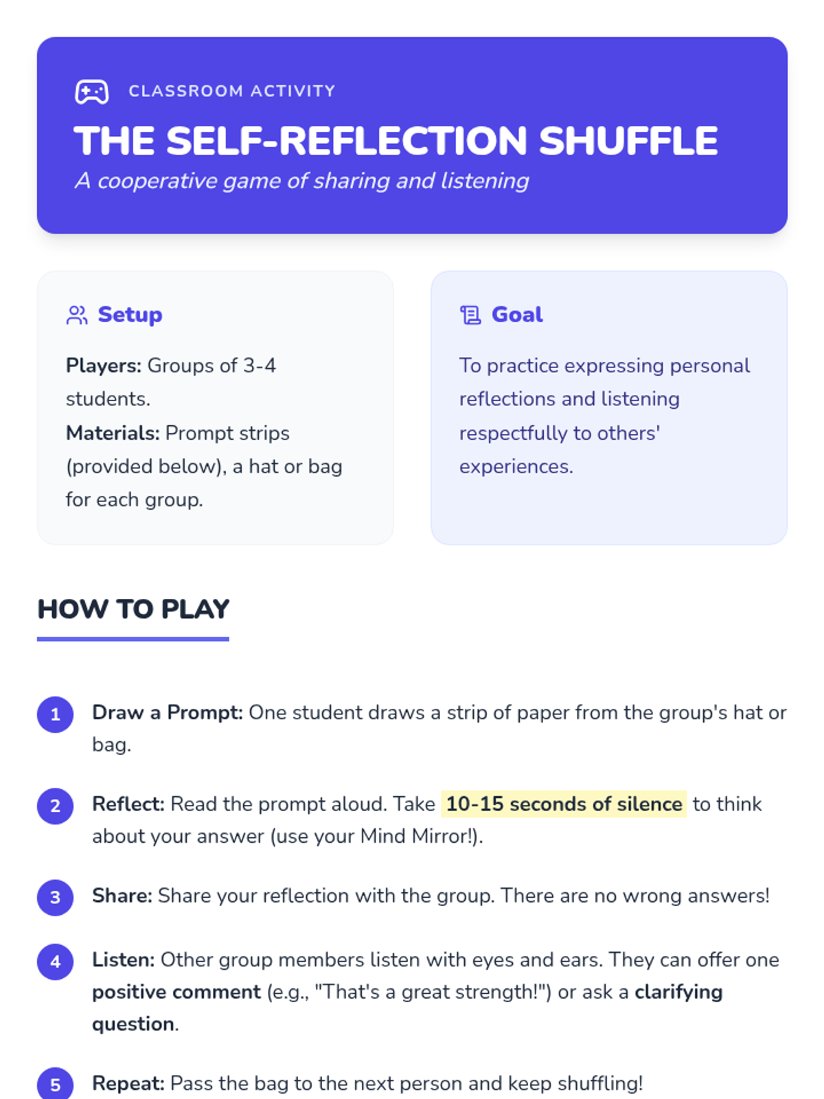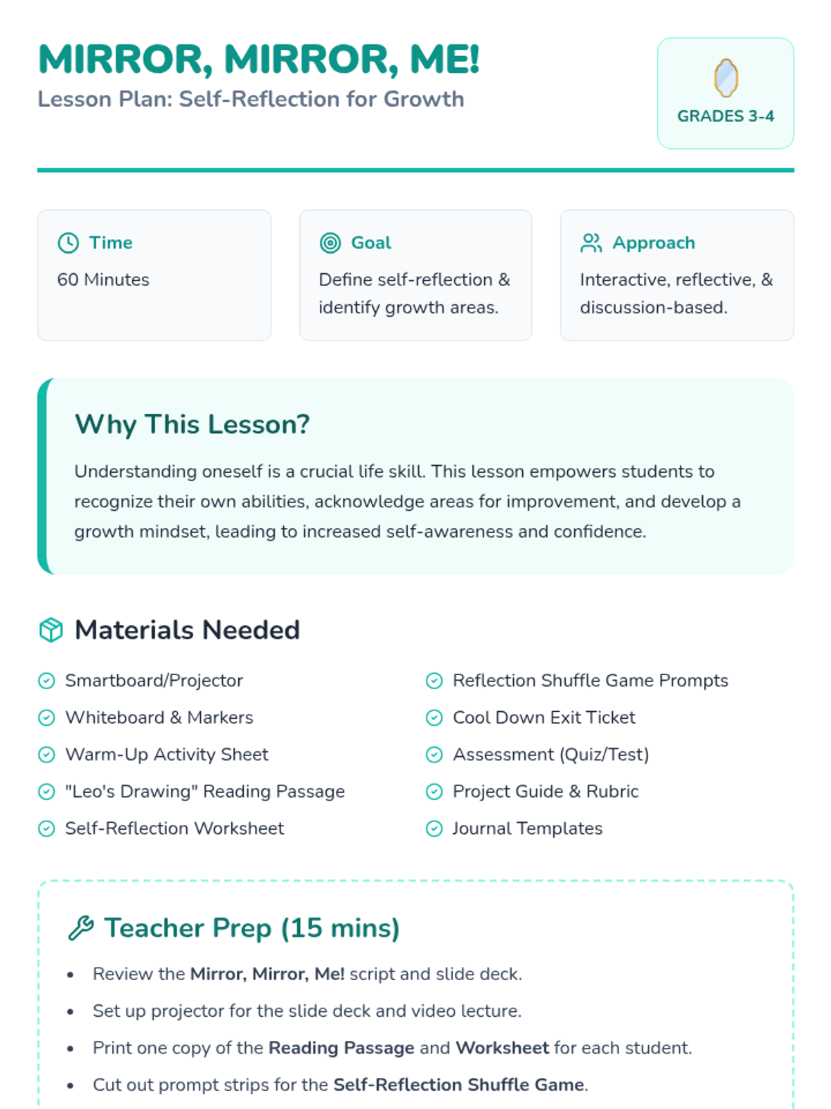 A 60-minute Social-Emotional Learning lesson for grades 3-4 that introduces the concept of self-reflection. Students explore their strengths and growth areas through a 'mind mirror' metaphor, interactive games, and personal reflection activities.