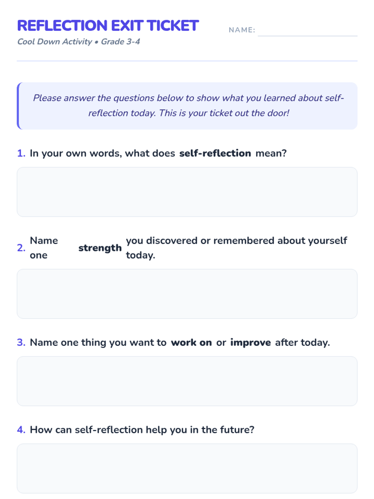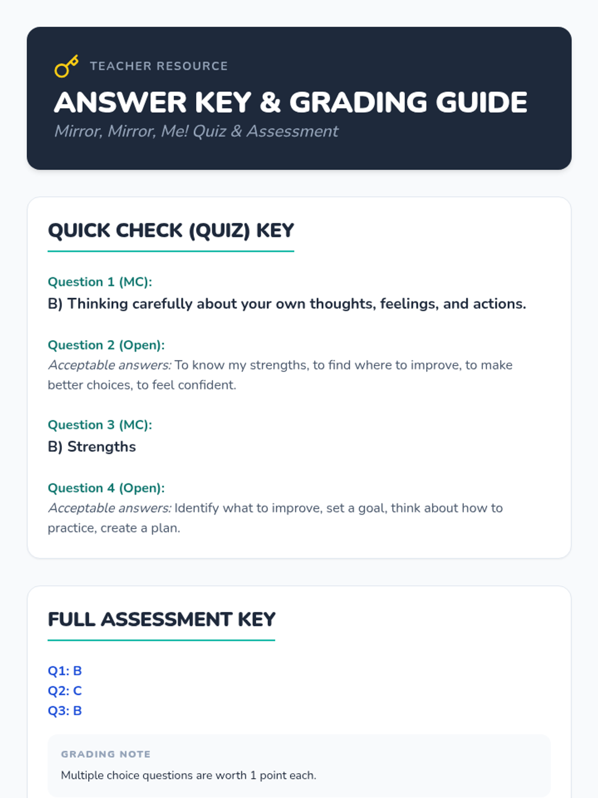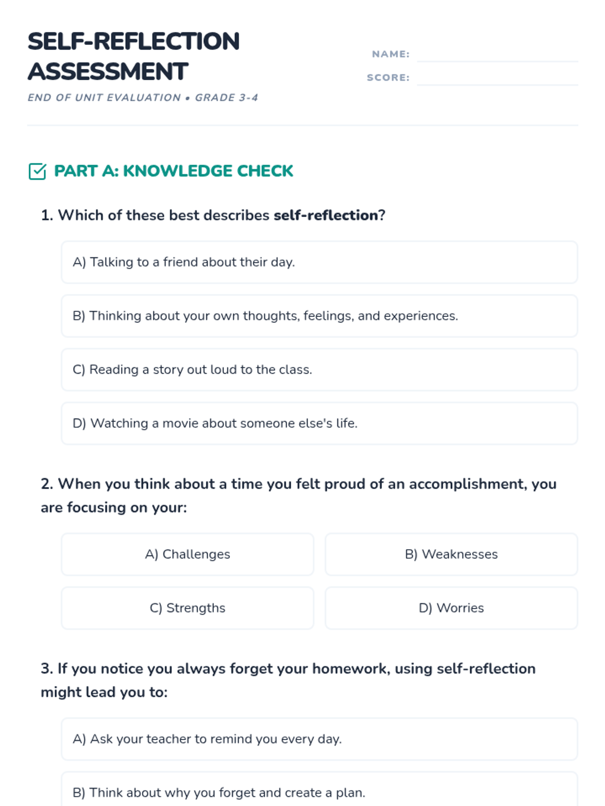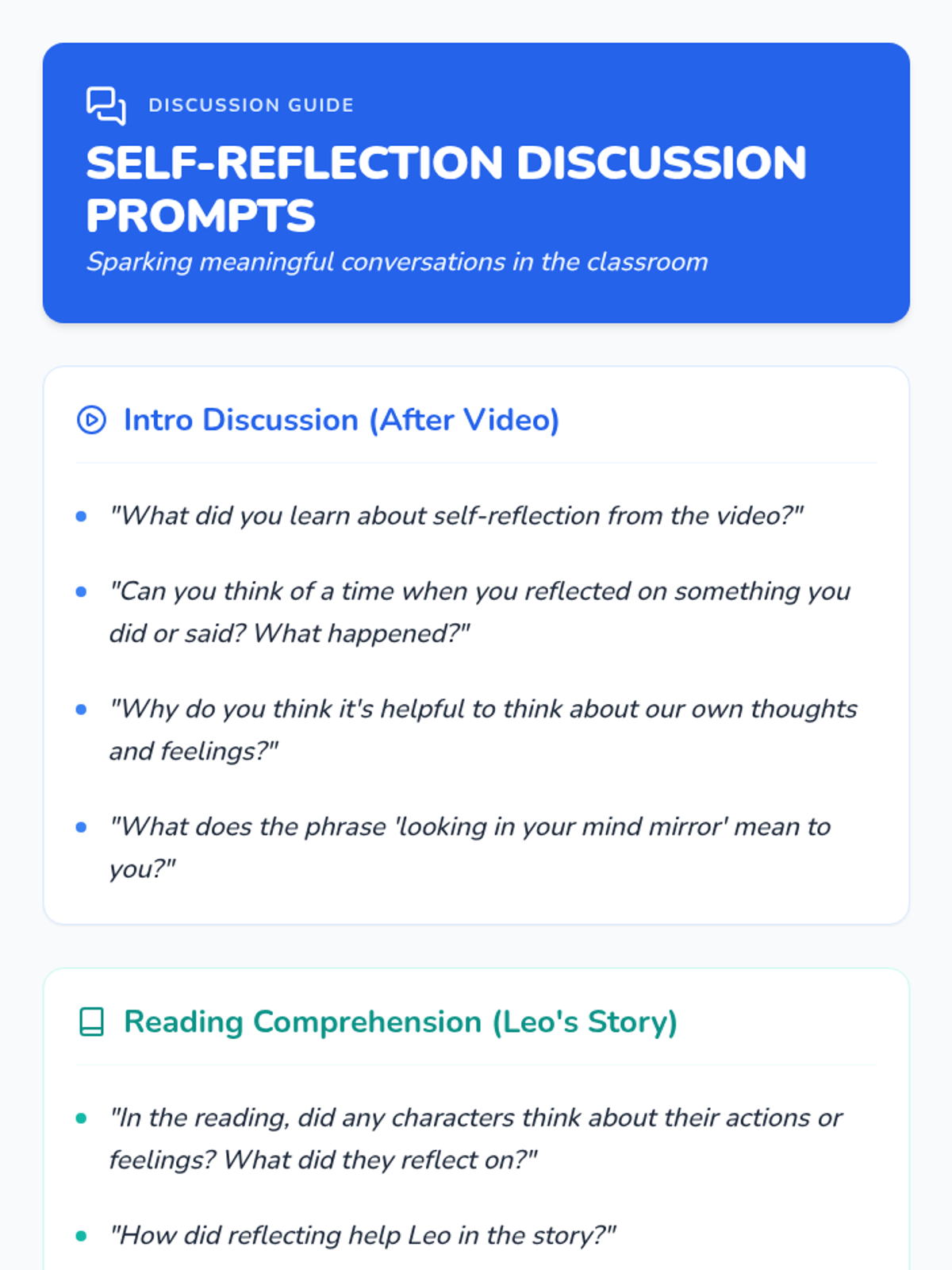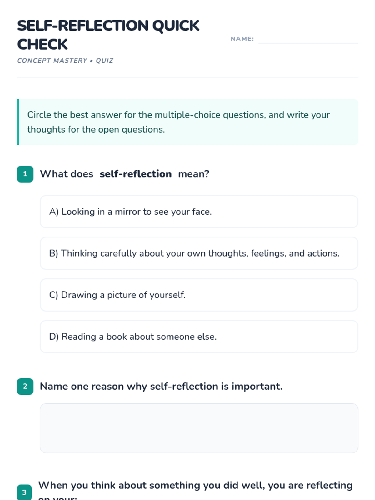 A 60-minute Social-Emotional Learning lesson for grades 3-4 that introduces the concept of self-reflection. Students explore their strengths and growth areas through a 'mind mirror' metaphor, interactive games, and personal reflection activities.