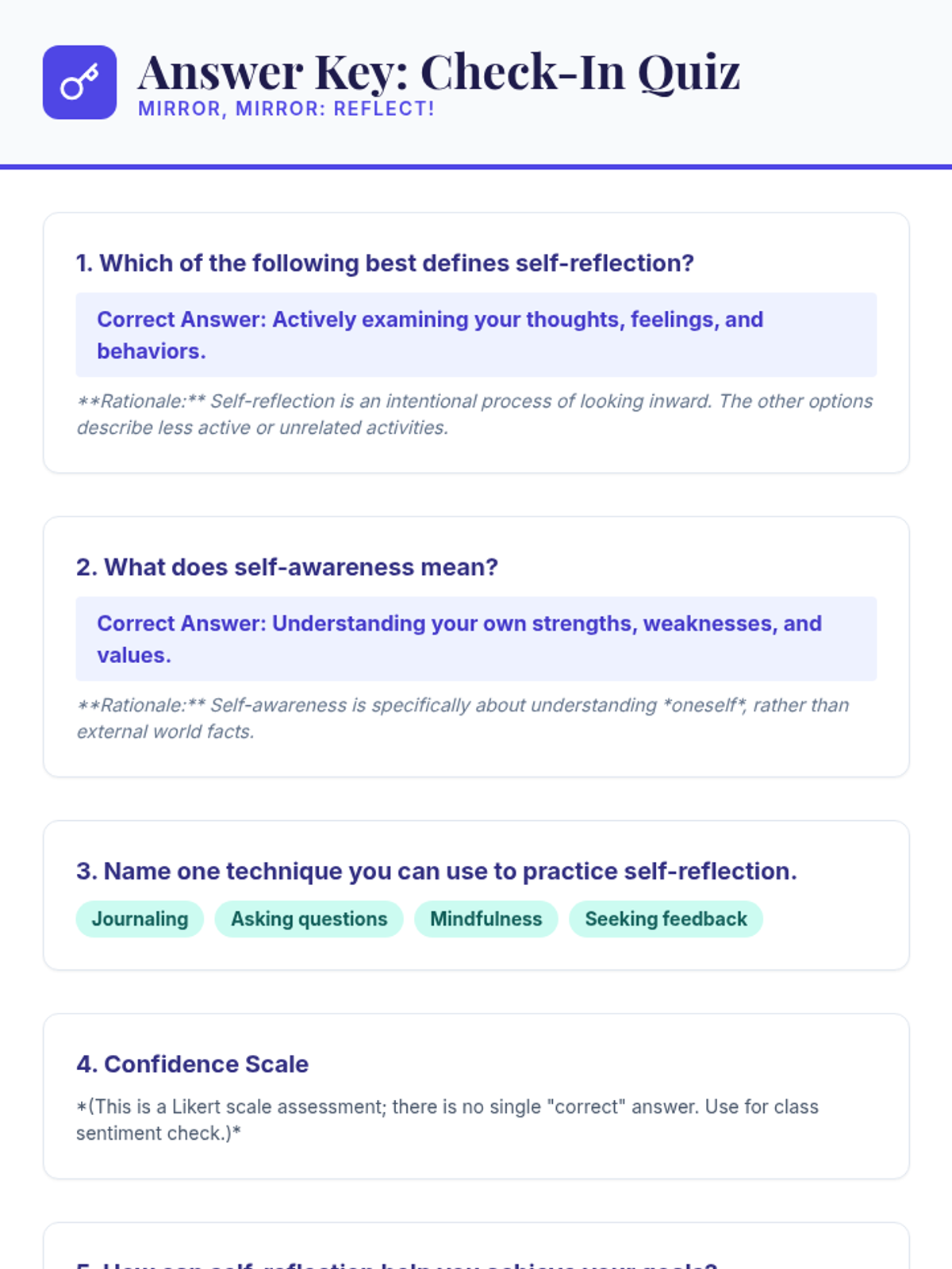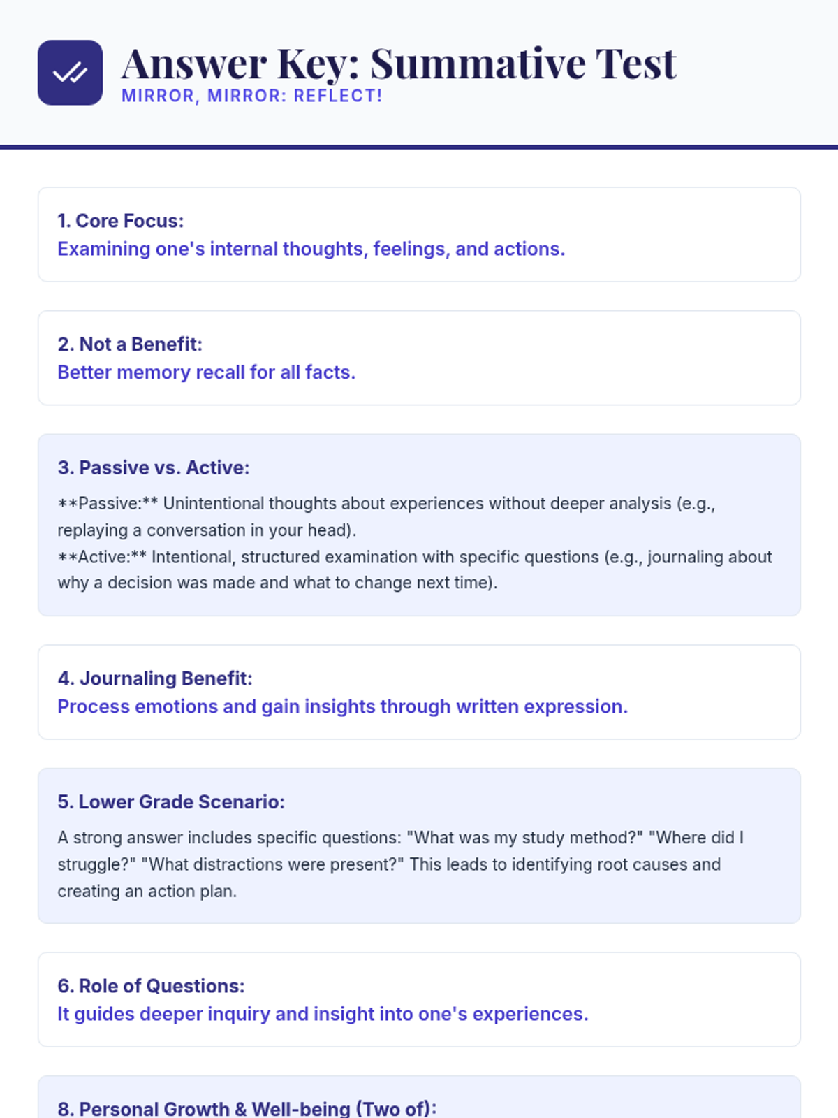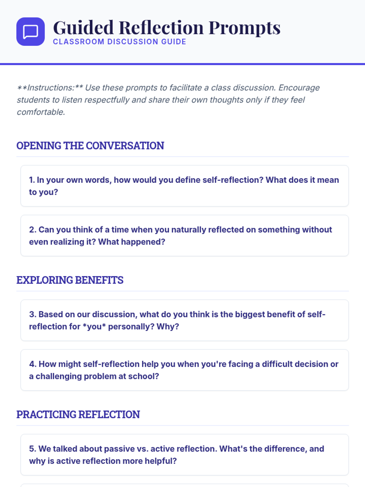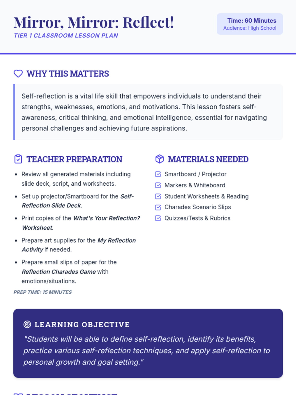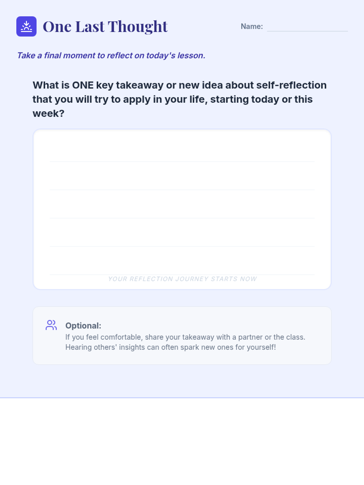 A 60-minute lesson for high school students focused on developing self-reflection skills through interactive activities, journaling, and goal setting.