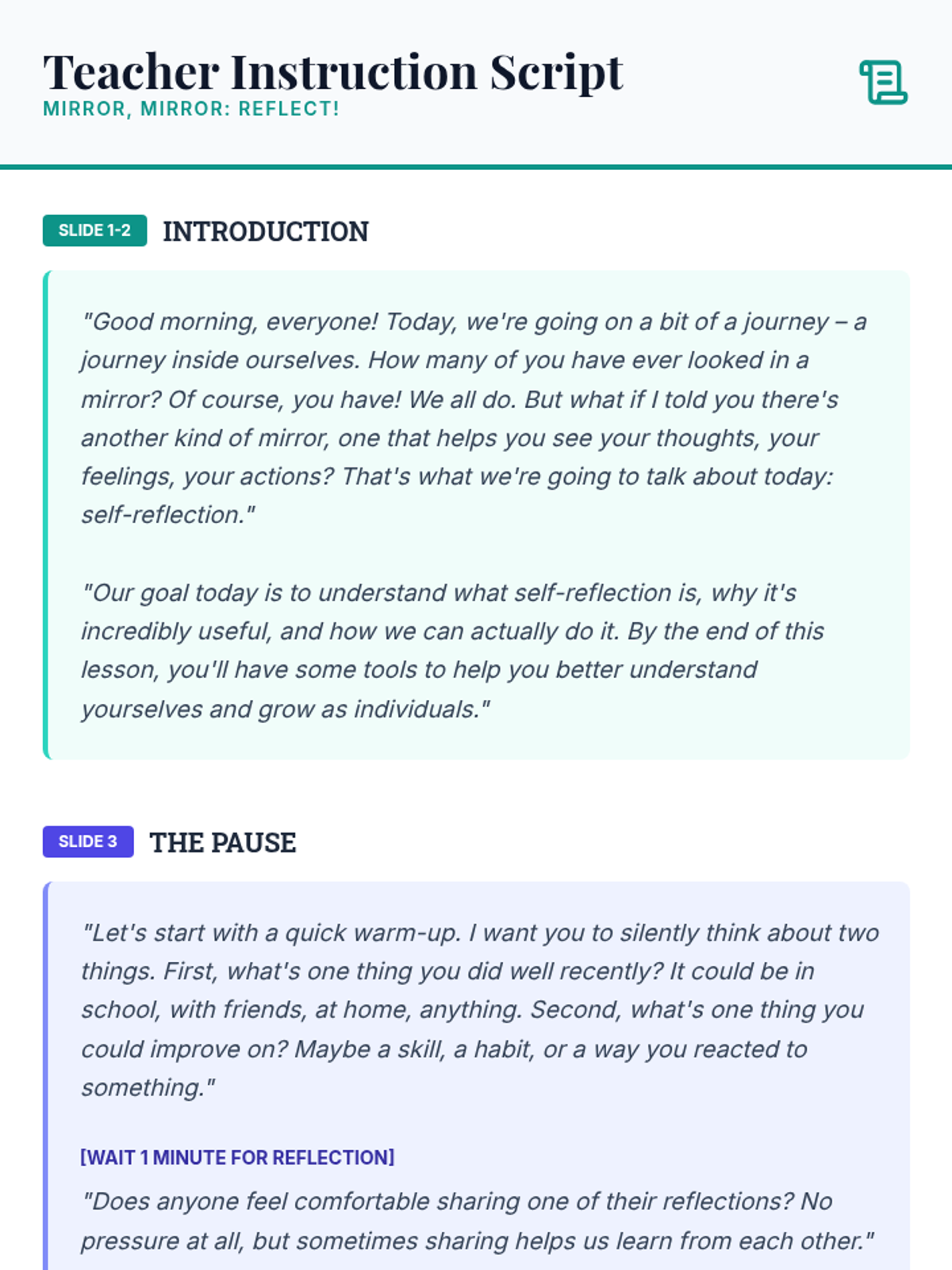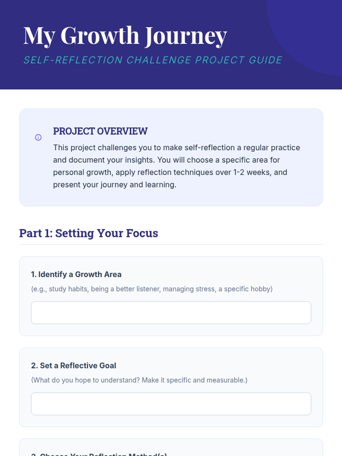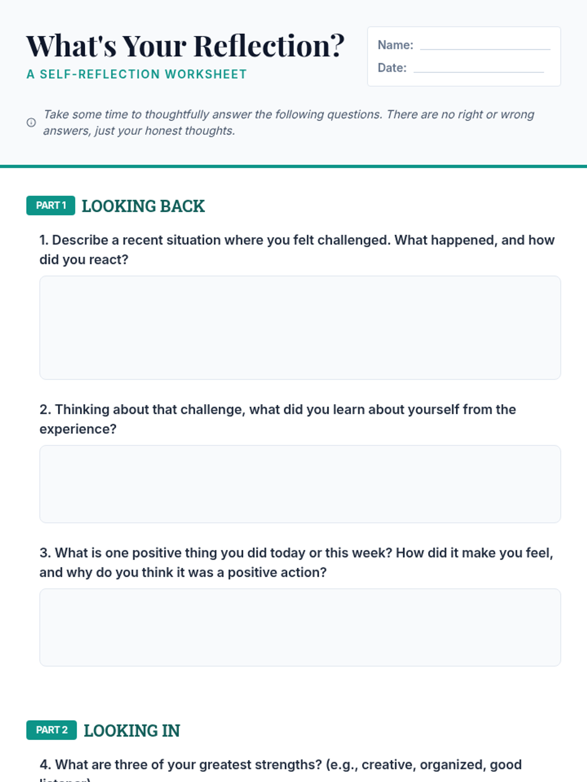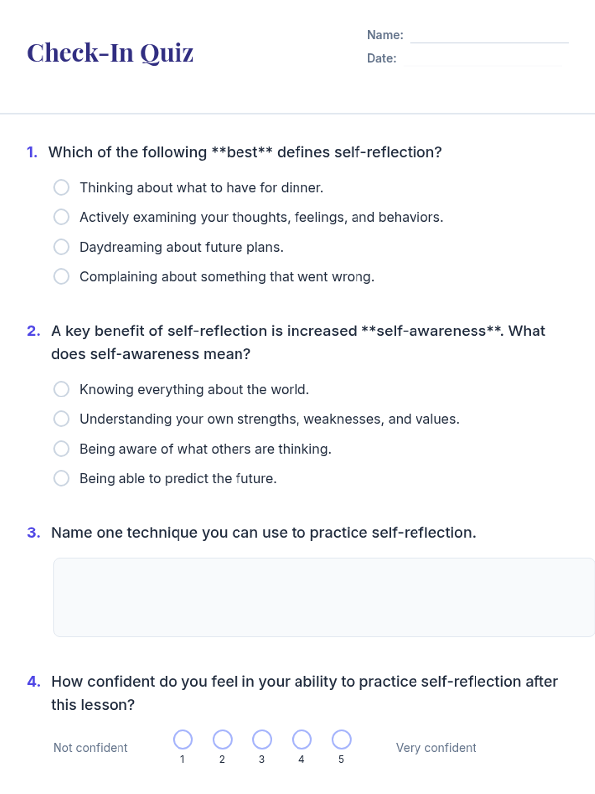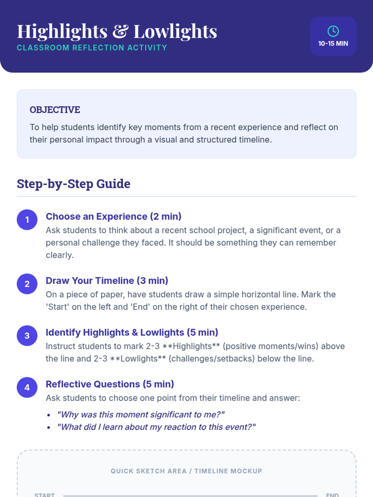 A 60-minute lesson for high school students focused on developing self-reflection skills through interactive activities, journaling, and goal setting.
