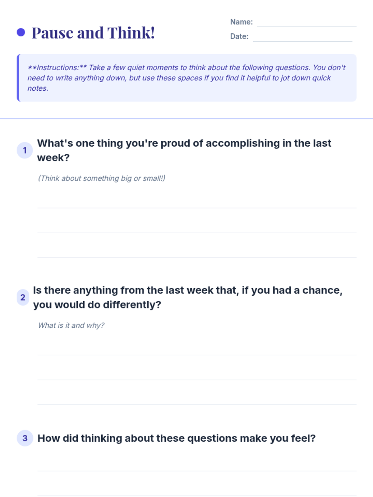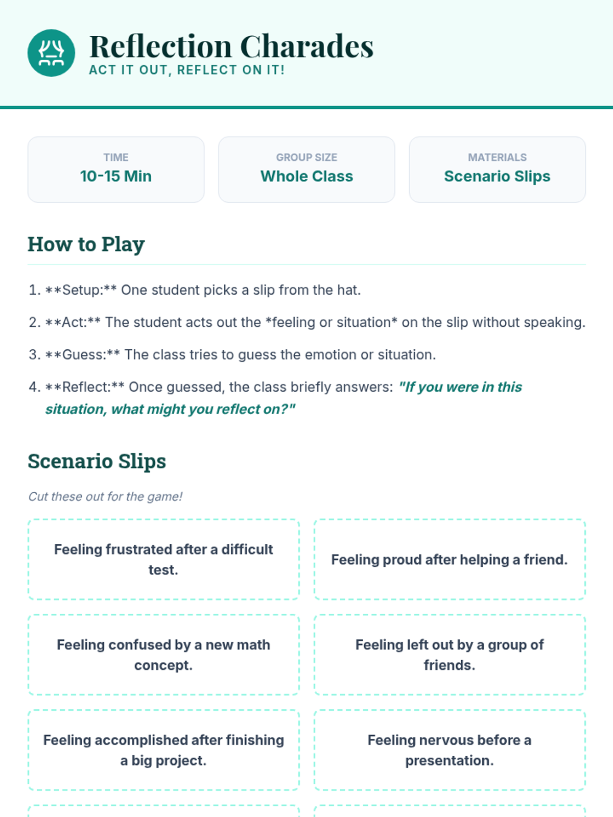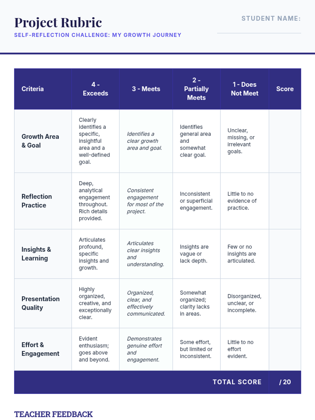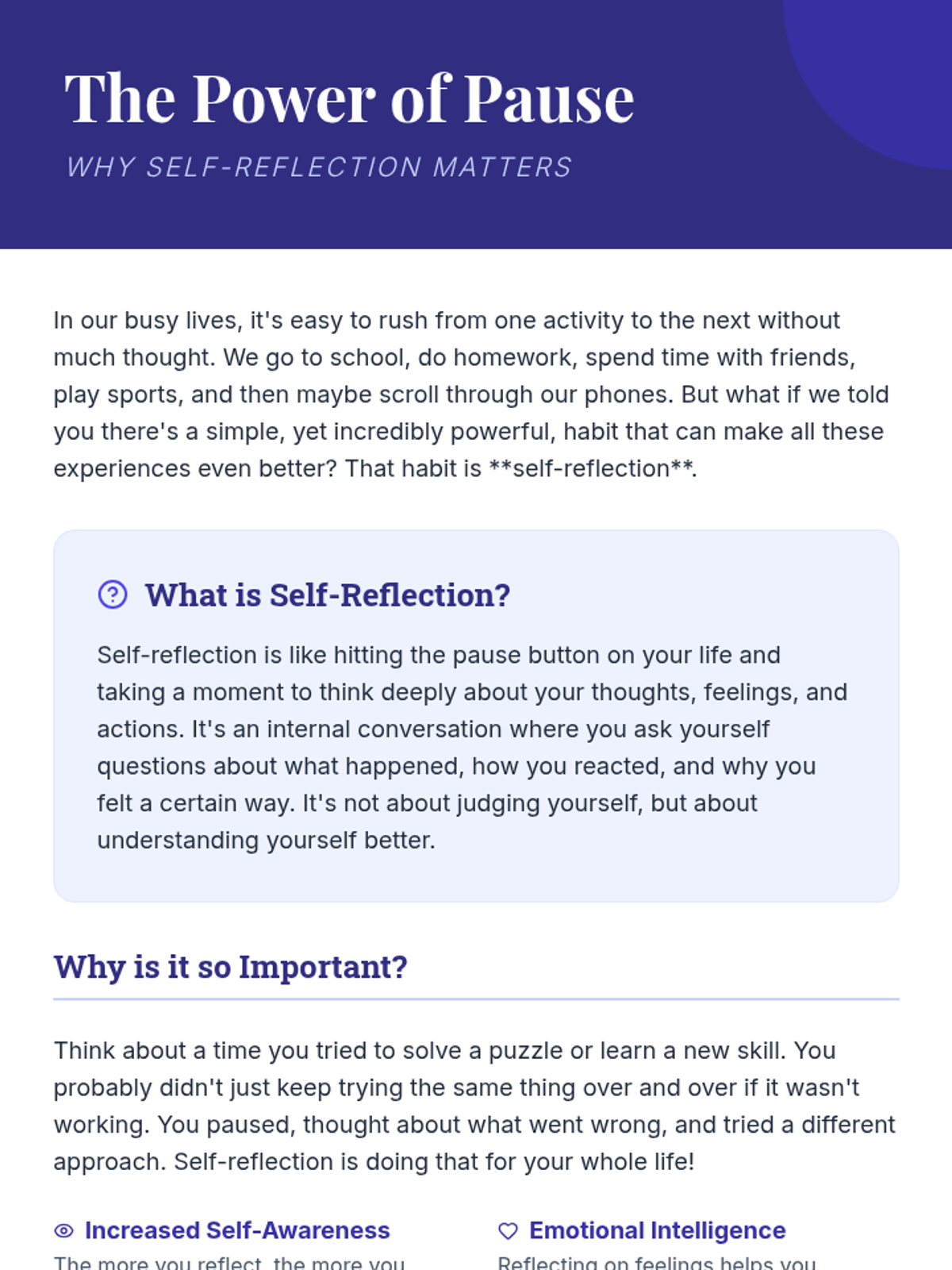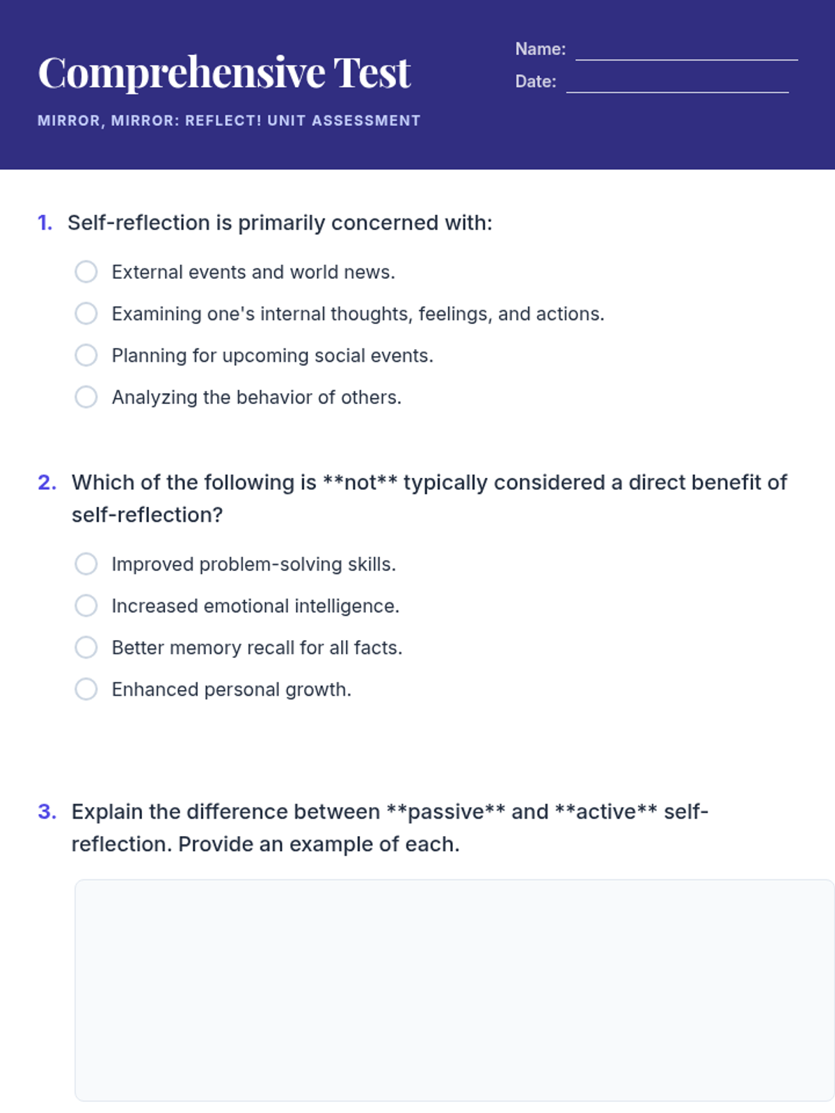 A 60-minute lesson for high school students focused on developing self-reflection skills through interactive activities, journaling, and goal setting.