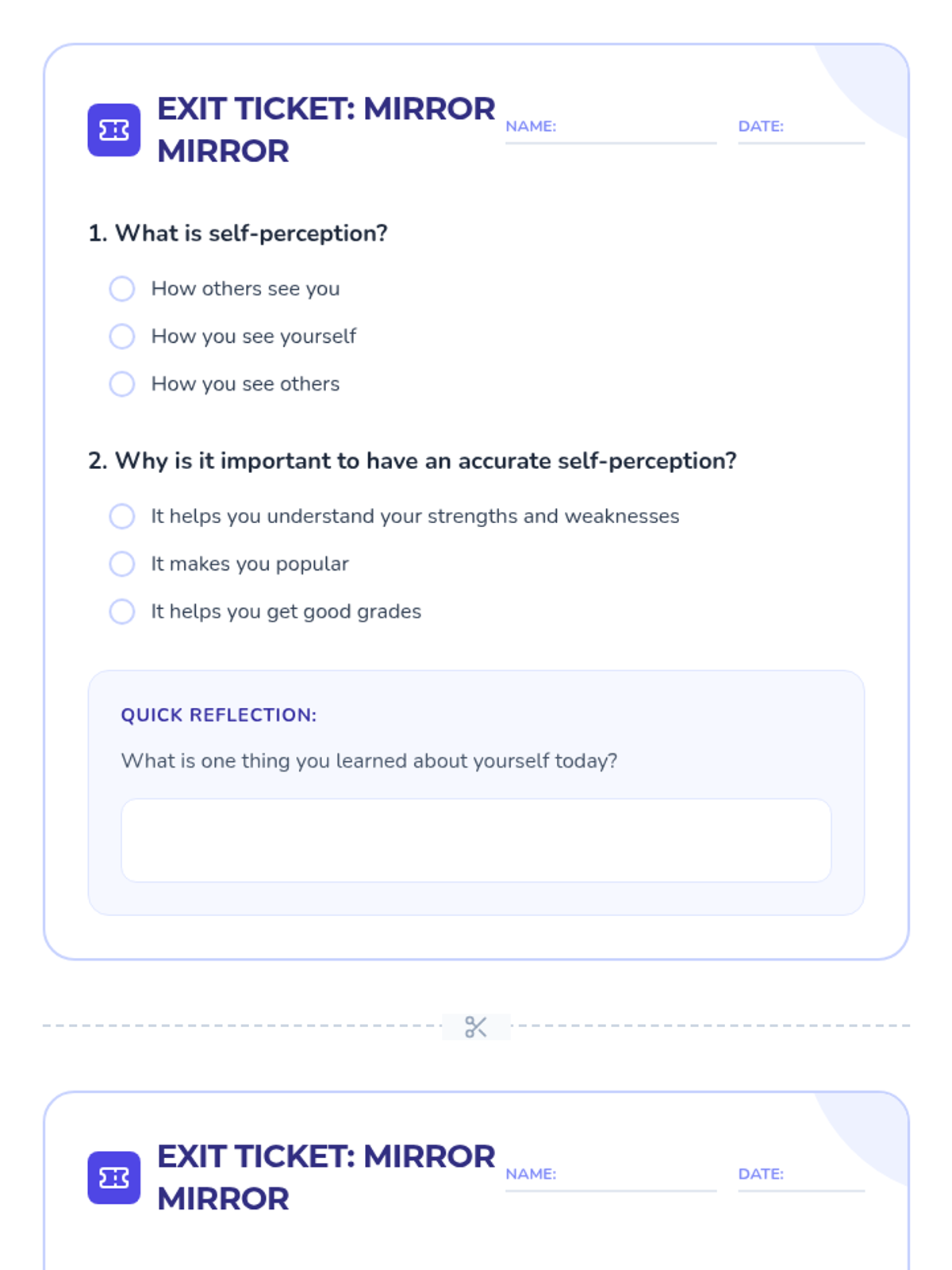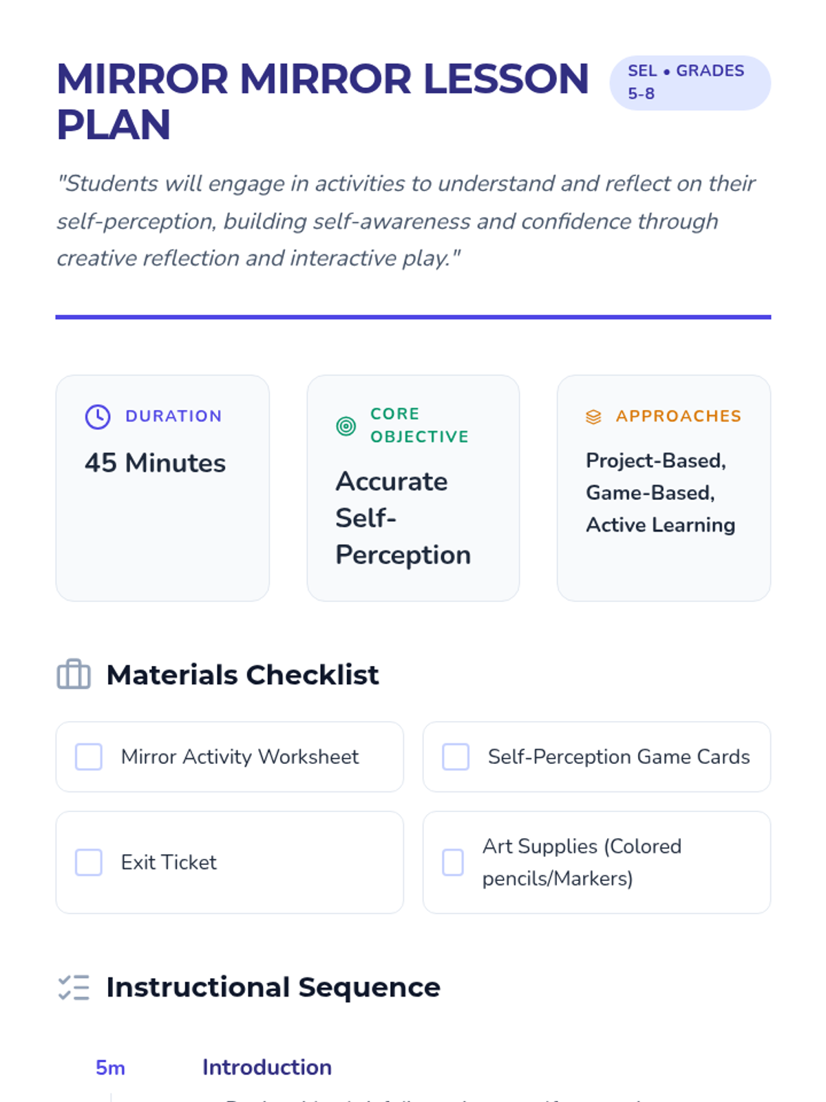 A SEL lesson for grades 5-8 focused on developing accurate self-perception through creative reflection, peer feedback, and interactive discussion.