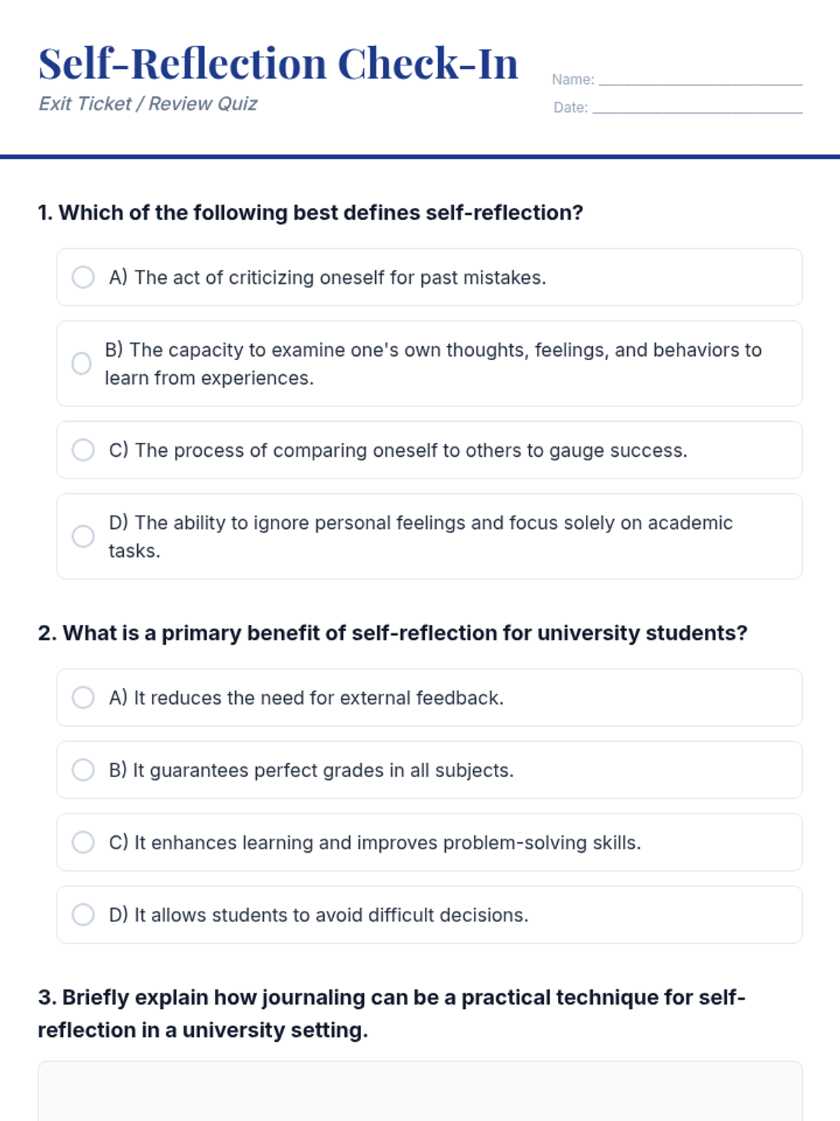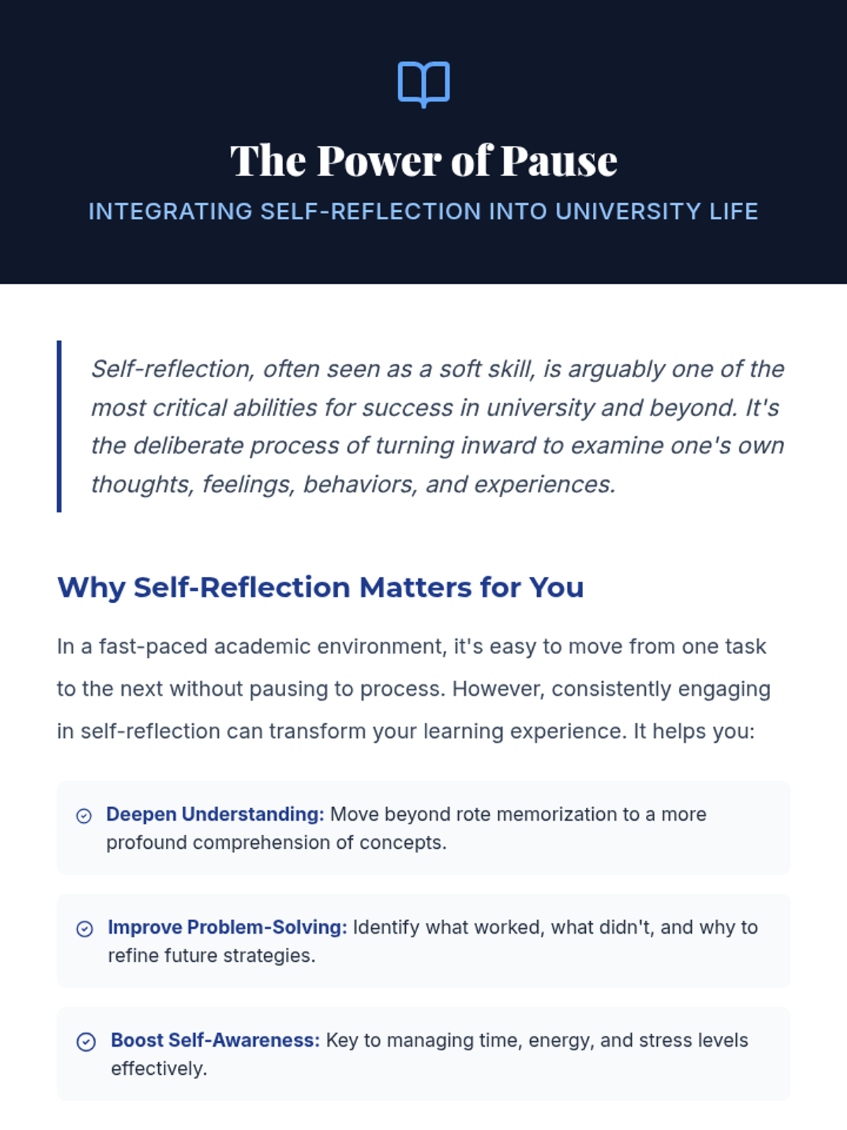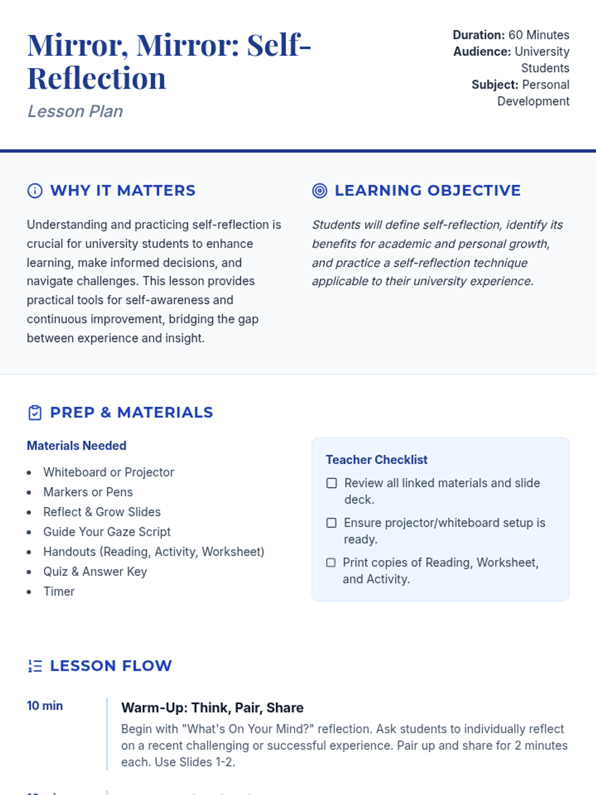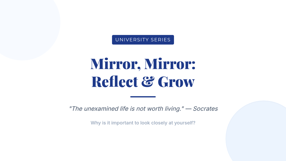 A 60-minute lesson for university students focusing on the definition, benefits, and practical application of self-reflection for academic and personal growth.