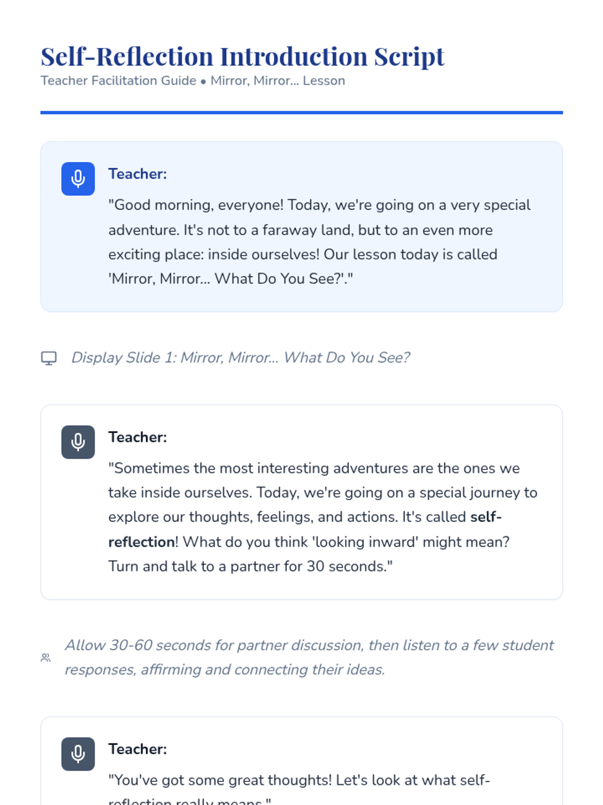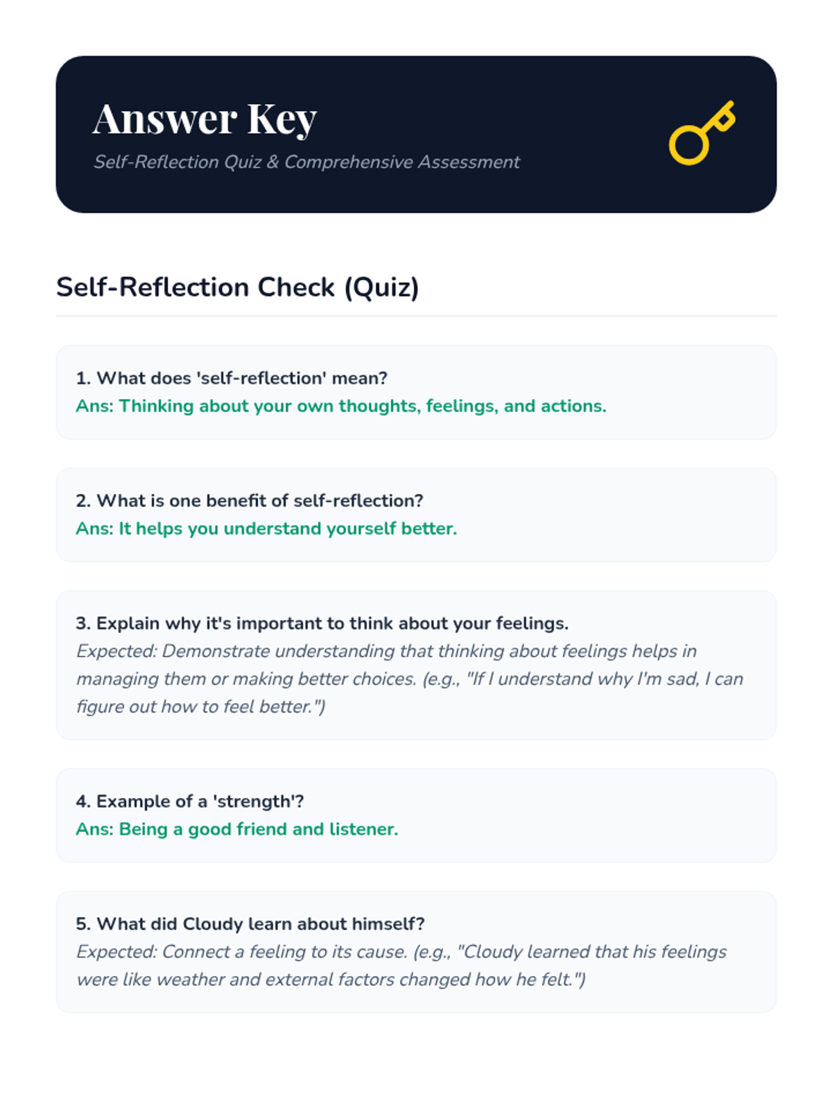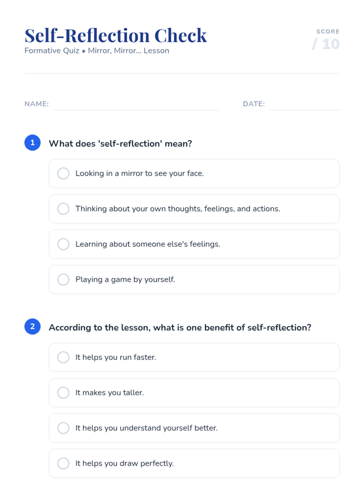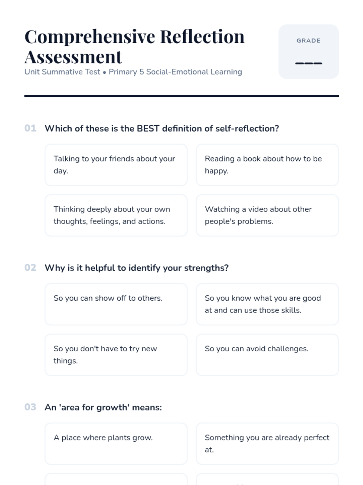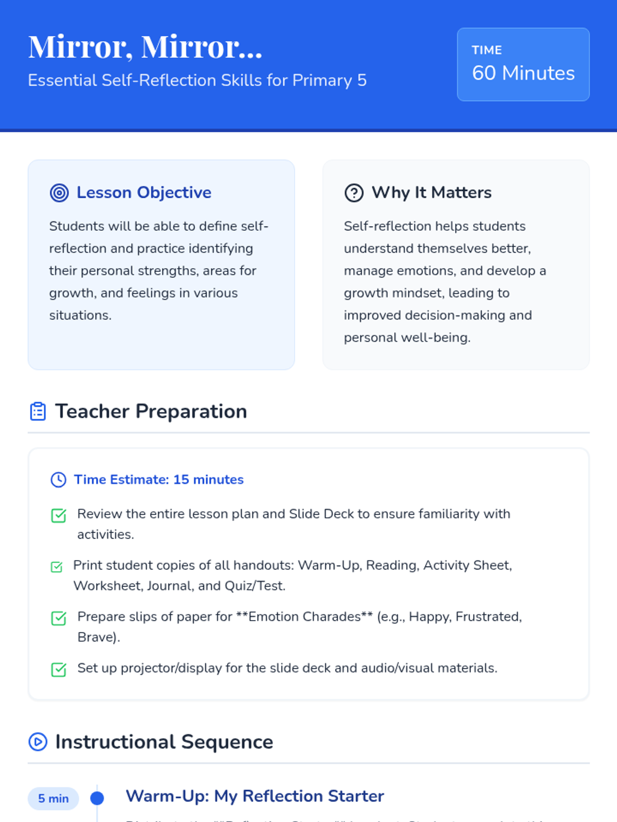 This lesson helps Primary 5 students develop essential self-reflection skills. It guides them through understanding their strengths, areas for growth, and feelings, fostering self-awareness and personal development.