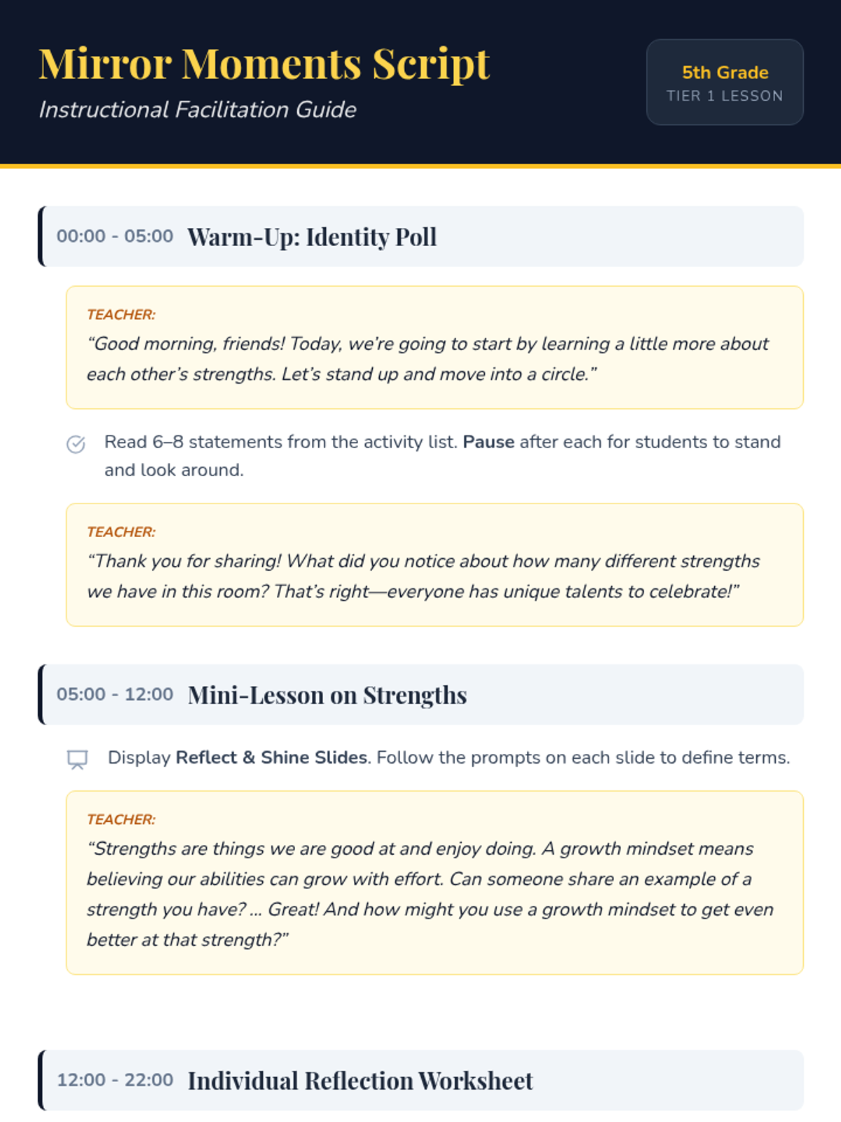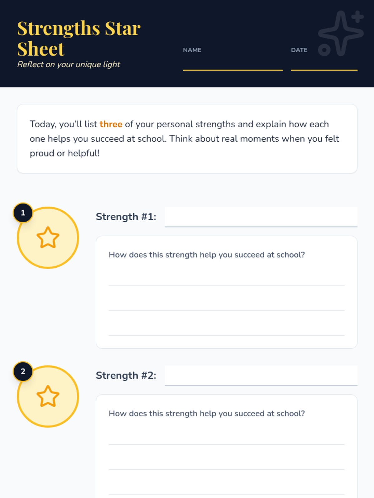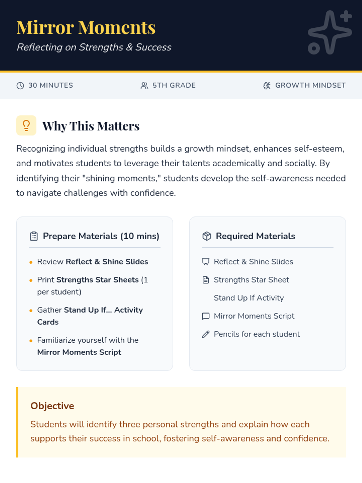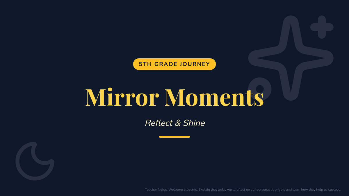 A 30-minute self-reflection lesson for 5th graders to identify three personal strengths and explain how they contribute to school success, using a 'Celestial Mirror' theme to foster growth mindset and confidence.