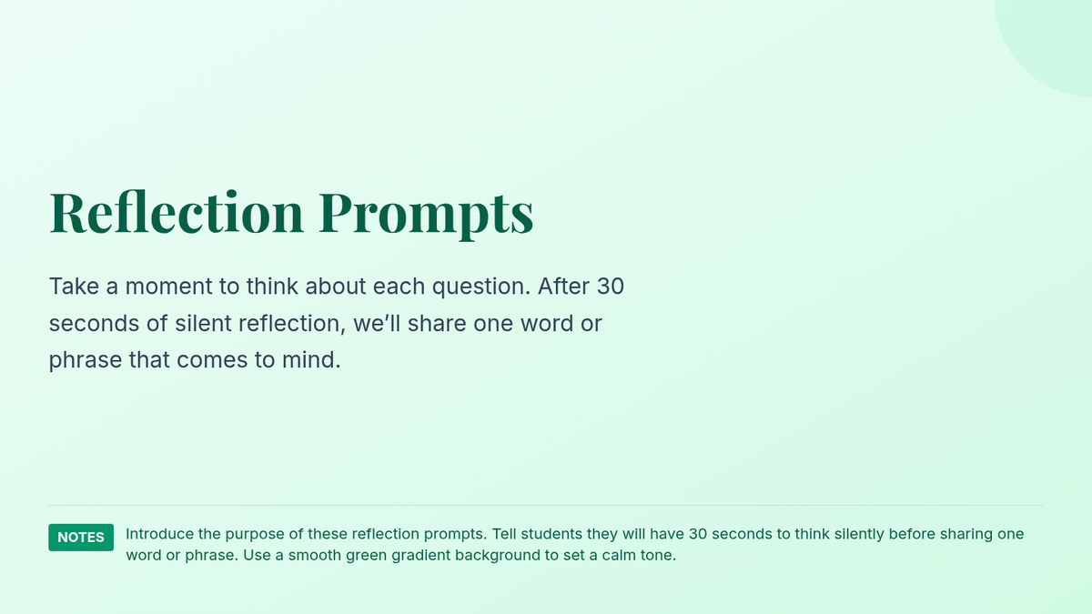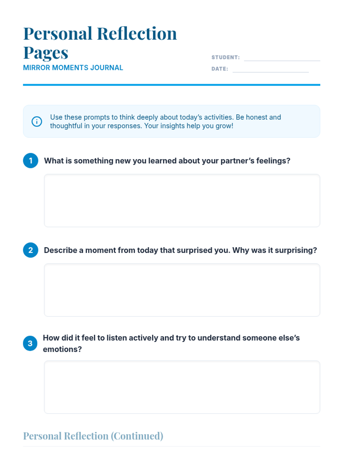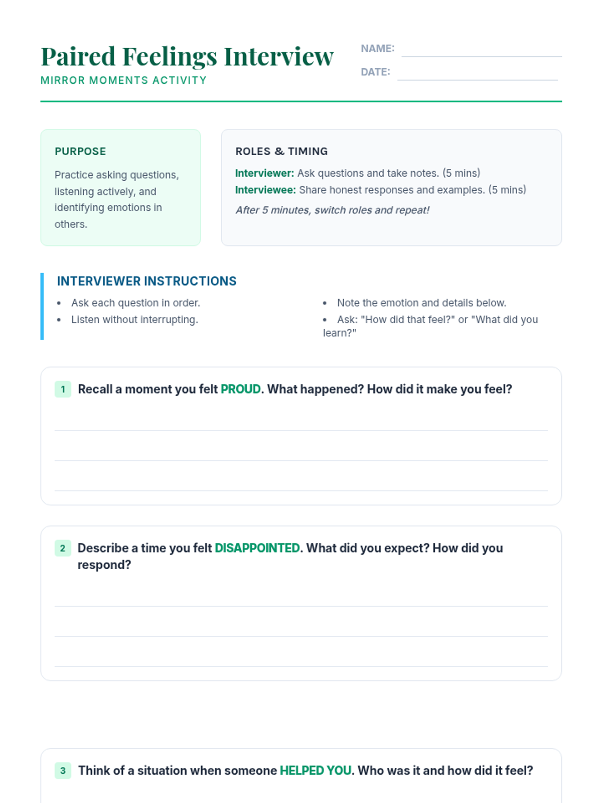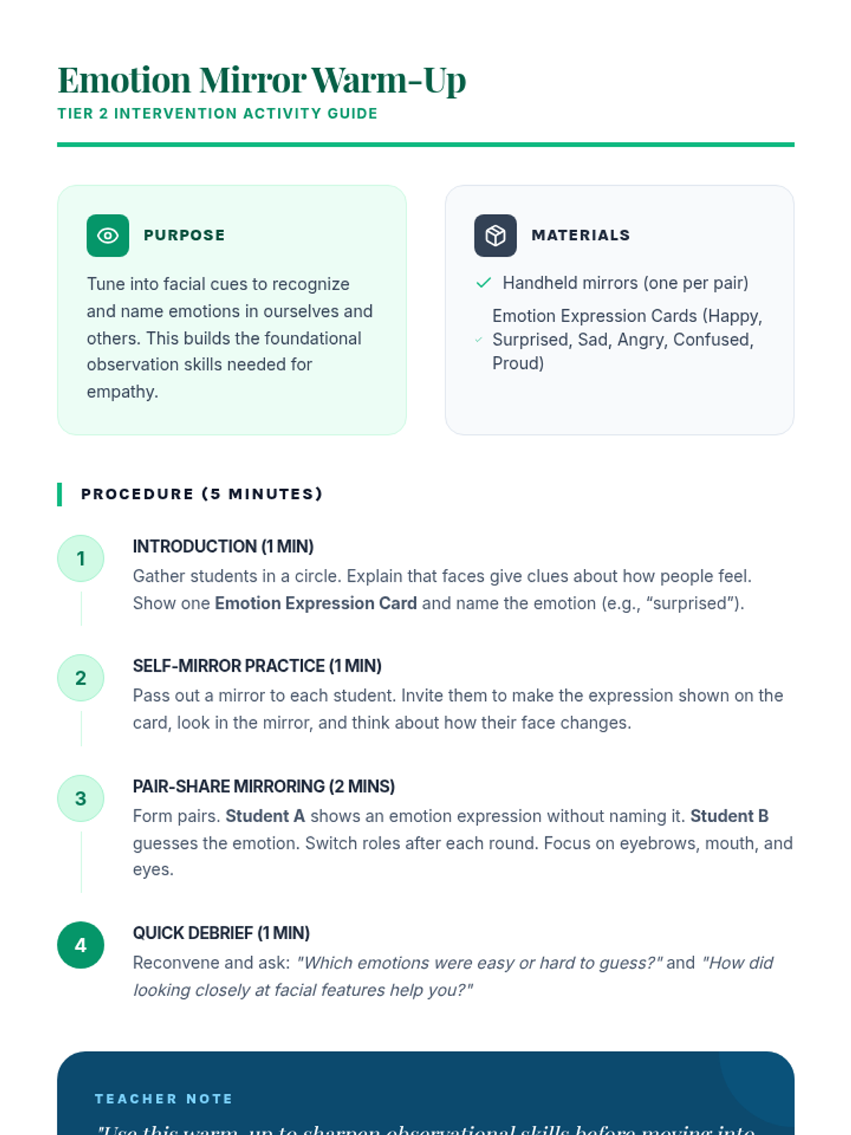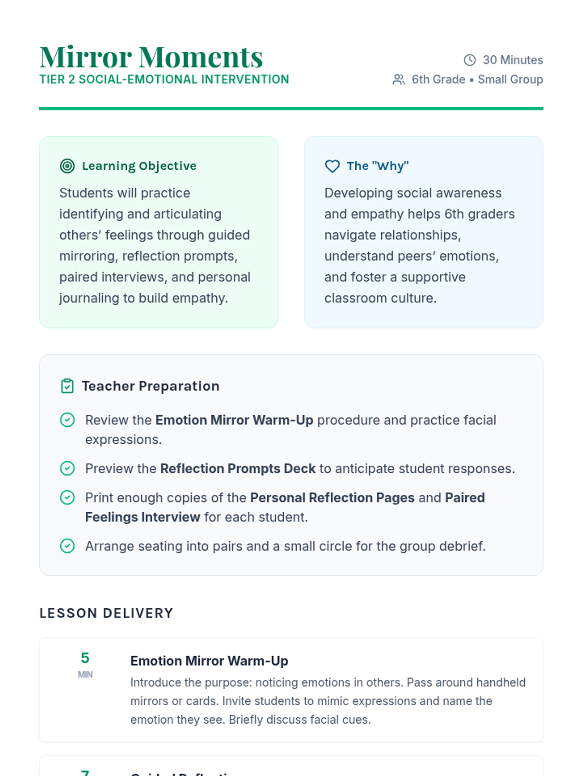 A 30-minute Tier 2 small-group intervention for 6th graders focused on social awareness and empathy. Students practice identifying and articulating emotions through mirroring, guided reflection, and paired interviews.