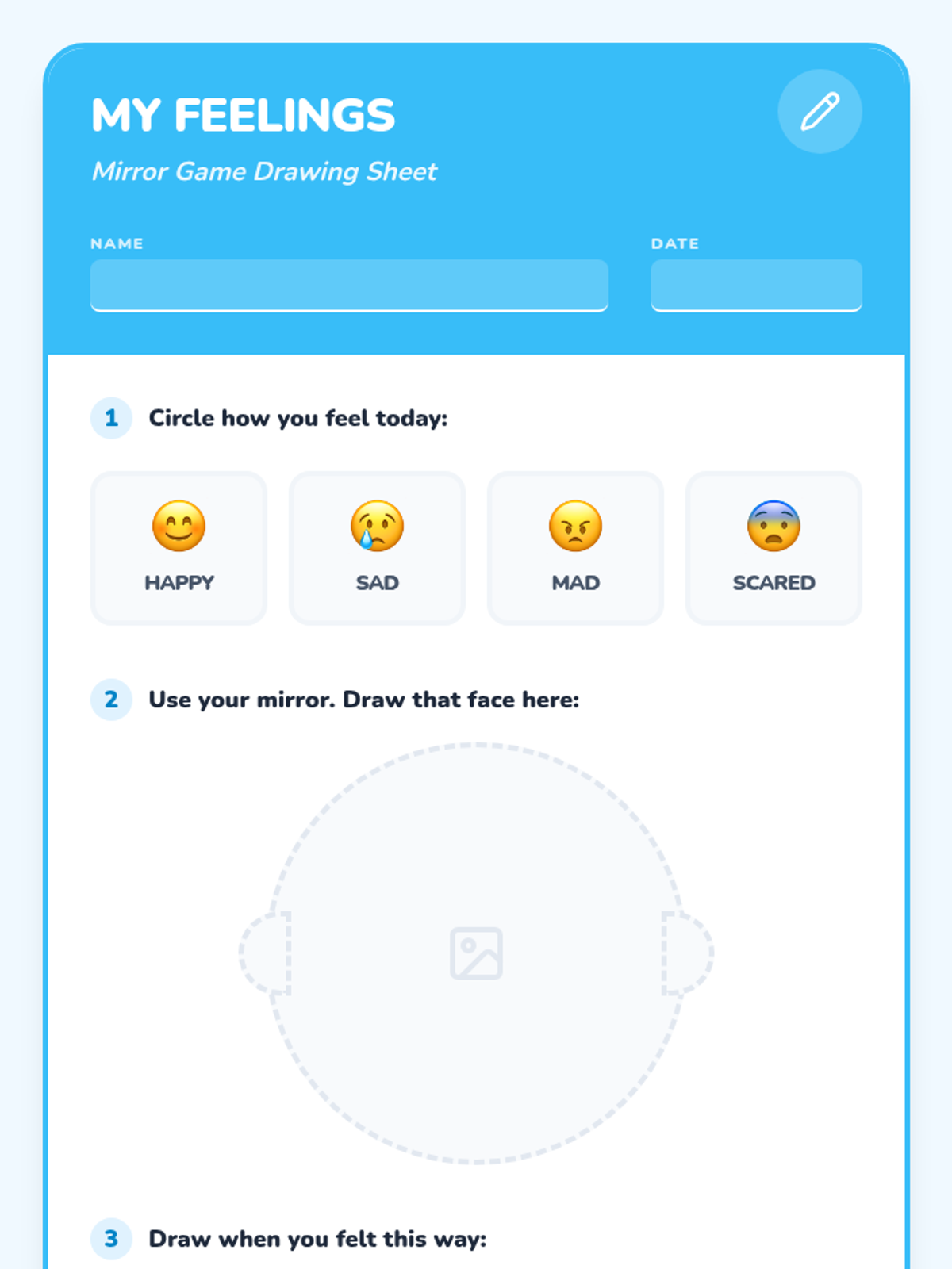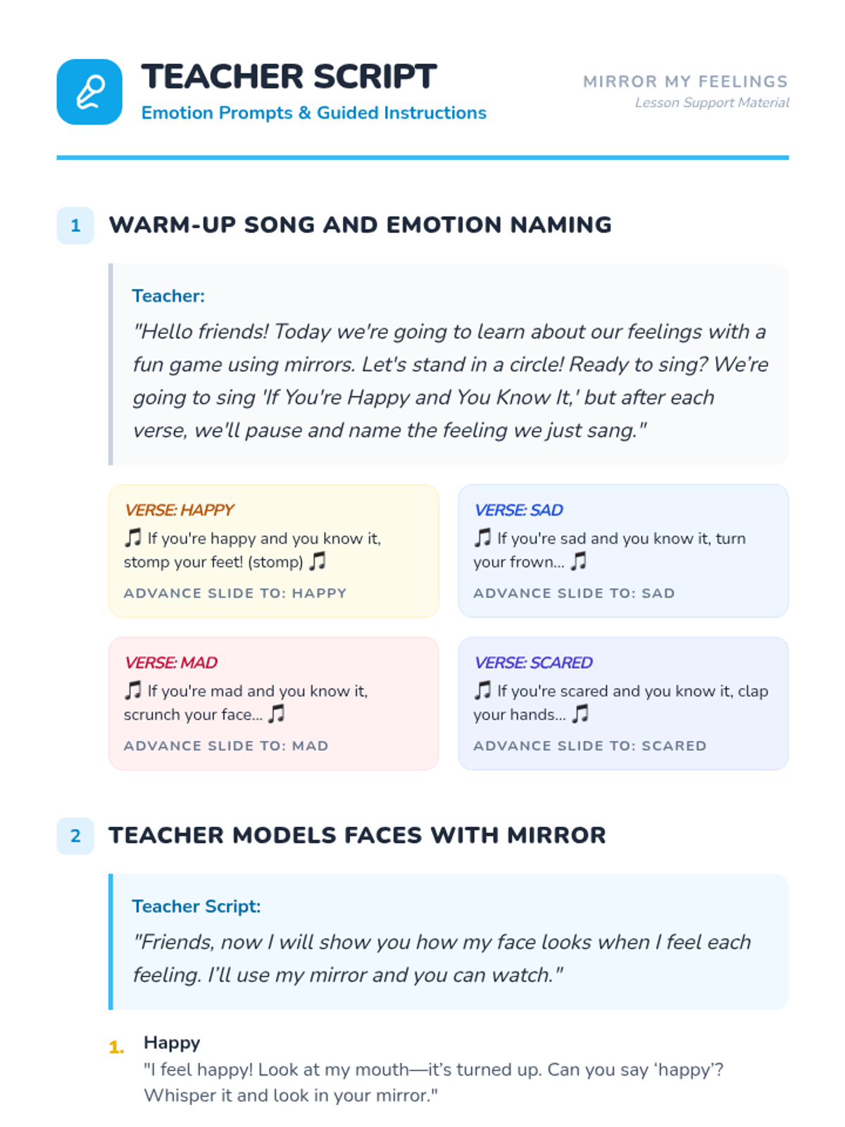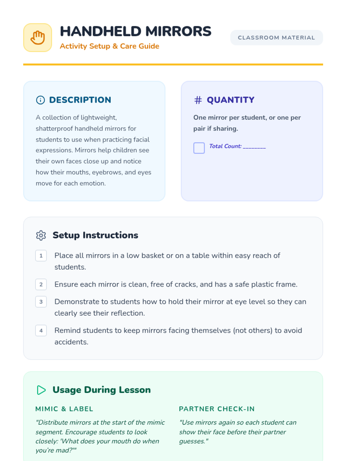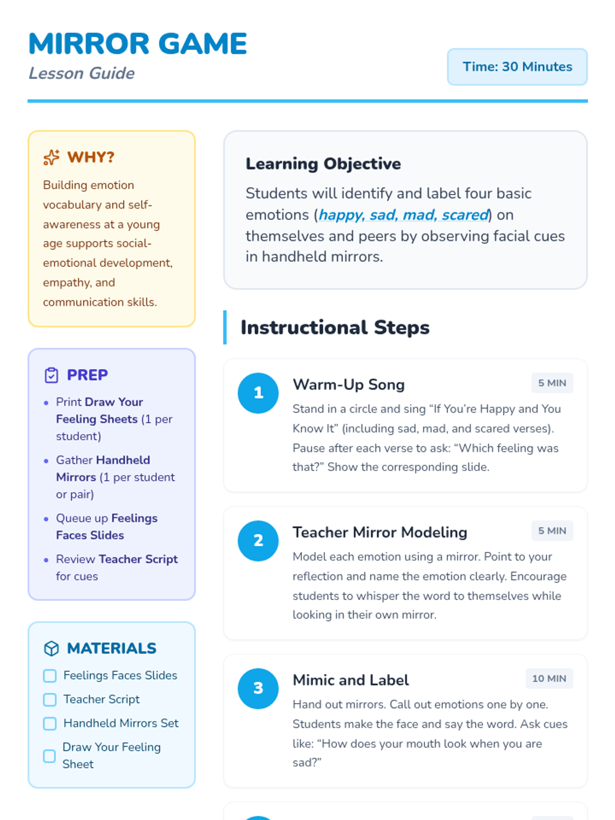 In this playful 30-minute Pre-K lesson, students explore four basic emotions—happy, sad, mad, scared—using handheld mirrors to identify and label feelings on themselves and peers. This foundational self-awareness activity strengthens vocabulary, social-emotional skills, and peer connection.