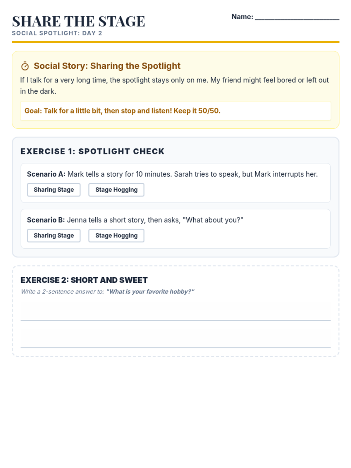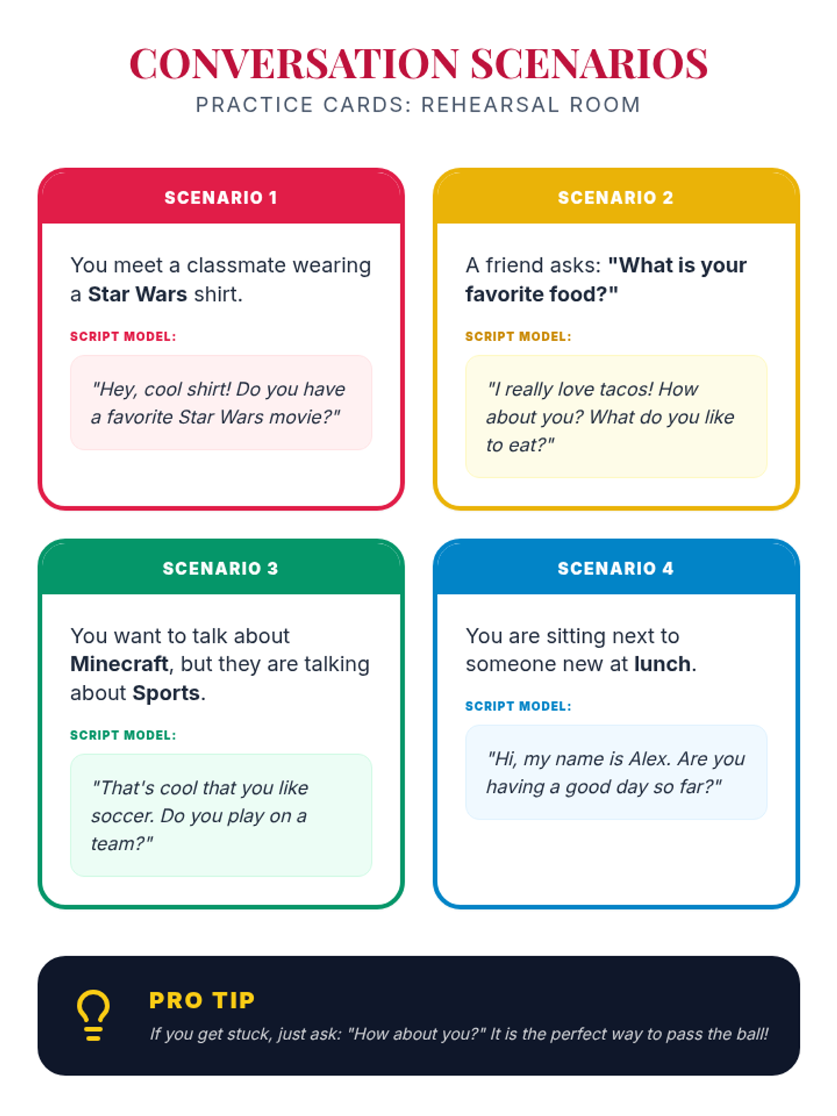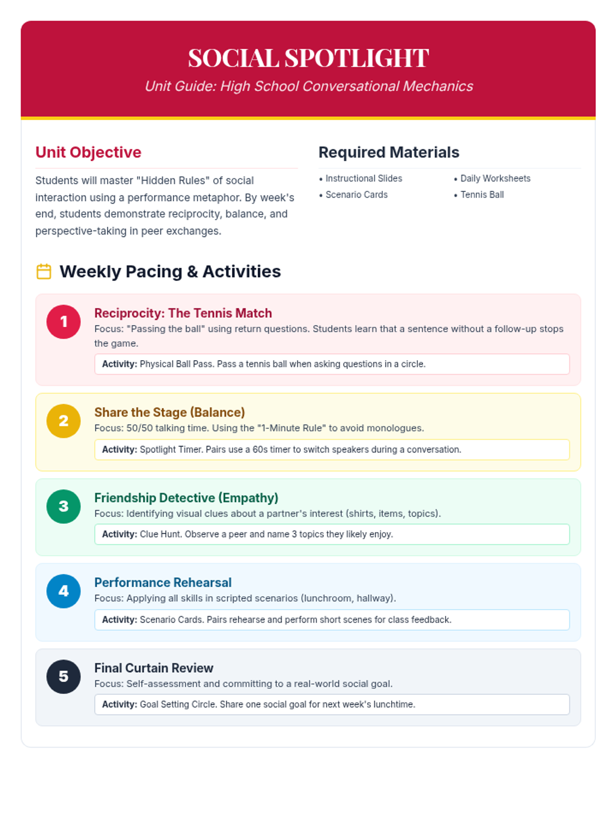 Guided practice sessions using role-play cards to simulate real-world social scenarios.