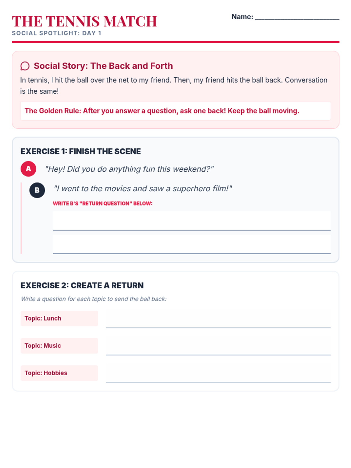 Introduction to reciprocal conversations using the metaphor of a tennis match to visualize the 'back-and-forth' flow.