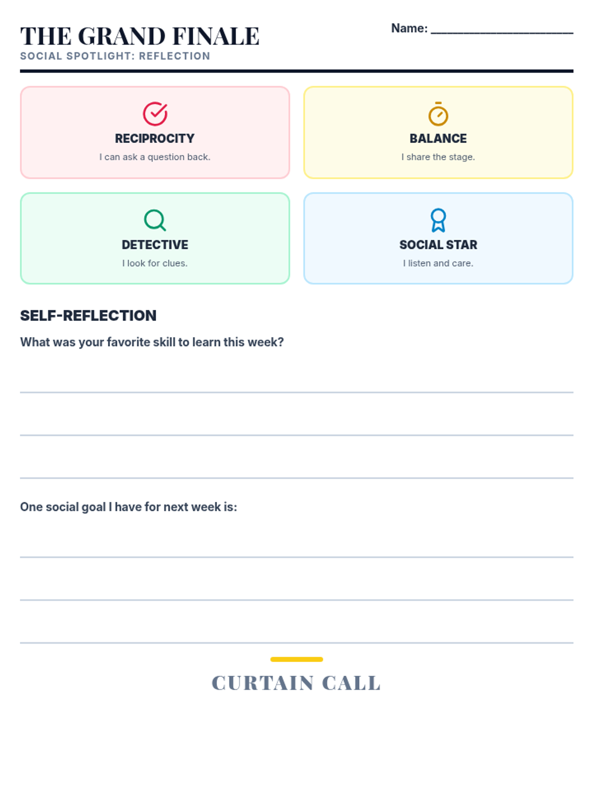 Review of all skills and a final reflection on social growth through the unit.
