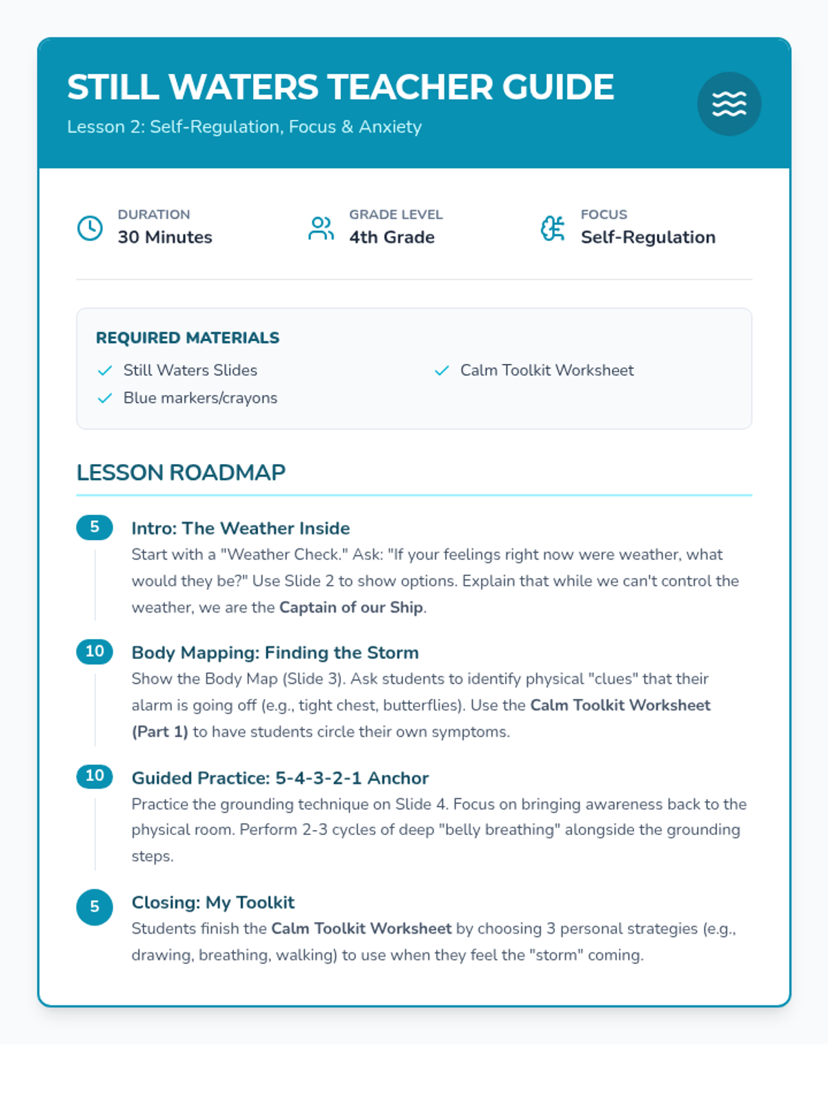 Focuses on identifying physical signs of anxiety, practicing self-regulation techniques, and building tools for sustained focus.