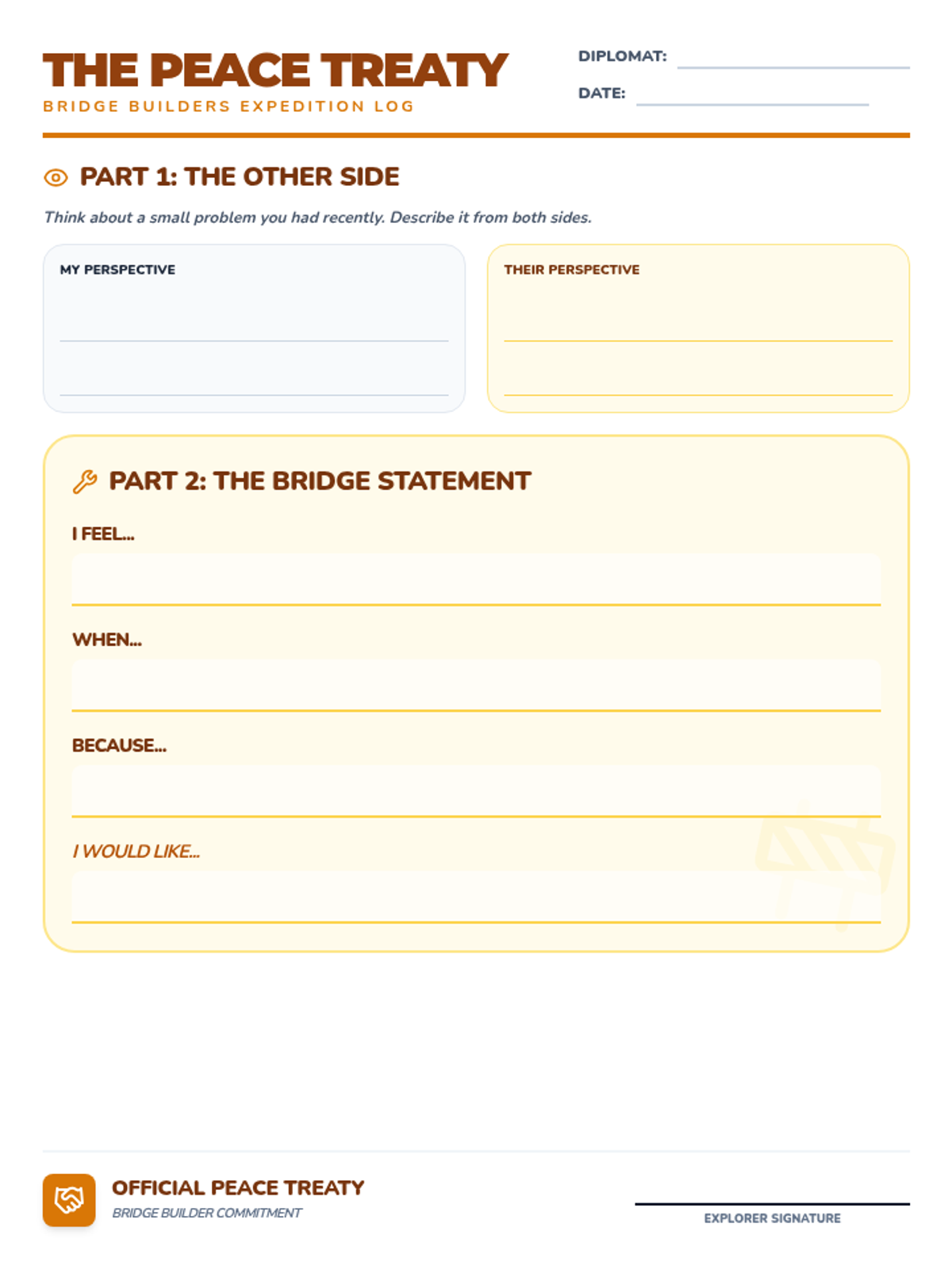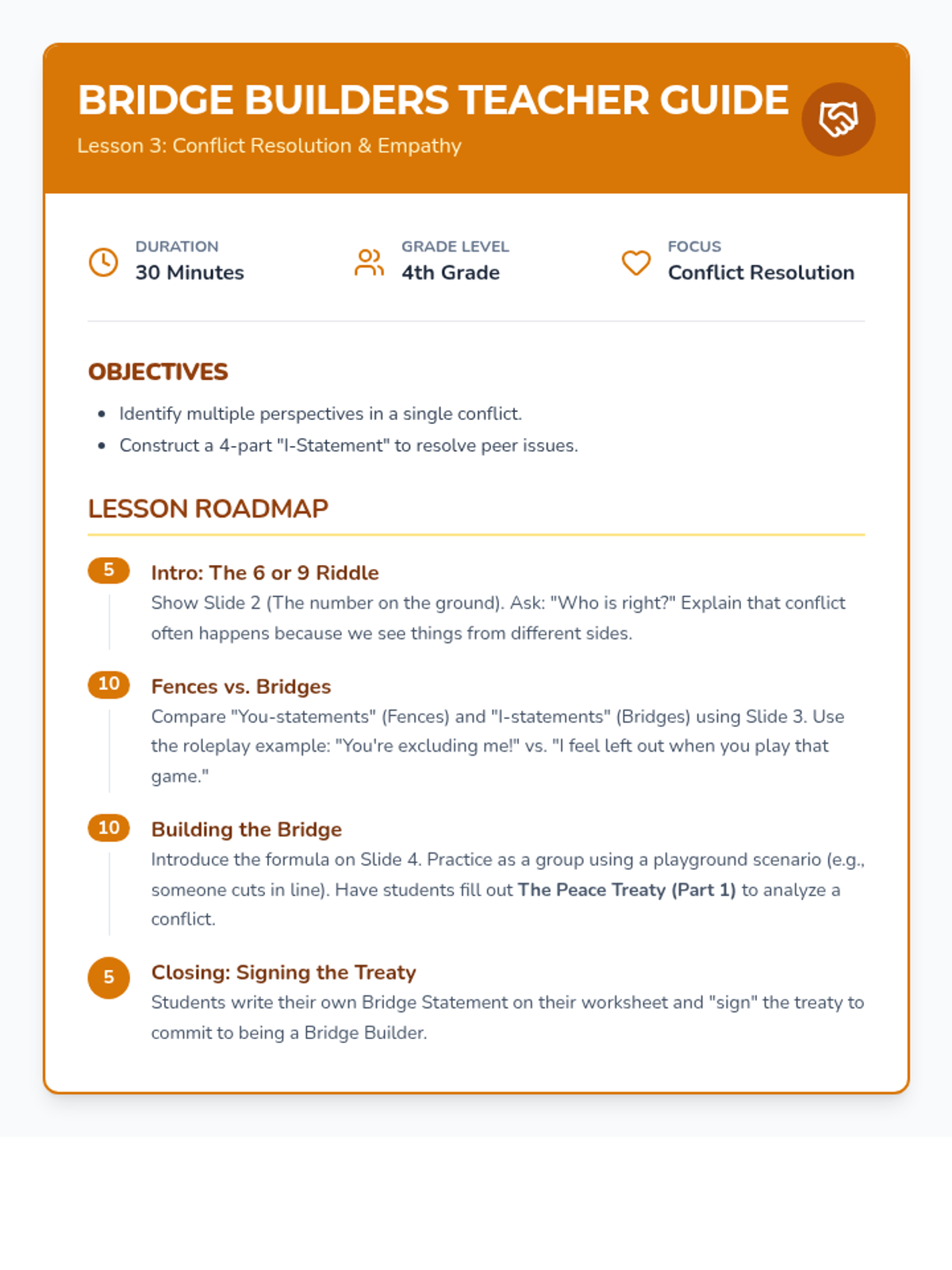 Teaches students empathy through perspective-taking and provides a framework for resolving peer conflicts peacefully.