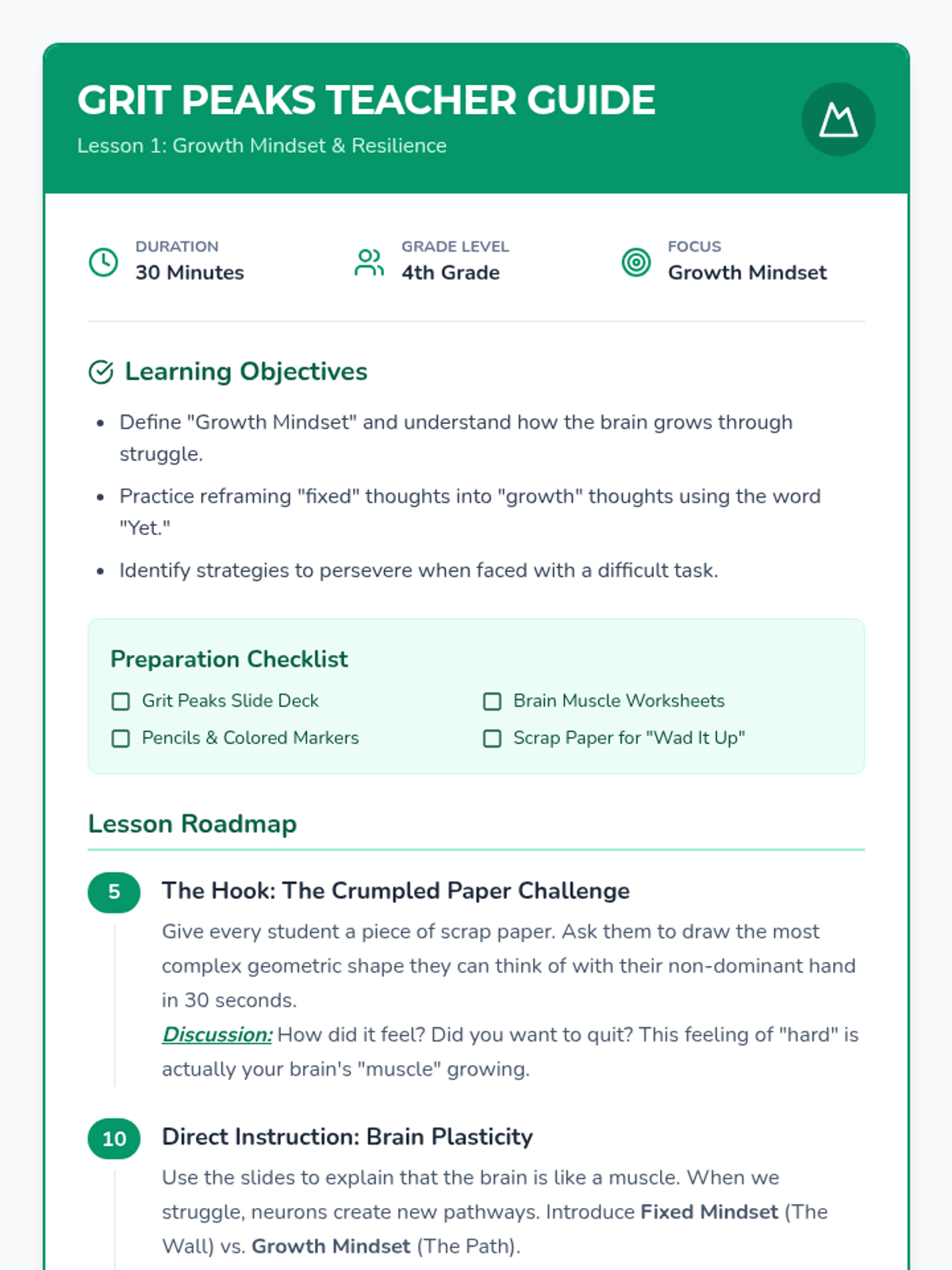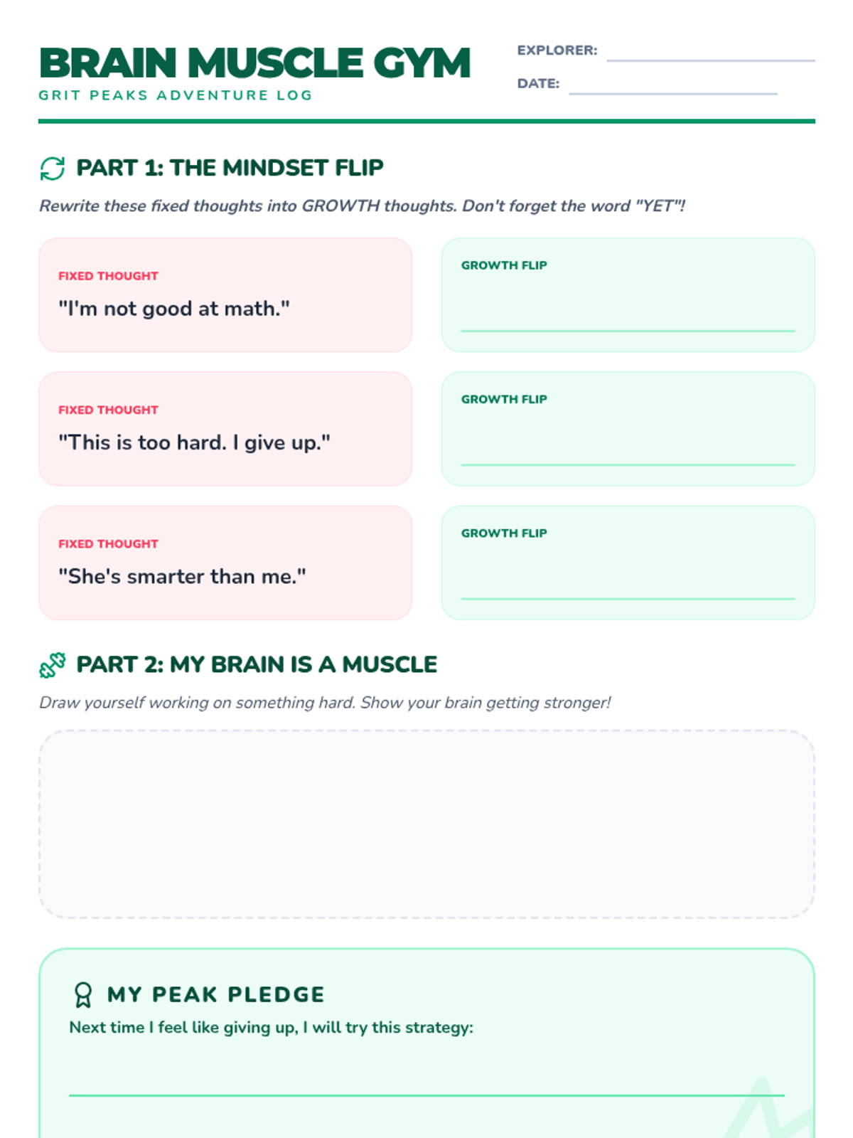 Students explore the difference between fixed and growth mindsets, learning how effort and persistence grow their brain's capacity through the concept of 'Growth Roots.'