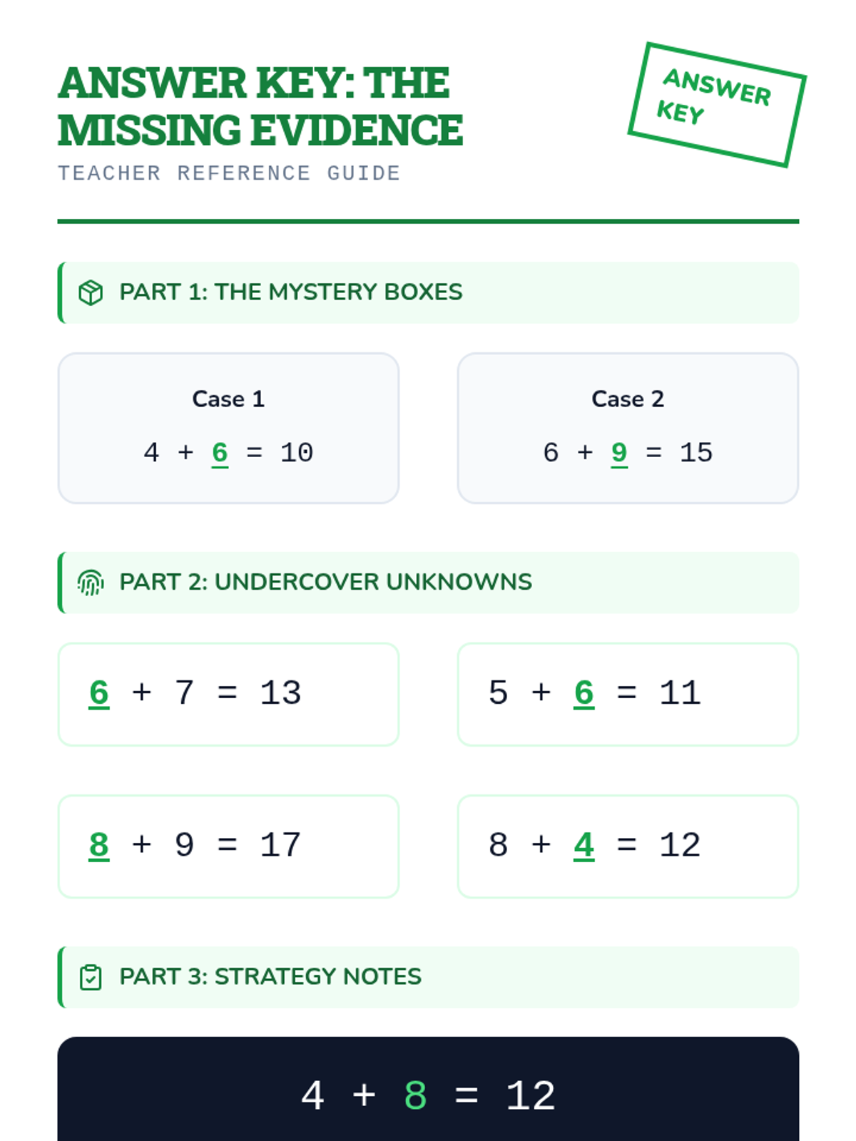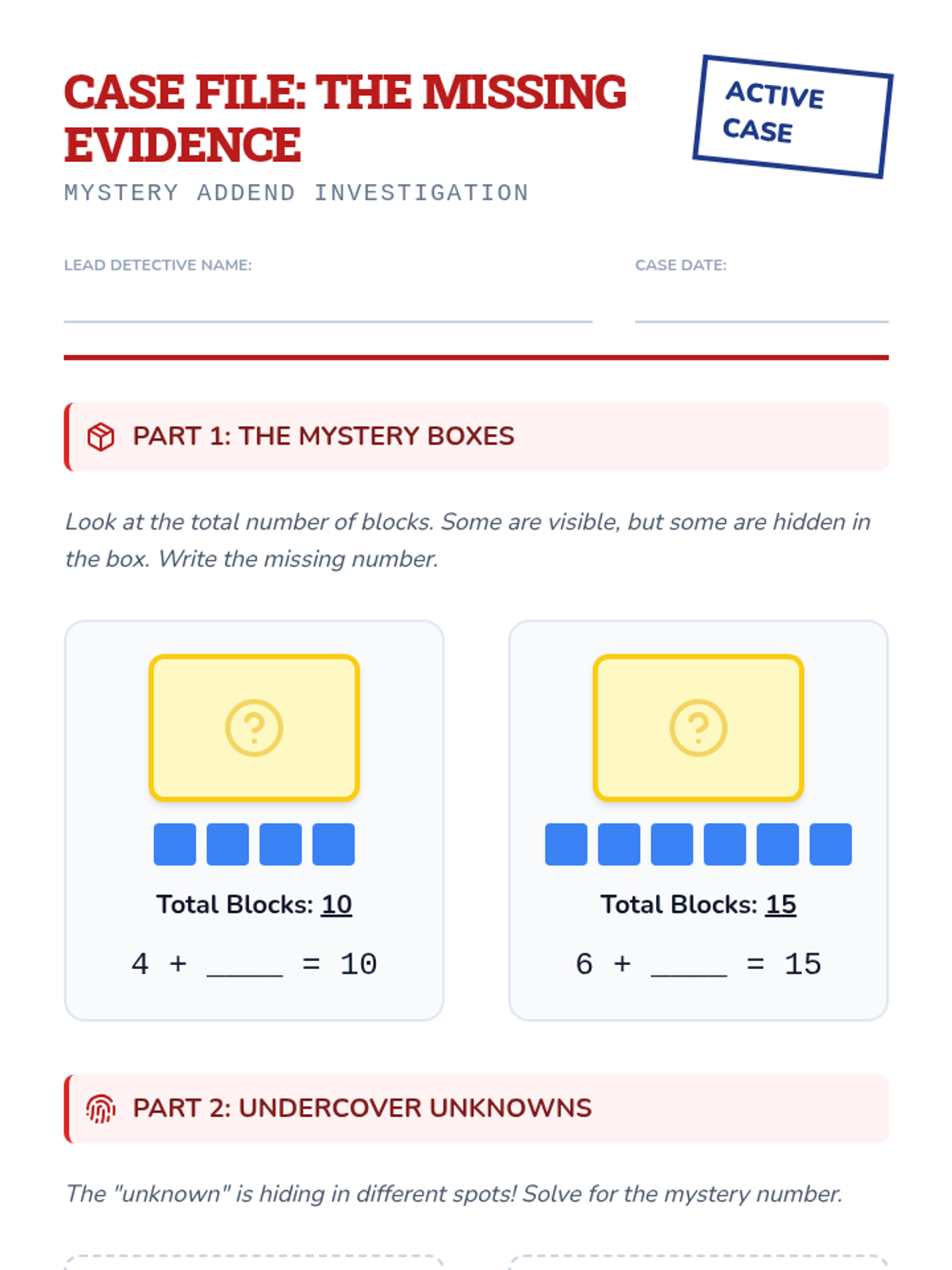 Students work with part-part-whole models to identify missing addends in equations. They discover strategies like counting up or subtracting the known part from the whole to find the mystery number.