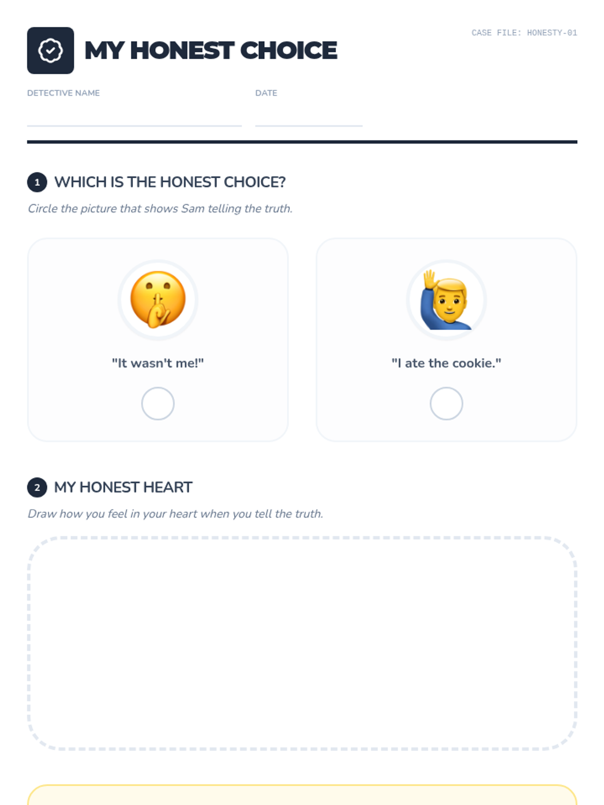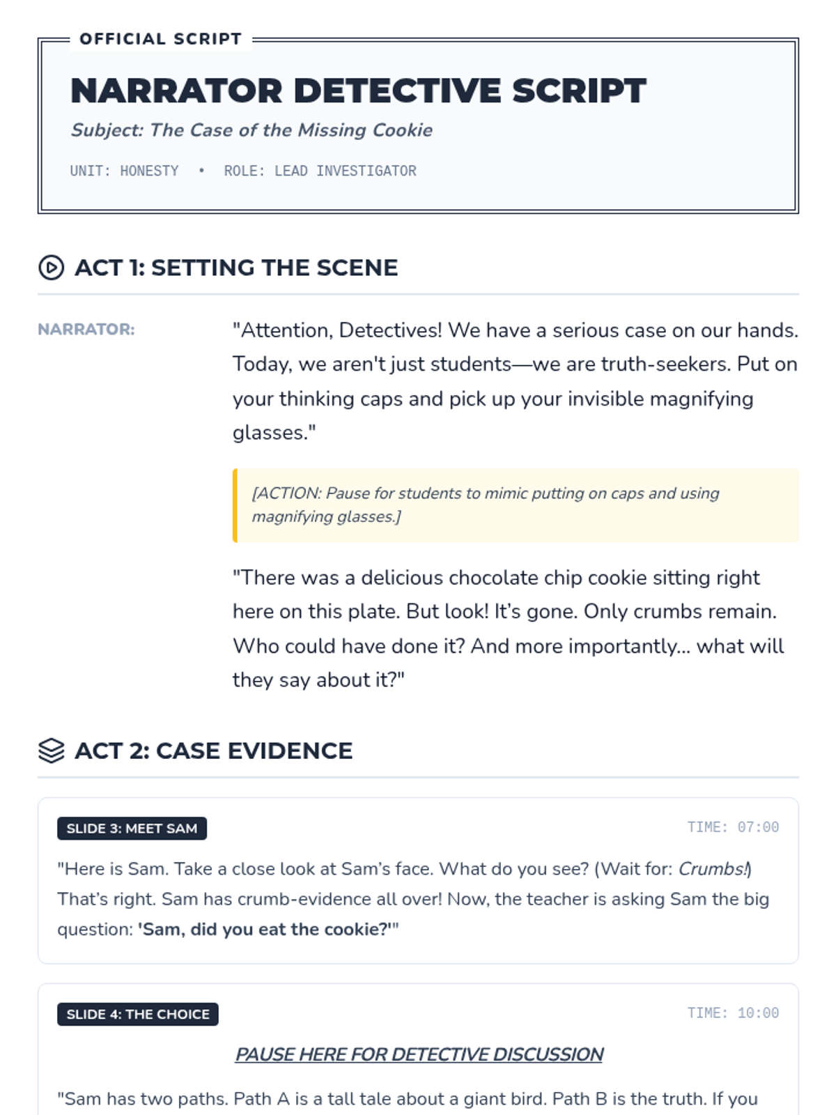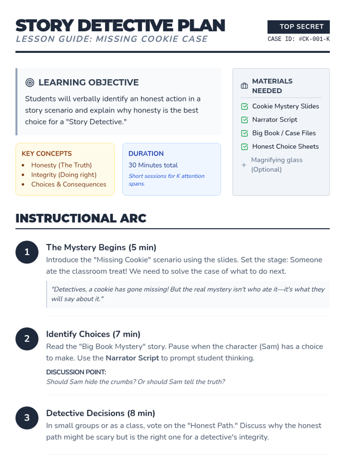 A Kindergarten lesson focused on honesty through a detective-themed mystery story. Students analyze character choices, practice integrity, and reflect on why telling the truth is important.