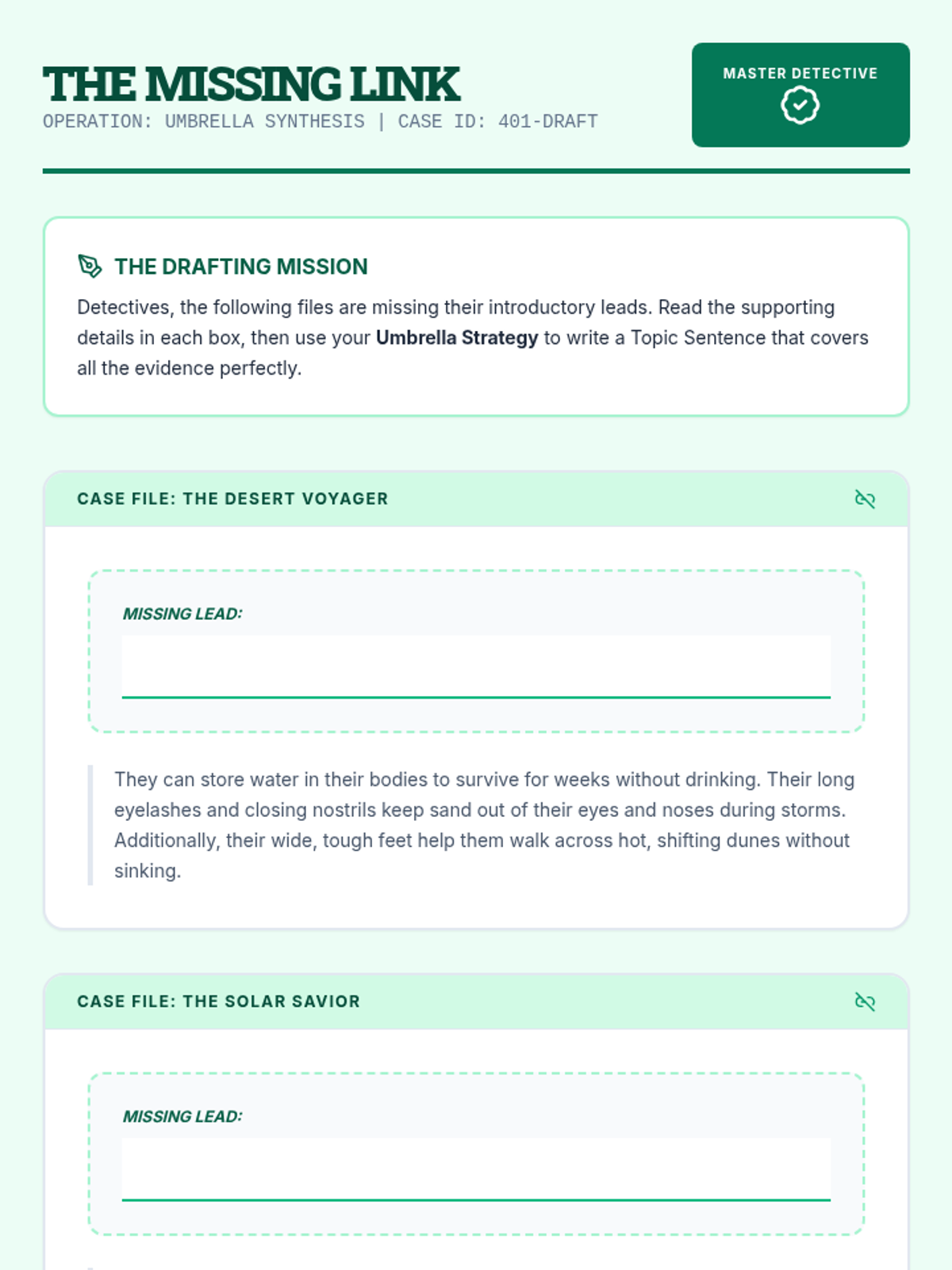 Students synthesize provided details to write effective topic sentences for paragraphs missing their introductory lead.