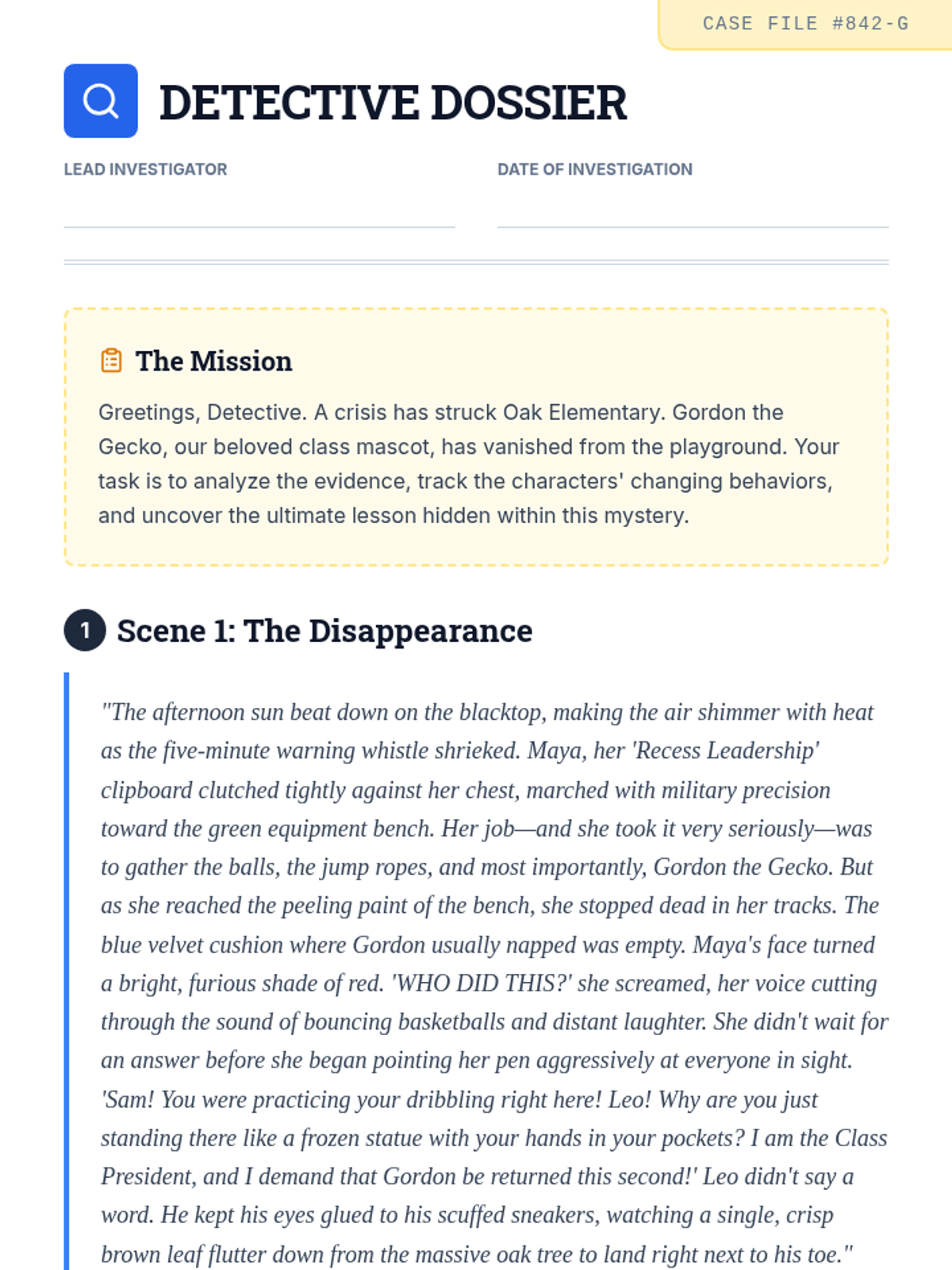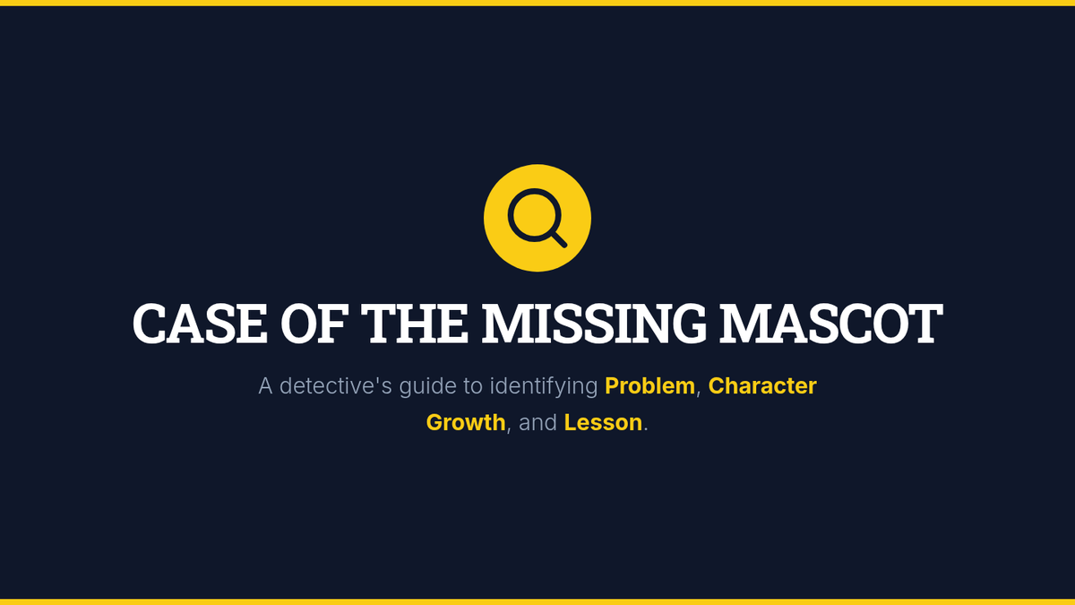 A mystery-themed reading comprehension lesson where students solve the 'Case of the Missing Mascot' to identify problems, solutions, character growth, and themes.