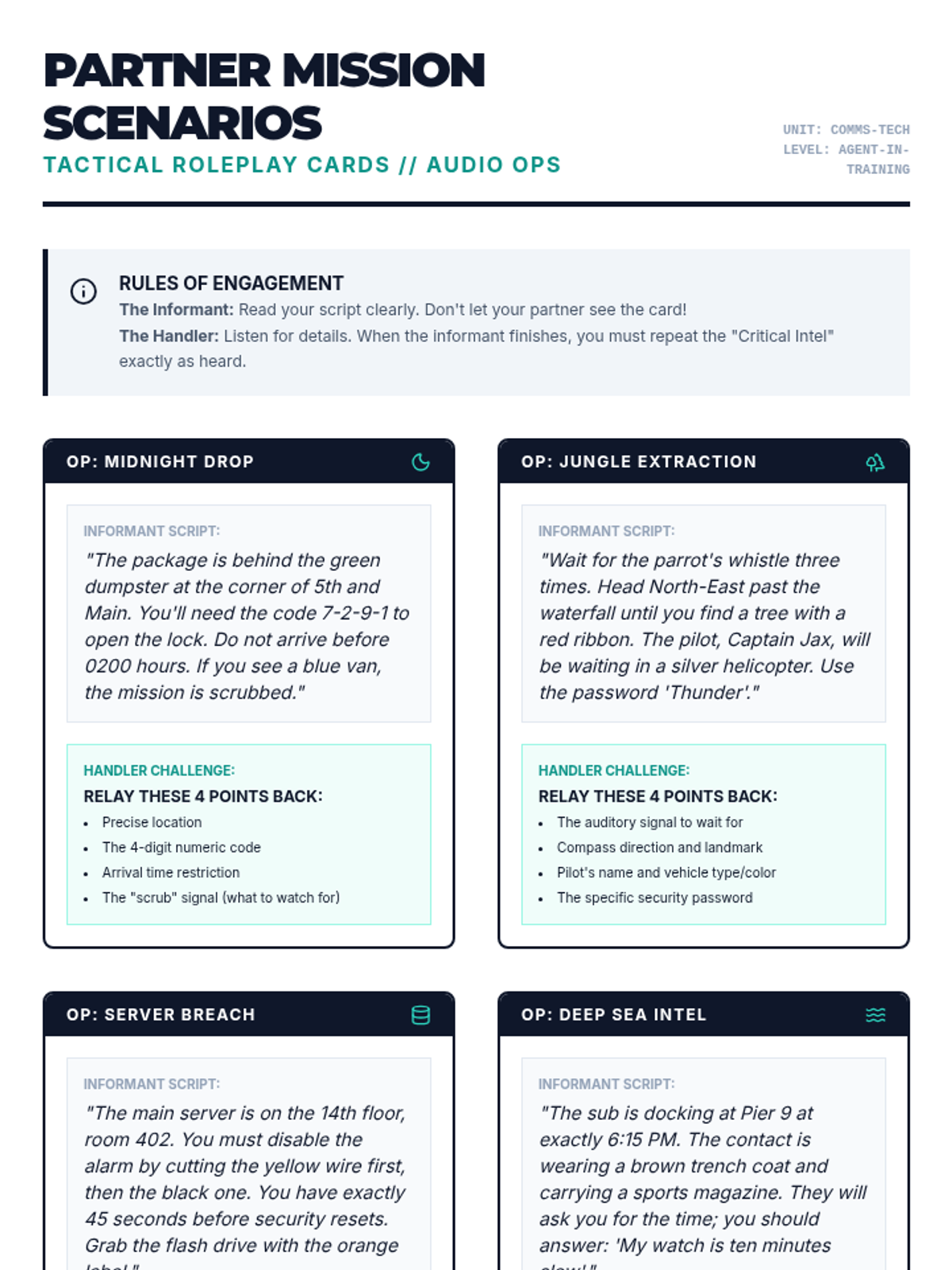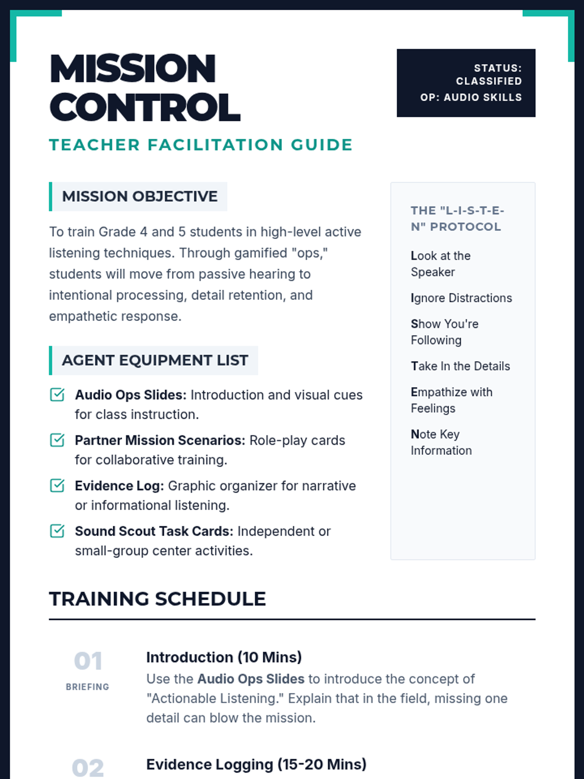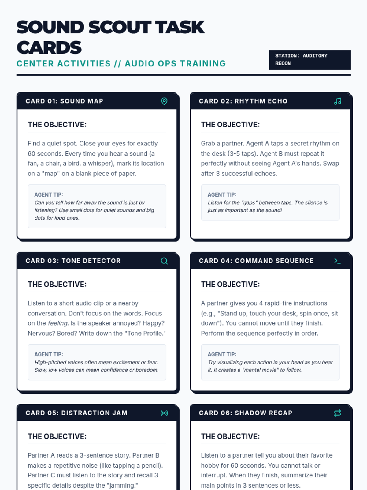 A high-energy, hands-on lesson designed for 4th and 5th graders to master active listening through gamified scenarios, detective-themed organizers, and center-based task cards. Students take on the roles of special agents to practice focus, empathy, and detail-oriented listening.