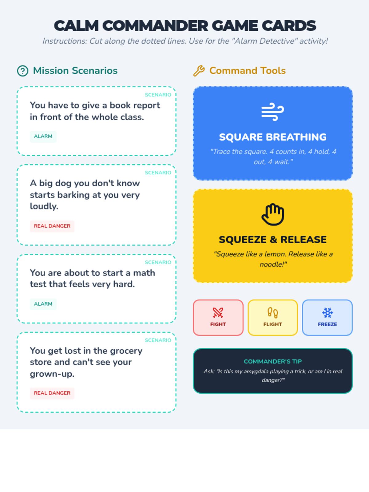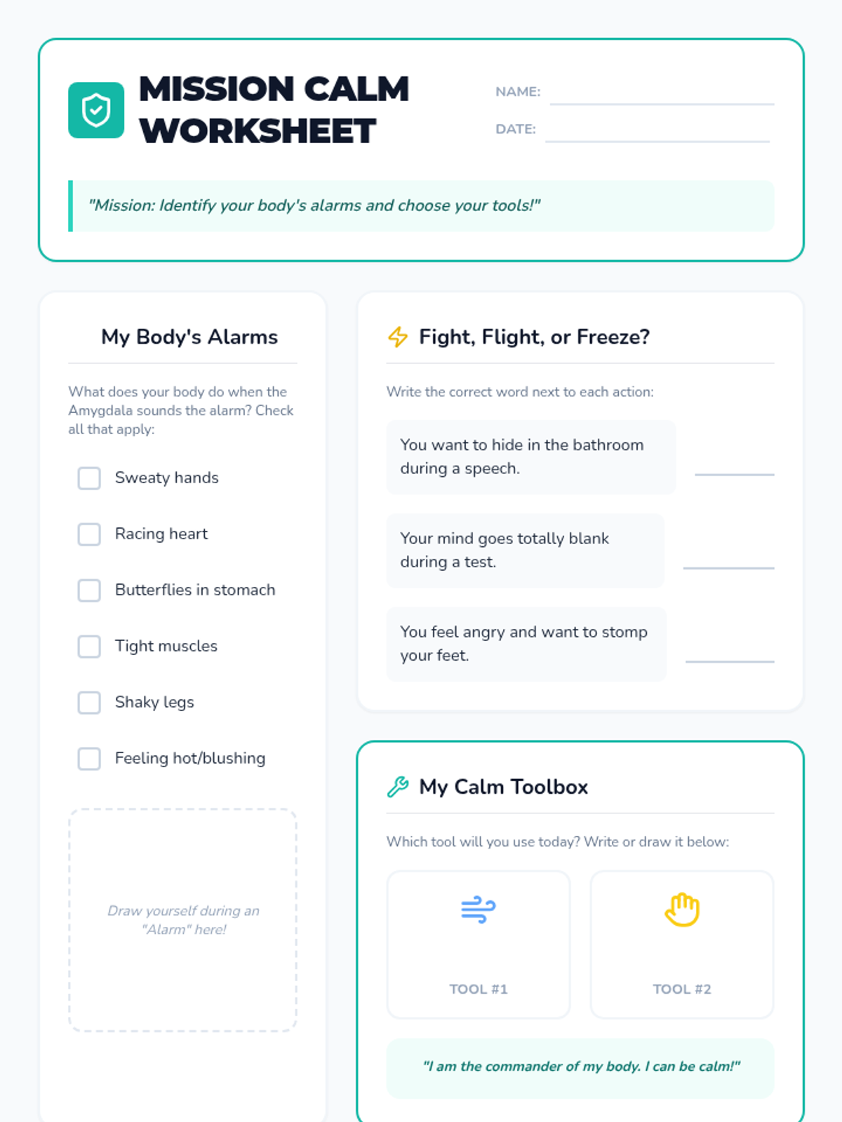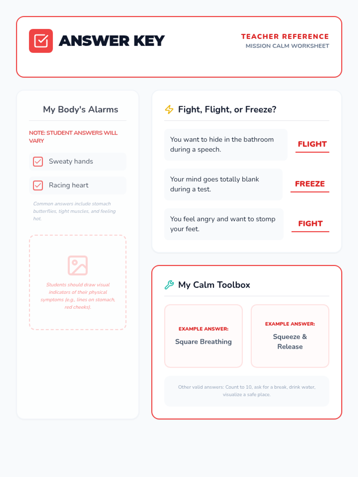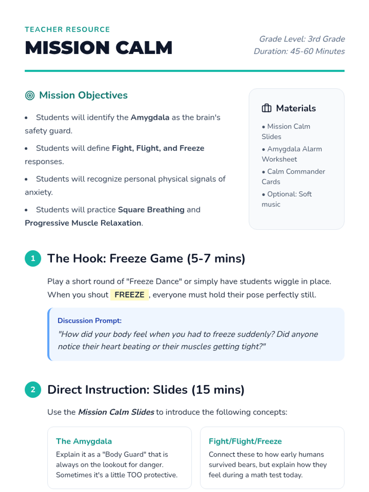 A comprehensive lesson for third graders on understanding anxiety through the 'fight, flight, freeze' response and practicing relaxation techniques.