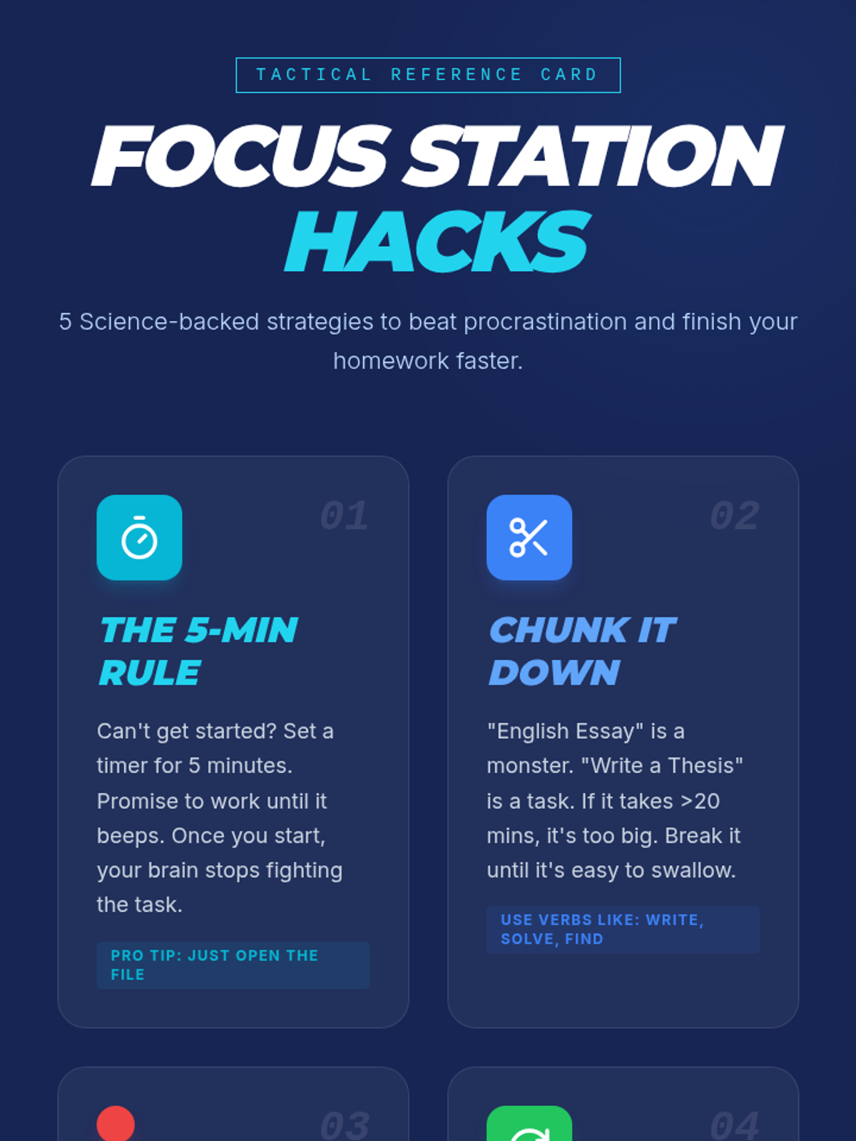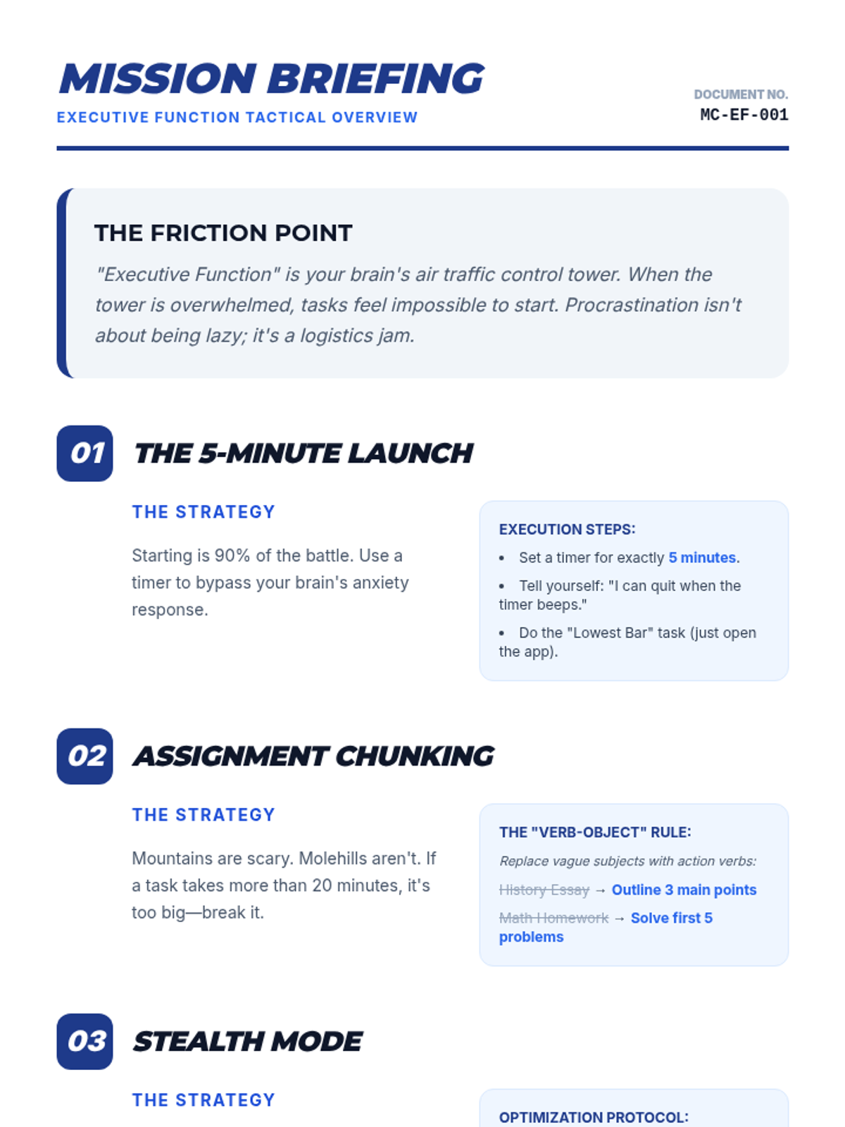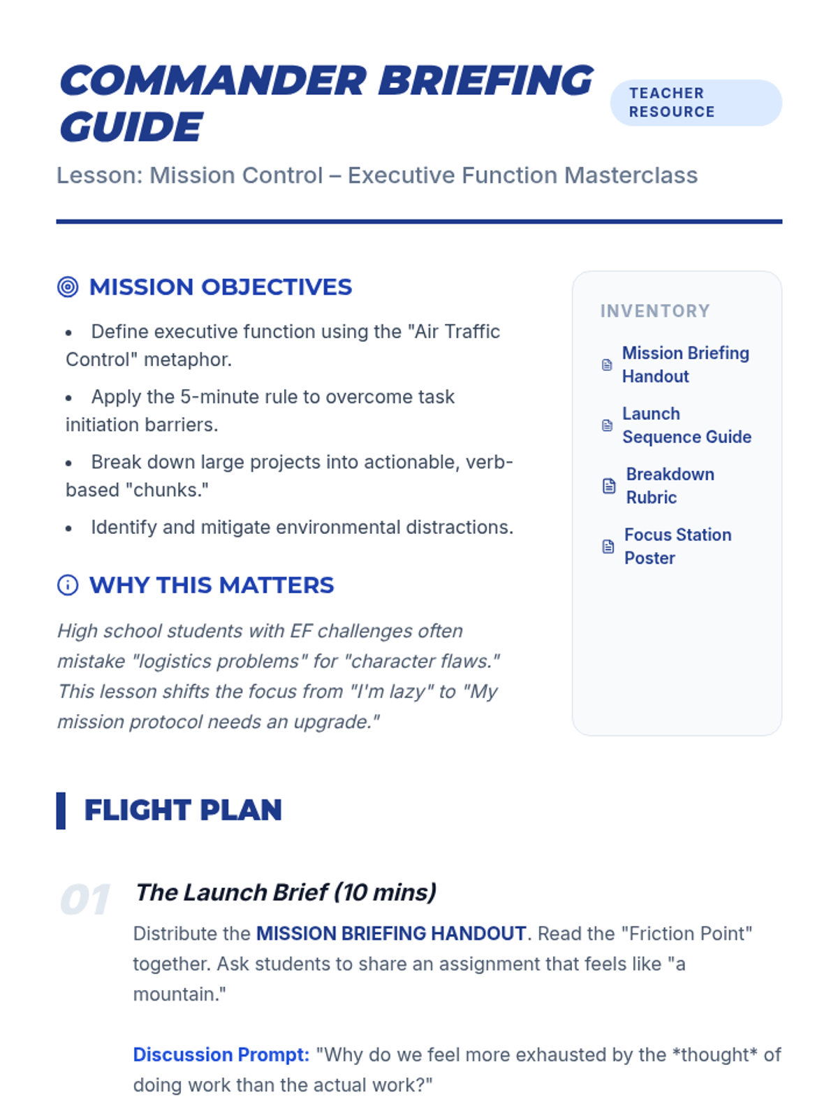 A lesson designed to empower high school students with executive function challenges to master homework completion through task chunking, distraction management, and effective initiation strategies.
