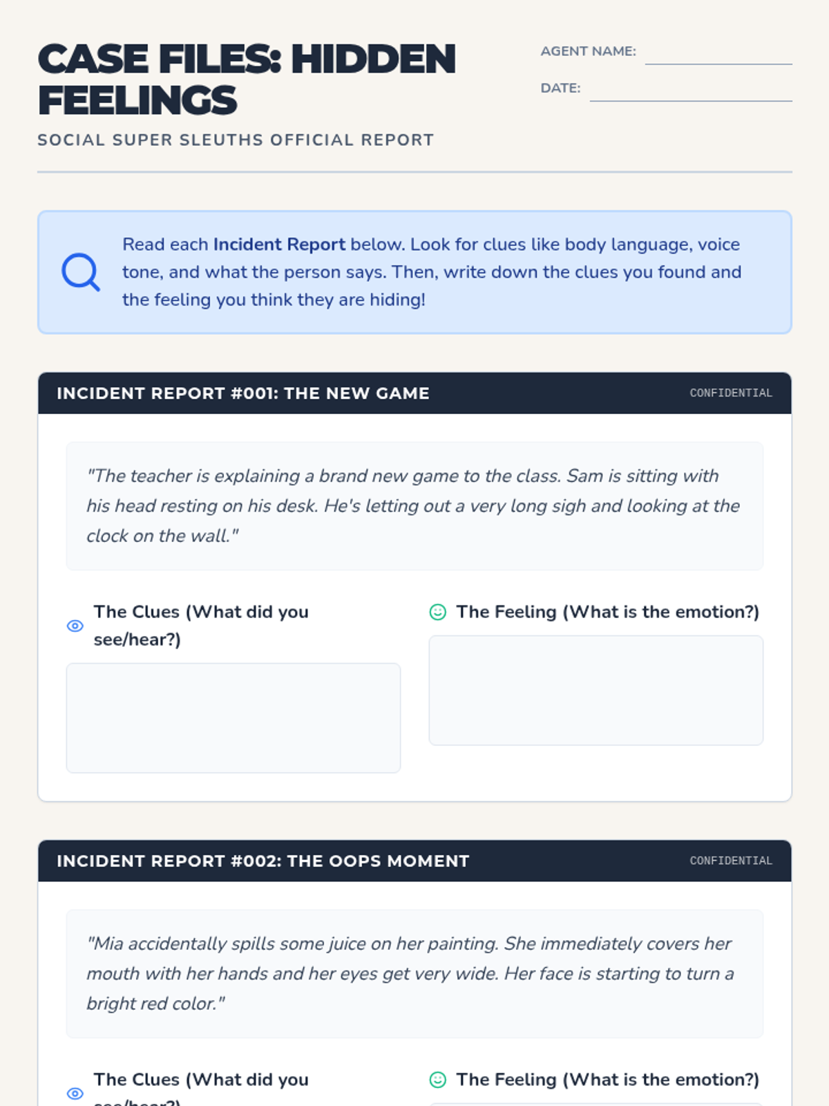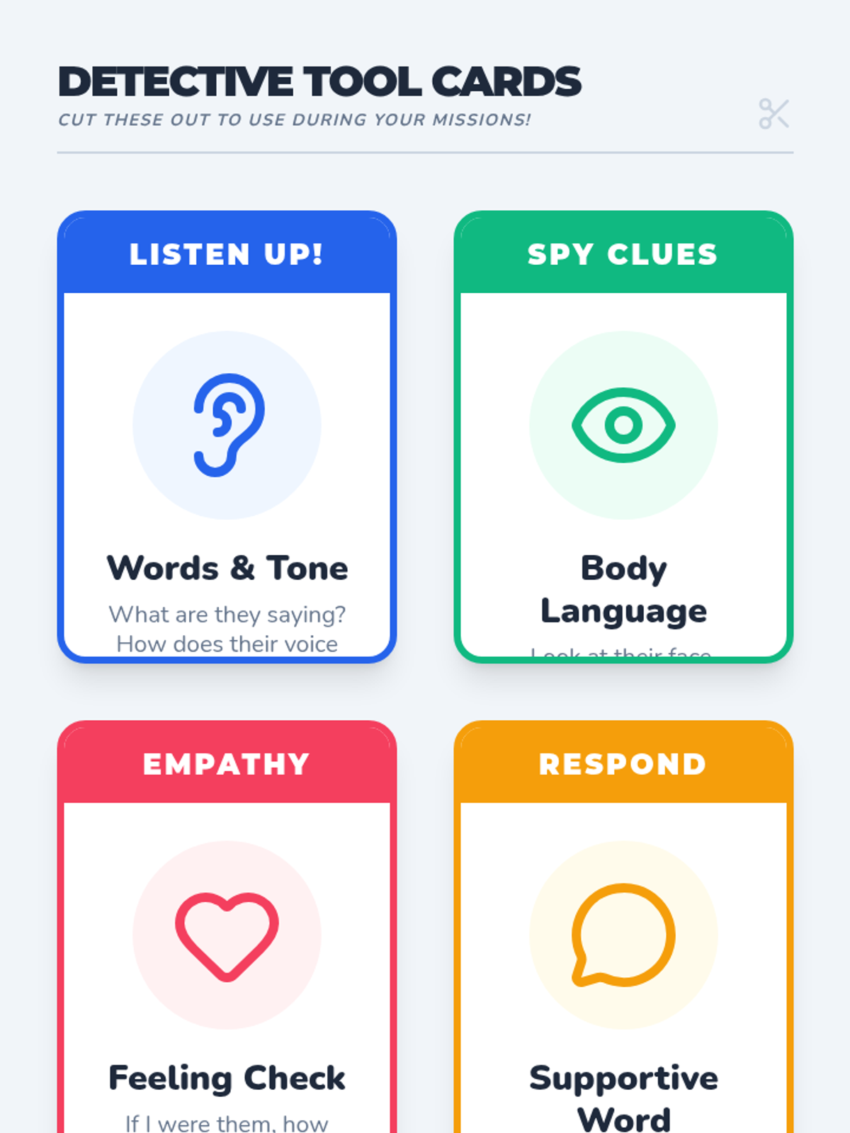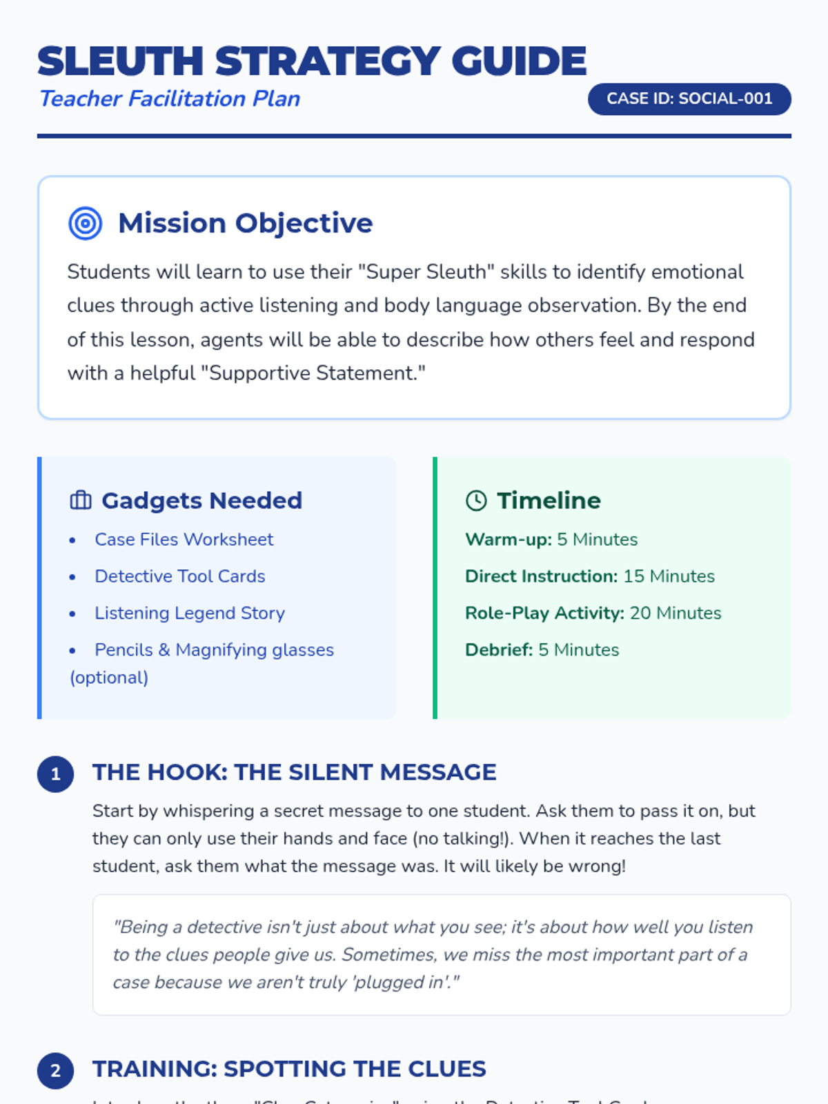 A comprehensive lesson on active listening and emotional intelligence, using a detective theme to help students identify social clues and respond with empathy.