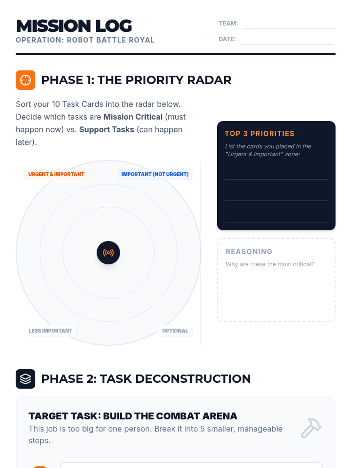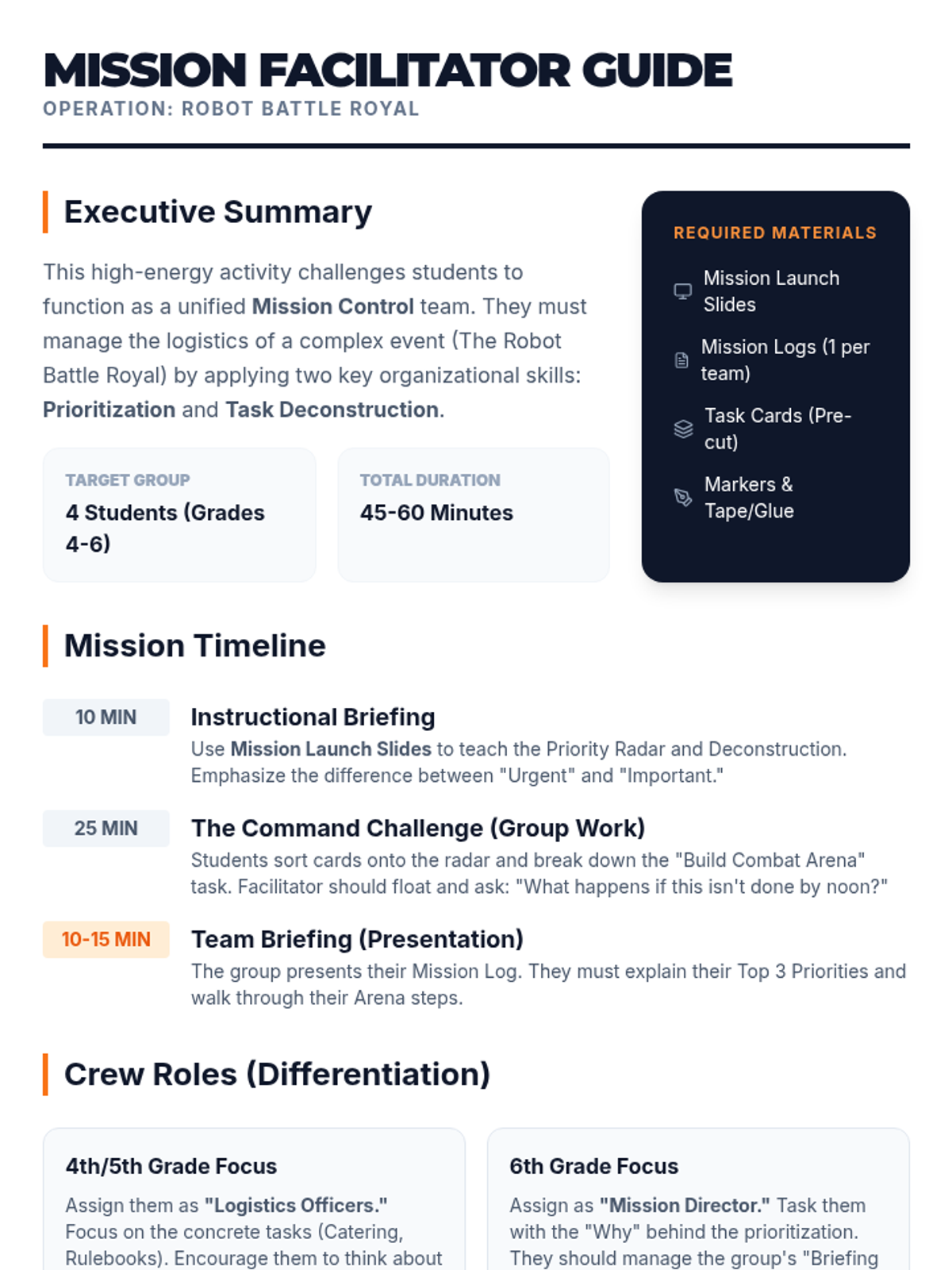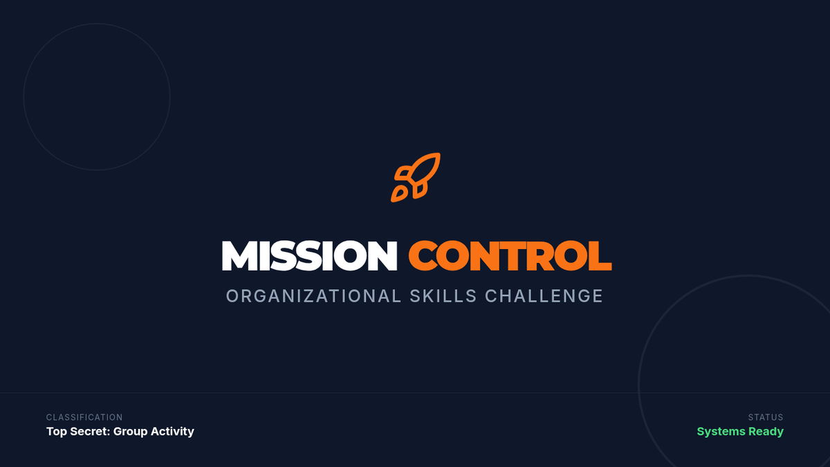 A high-energy cooperative challenge designed for a small group of elementary and middle school students to master prioritizing tasks and breaking down large assignments. Students work together as a 'Mission Control' team to plan a complex event.