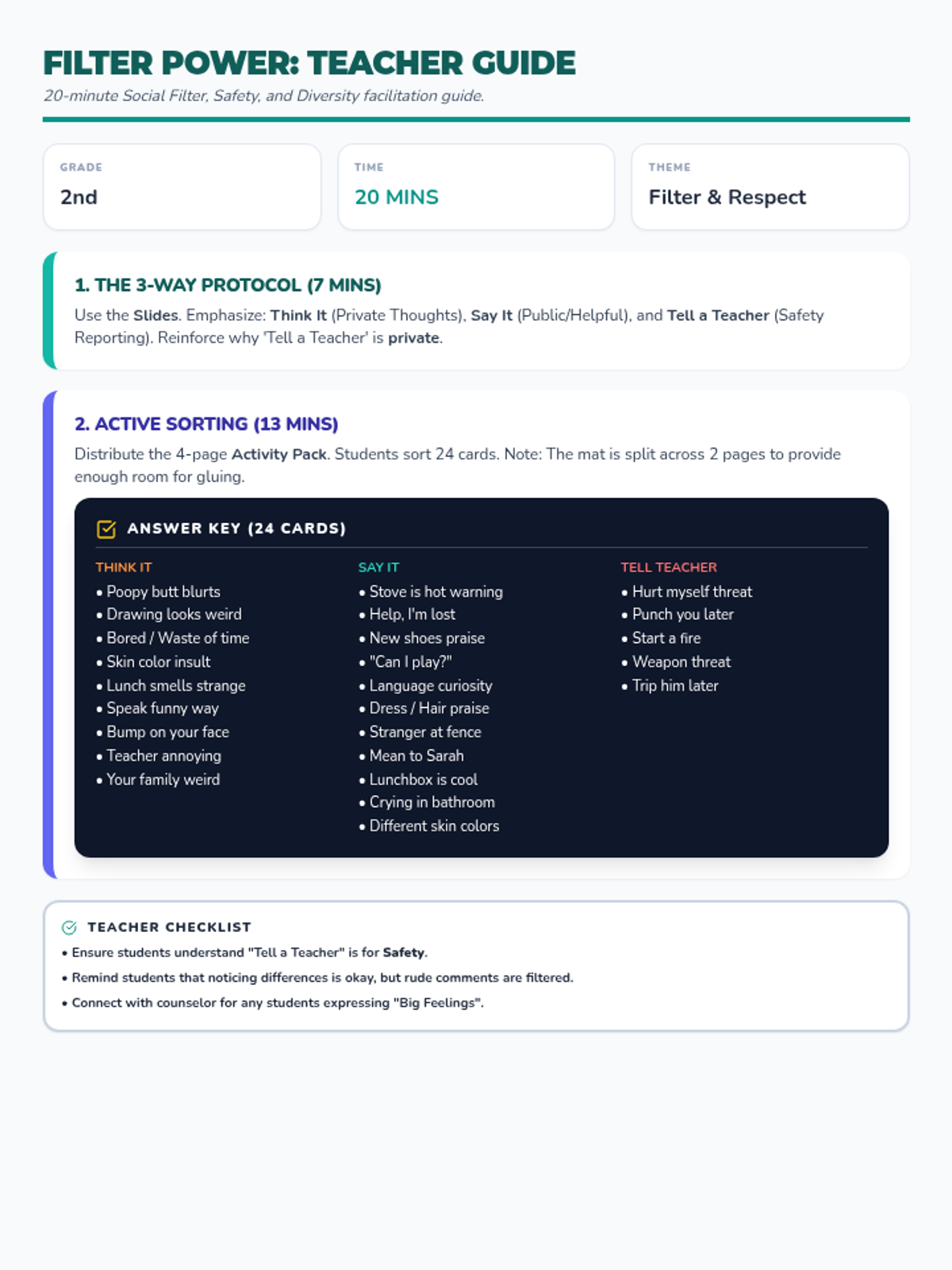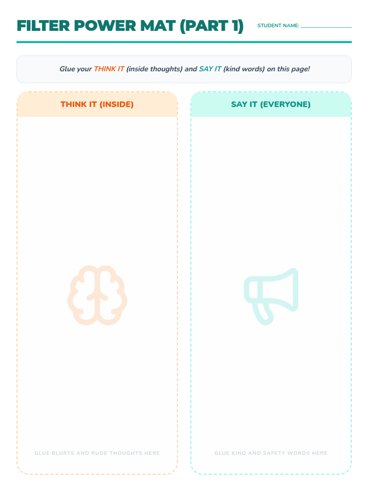 A comprehensive social-emotional learning lesson for second graders focused on the 'social filter'. Students learn to distinguish between urgent safety communication and internal thoughts that might be hurtful or inappropriate.