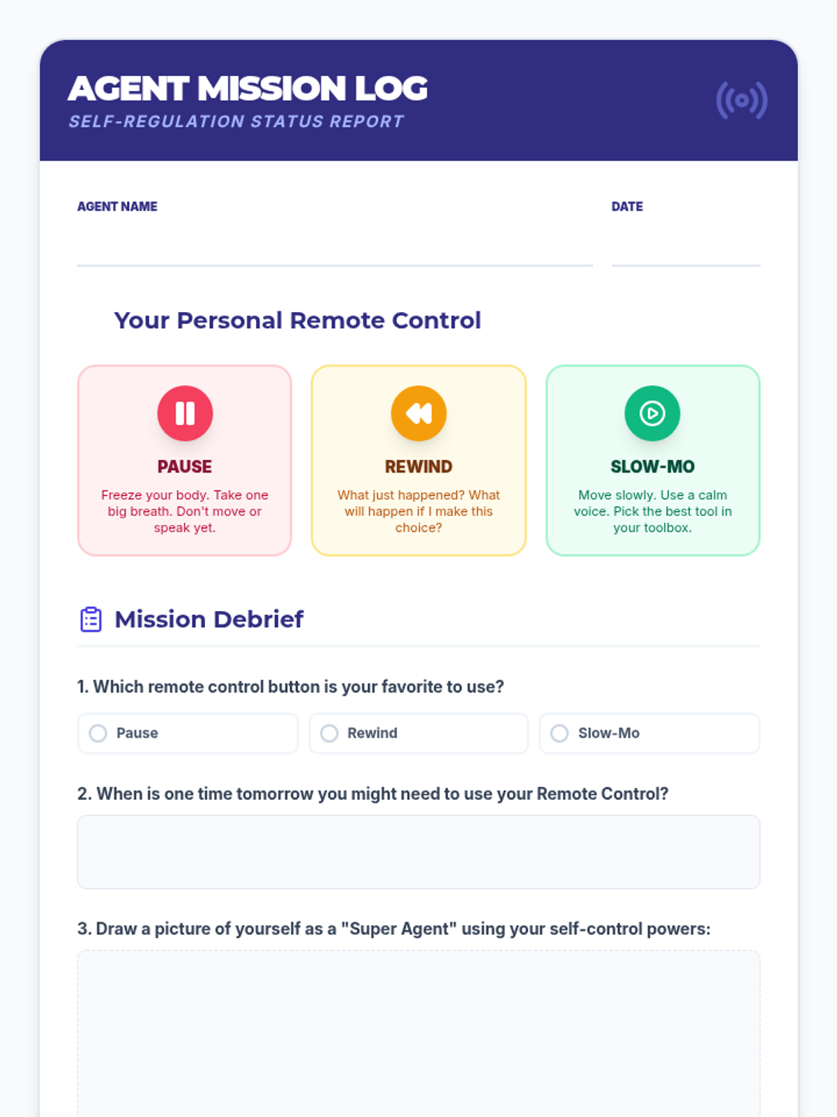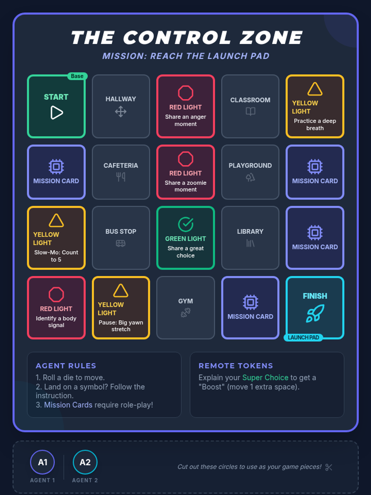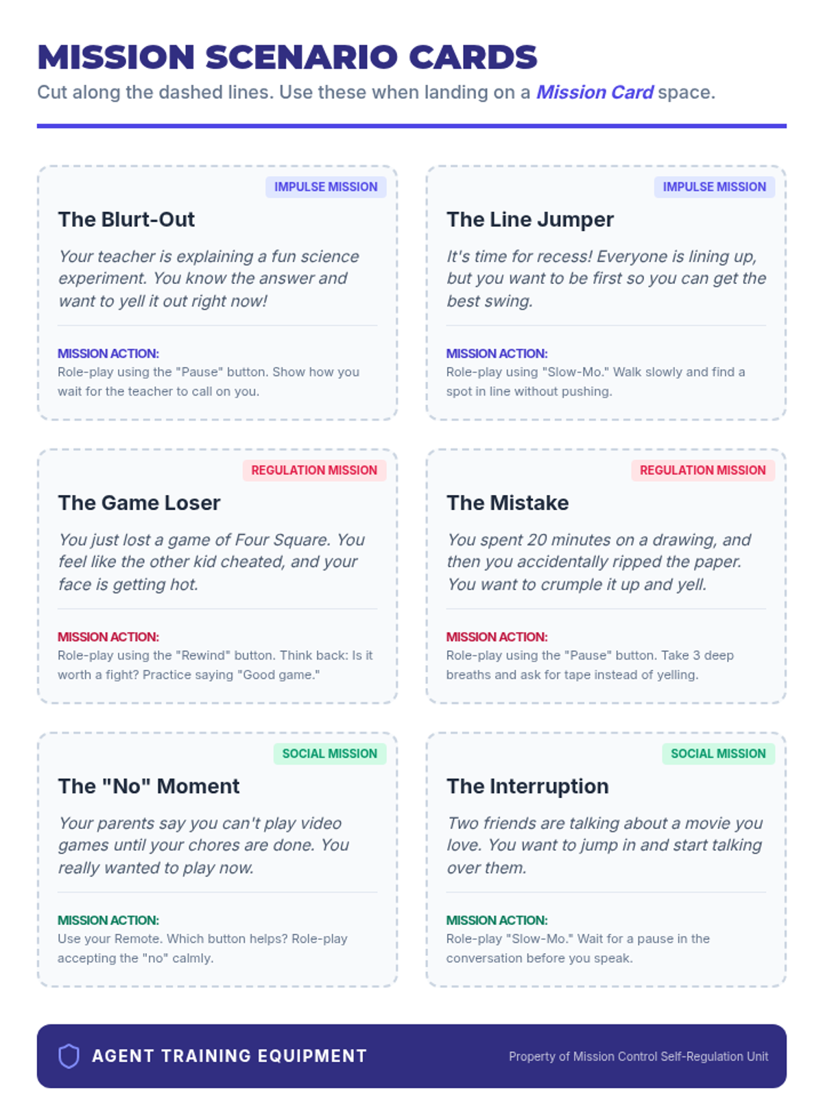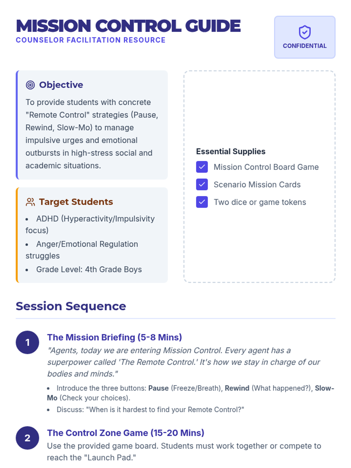 A specialized counseling session for 4th-grade boys focusing on impulse control and emotional regulation through a gamified 'Mission Control' theme. Students practice 'pausing' before acting and identifying 'red light' moments.