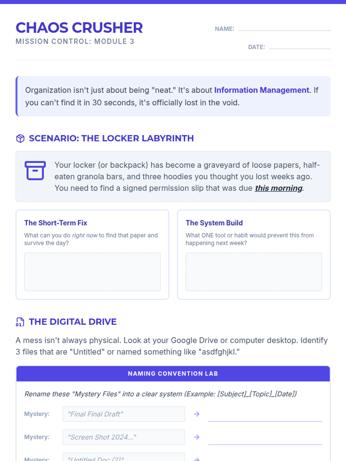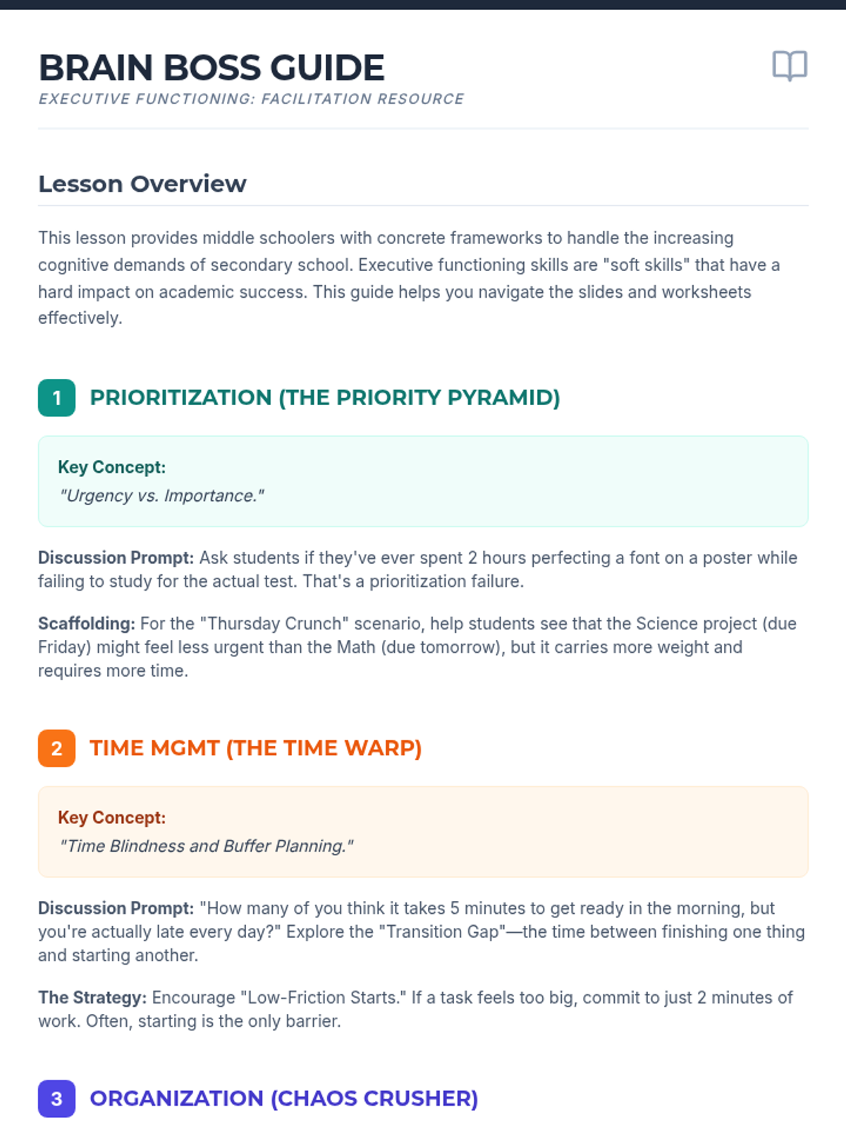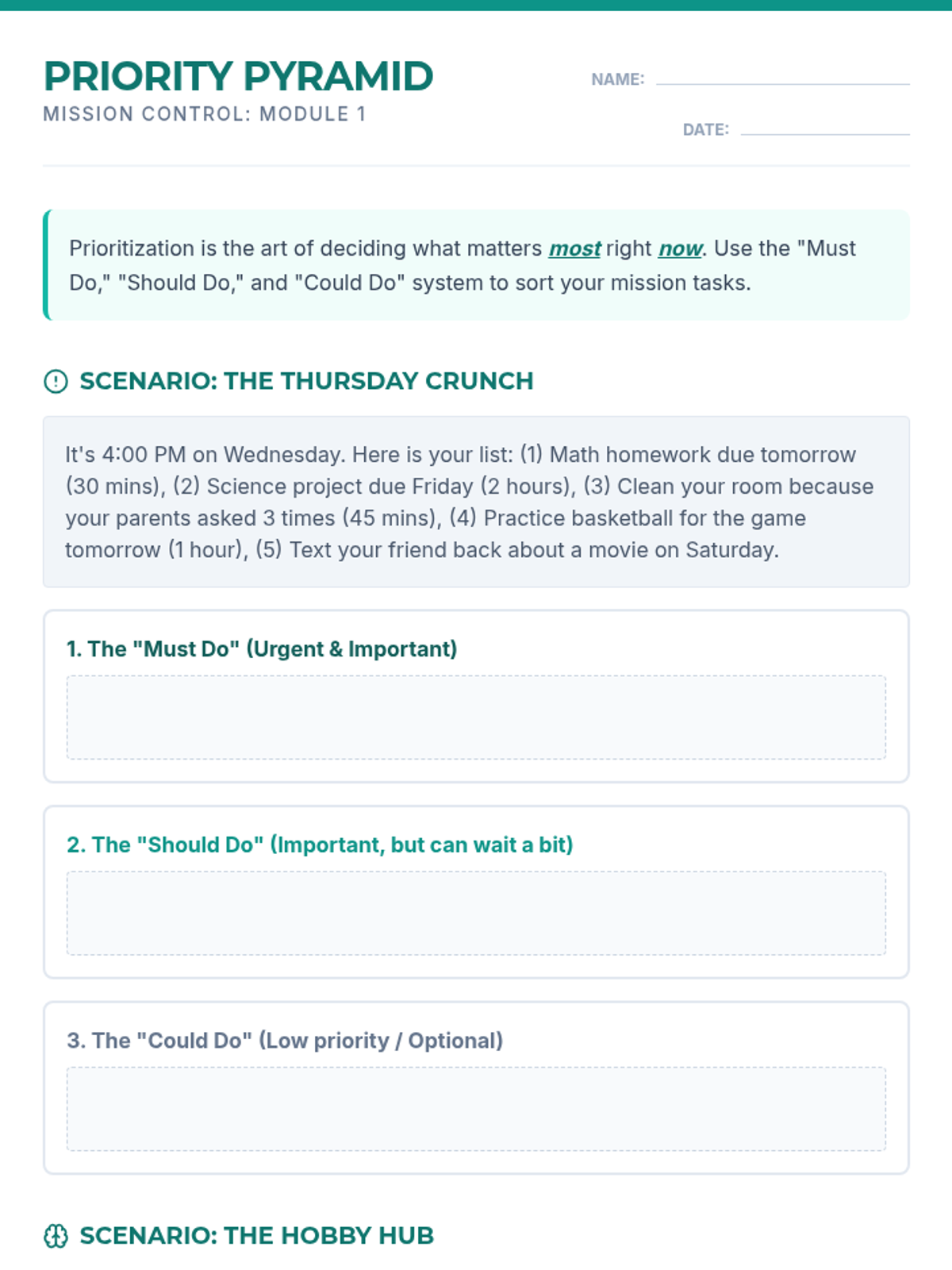 A comprehensive toolkit for middle schoolers to master prioritization, time management, and organization through realistic scenarios and practical strategies.