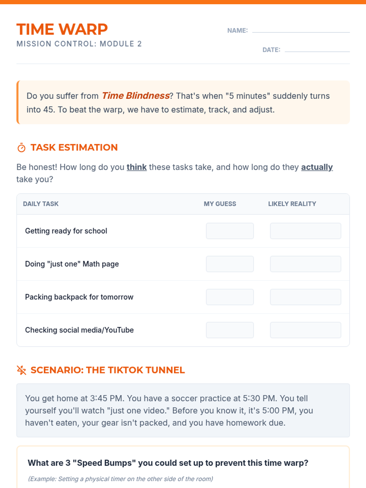 A 5-page workbook unit focused on strengthening executive functioning and planning skills for teenagers, using a 'Command Center' technical manual theme.